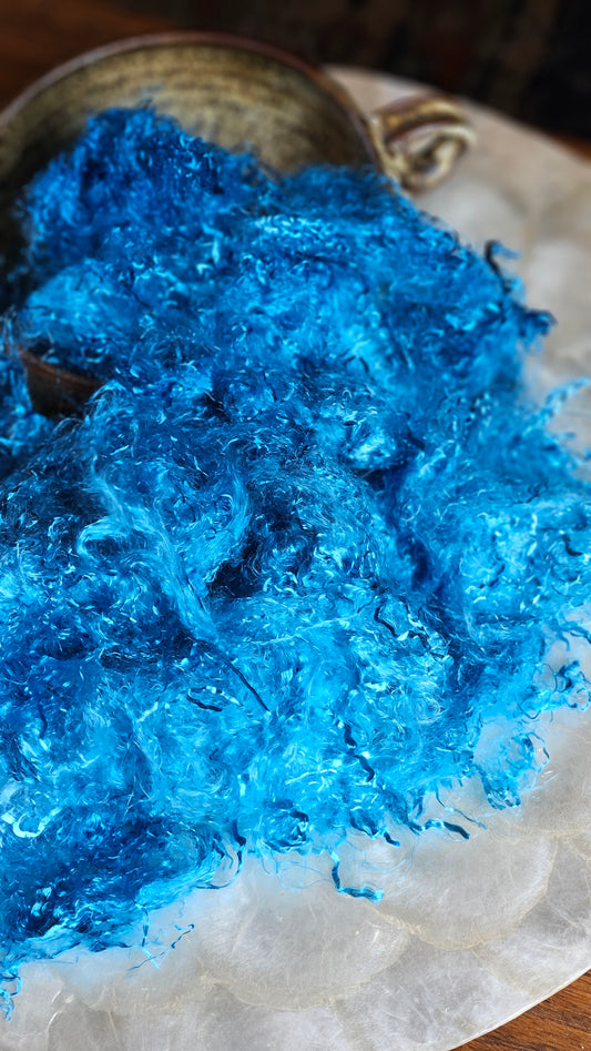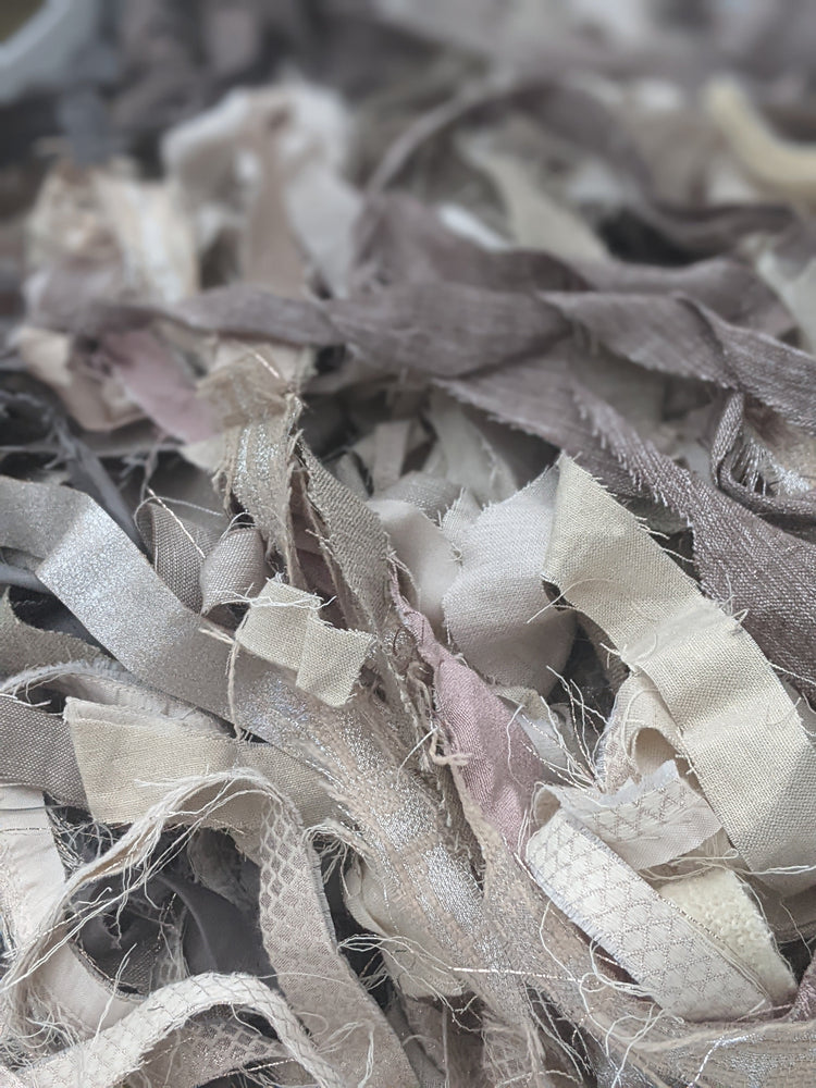 Unique textures to use in your weavings - including recycled hand-cut ribbons, saori-compatible bobbins of textured yarns, rare American upholstery selvage, and (coming soon) braids of textured warp thread for weaving.