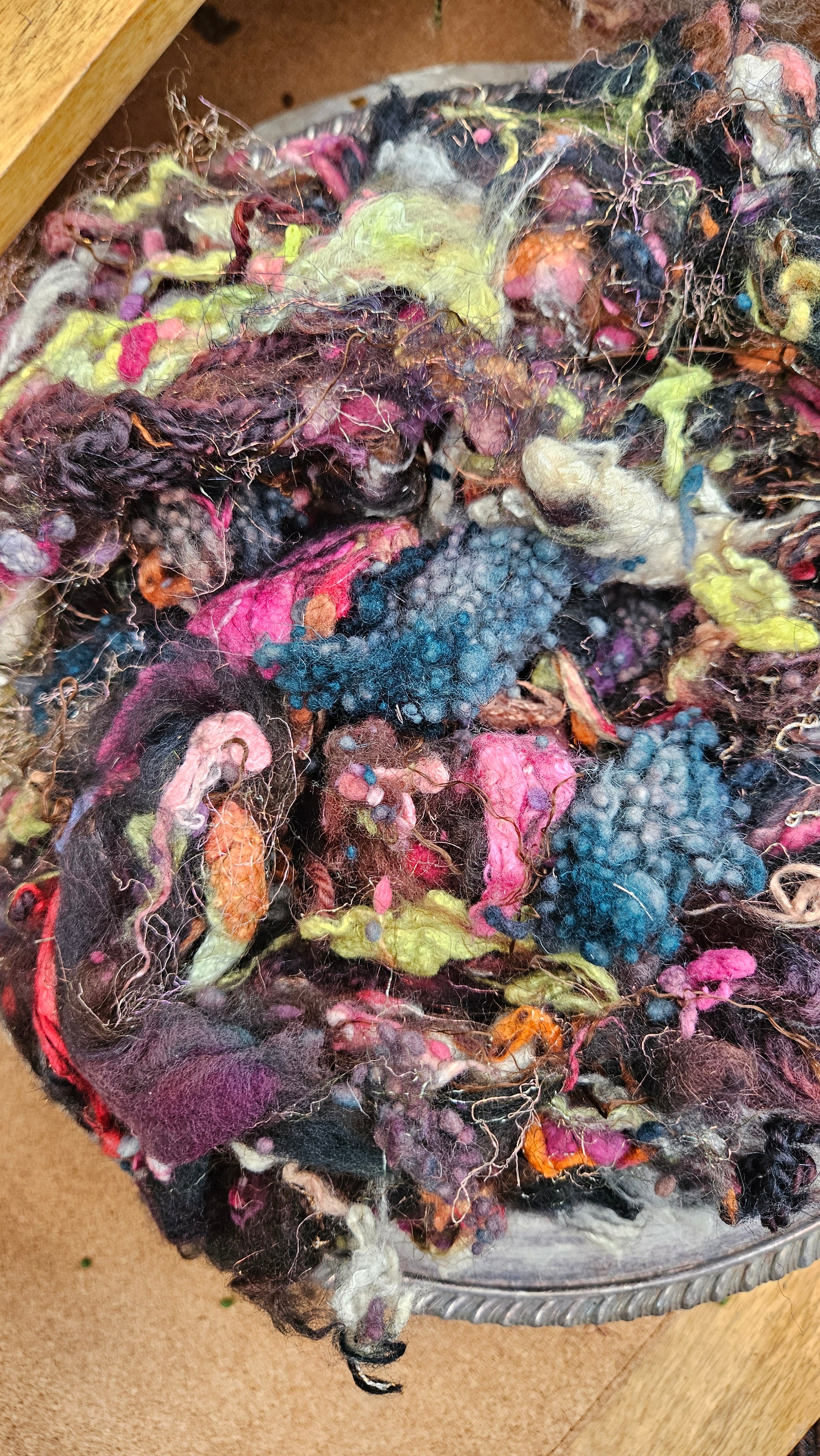 Over-Dyed Alpaca Texture Blend. A signature creation from Neauveau Texture Apothecary, this luxurious art-fiber blend is a feast of textures and tones, designed for adventurous spinners and fiber artists. Each handful is a one-of-a-kind palette, over-dyed to create deep, layered colorways with unexpected pops of brightness.