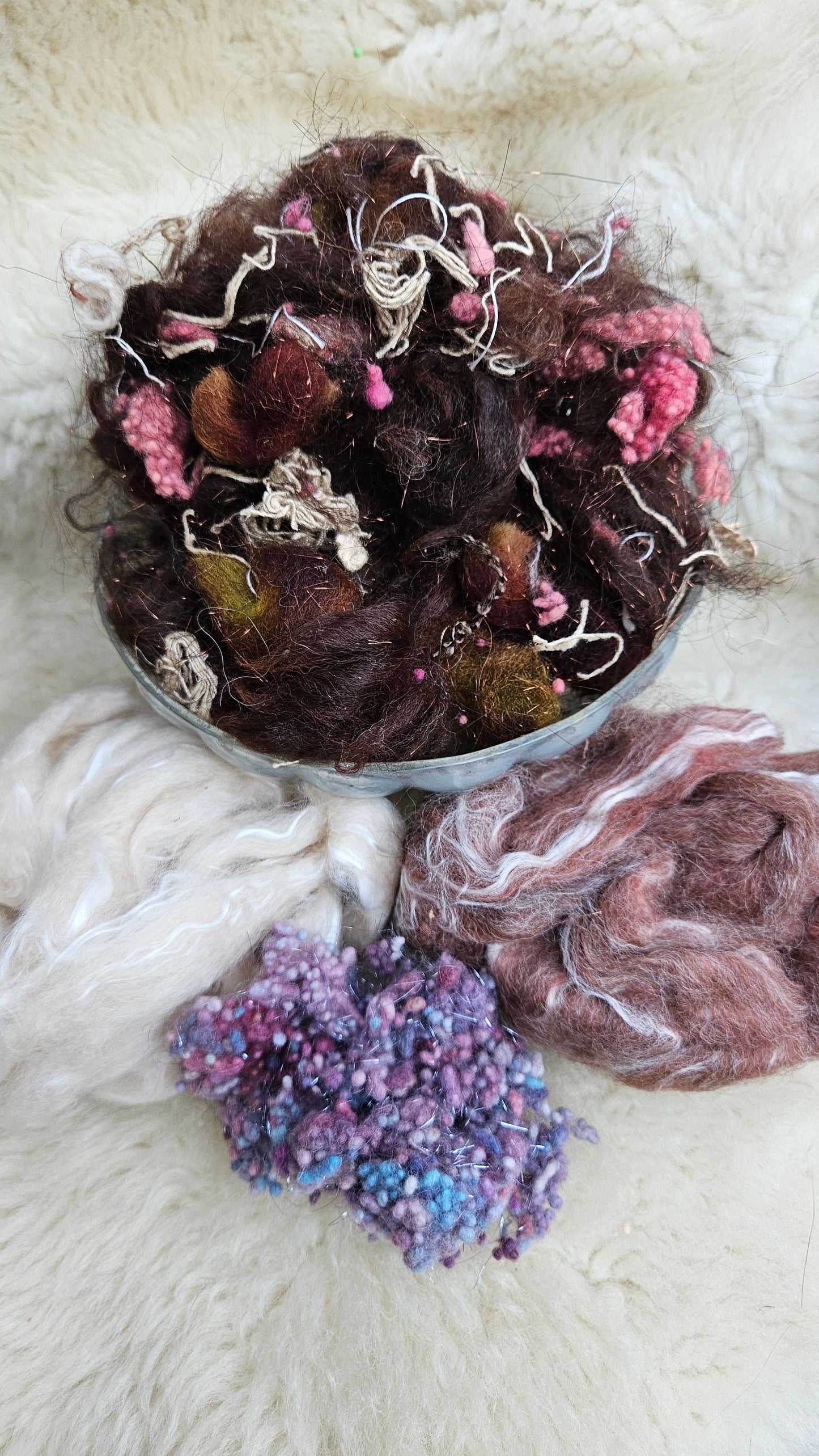 A 2.5 ounce kit of fine art inspired extra chunky texture and fiber for creating art batts, rolags, and blends to spin into yarn for knitting, weaving, crochet, felting, and fiber art. A little can go a long way! Each bag is subtly different due to the size of the texture and nuance in the dyed bits.