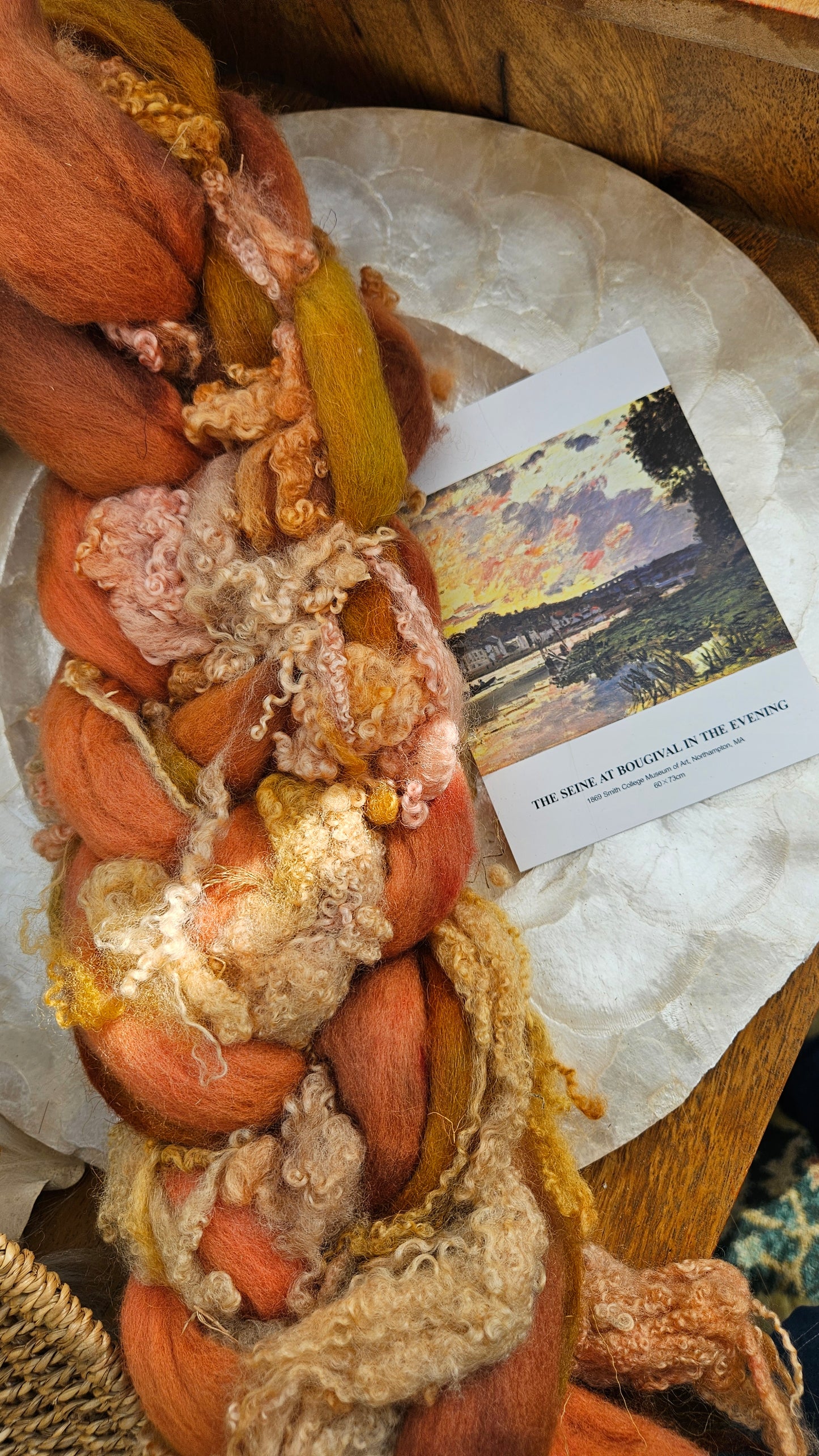 Inspired by the impressionist paintings of Waterhouse using his timeless fine art colorway pallete. Each wool roving braid includes multiple breeds and textures of high quality fiber for blending and carding into art batts or spinning into yarn directly from the braid.