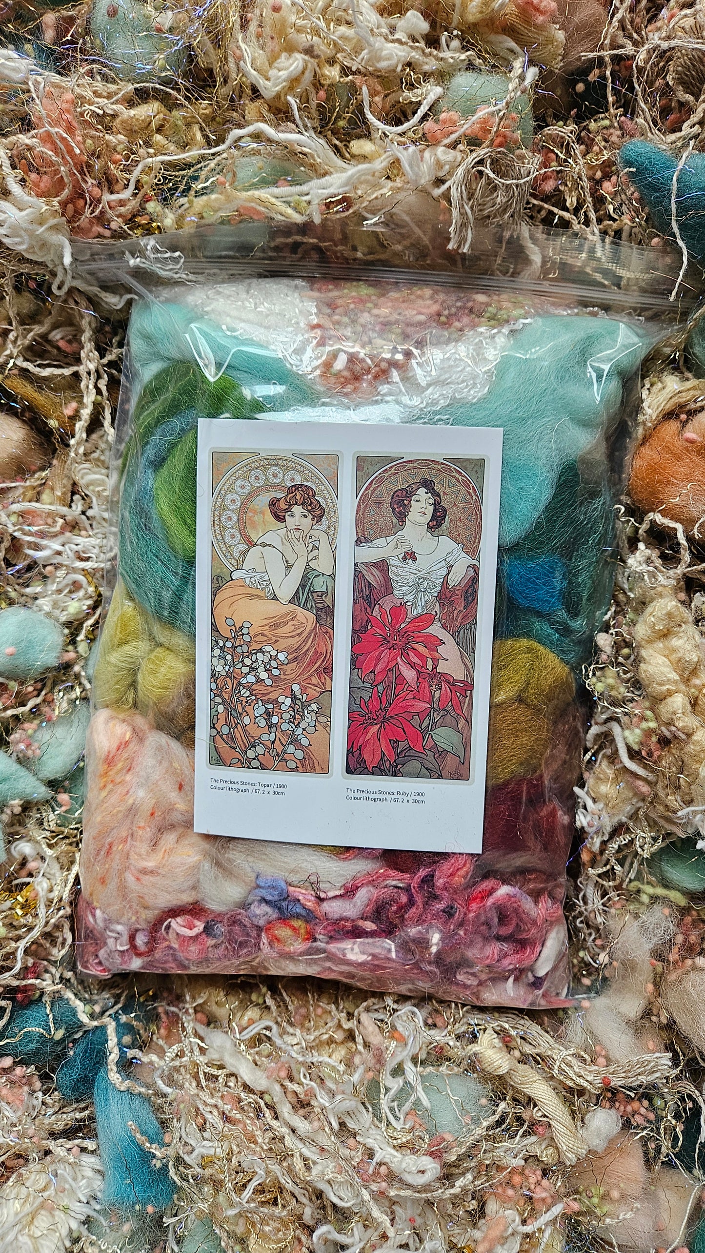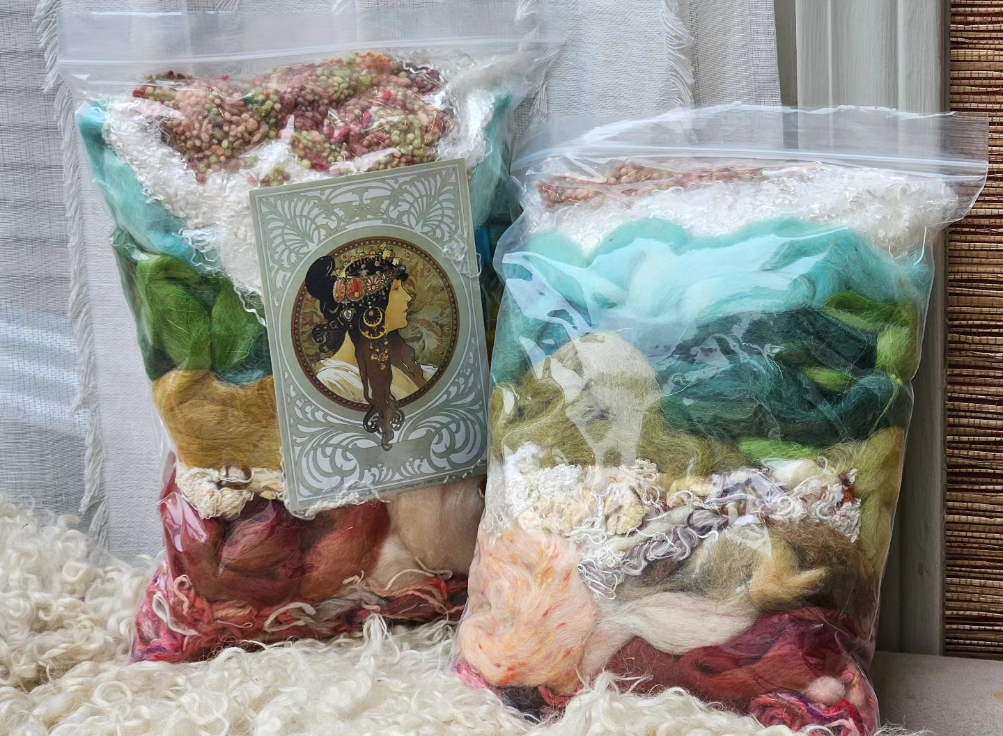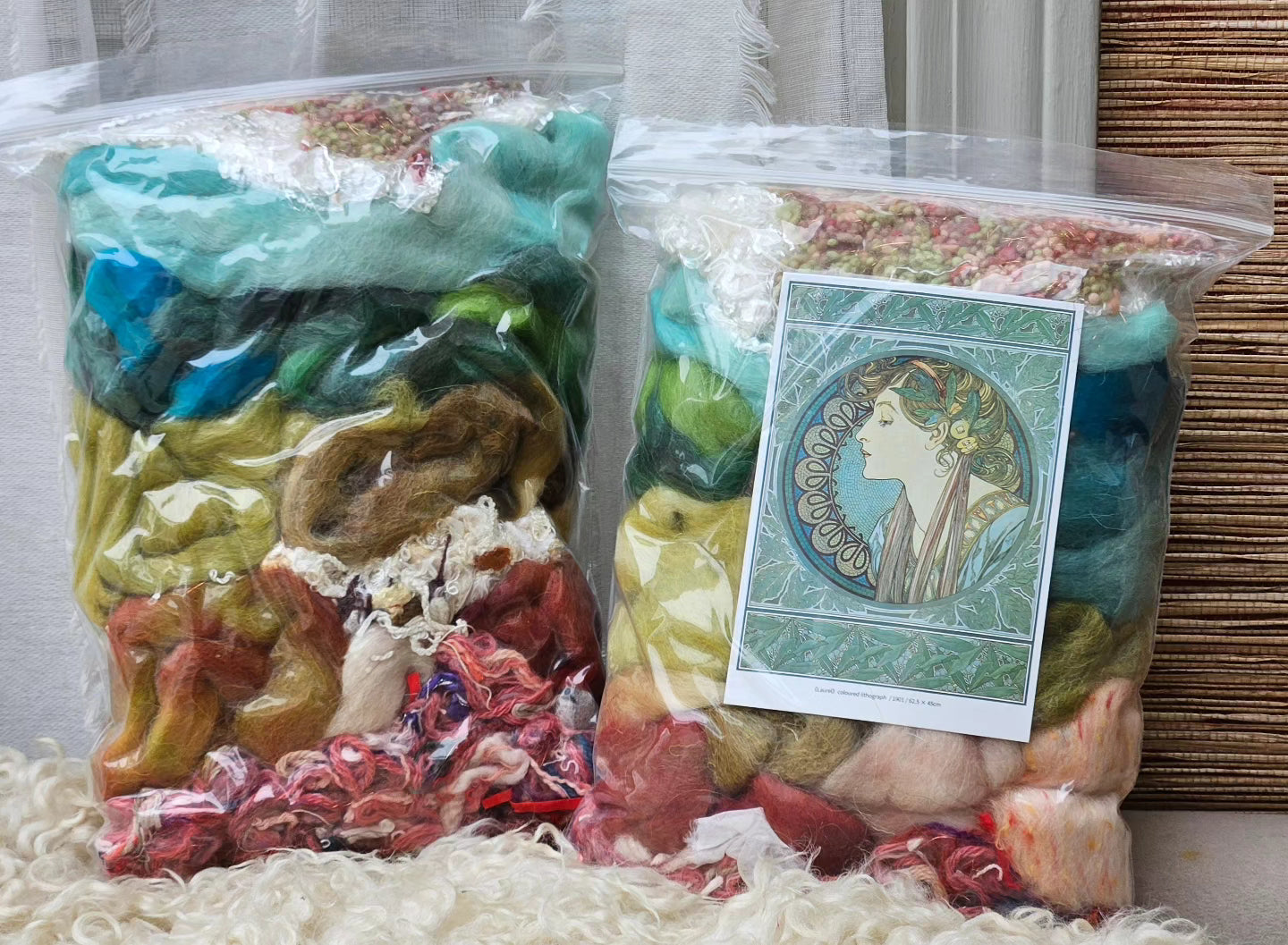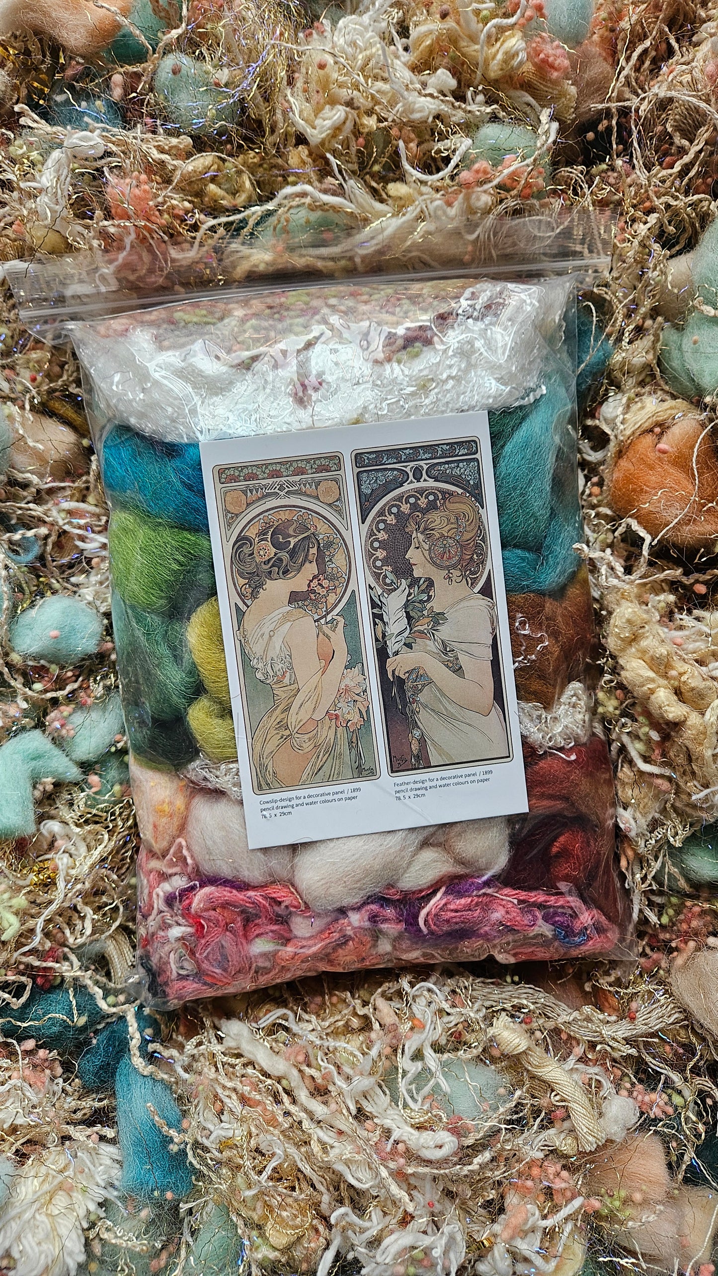 Every bag is unique and includes a collectible Alphonse Mucha art postcard to inspire your palette and design. Perfect for blending into art batts, spinning into custom yarn, or felting and freeform weaving, this set offers endless creative possibilities. Add 1.5–2 pounds of your favorite wool or base fiber to this collection to spin enough yarn for your very own Art Nouveau–inspired sweater.