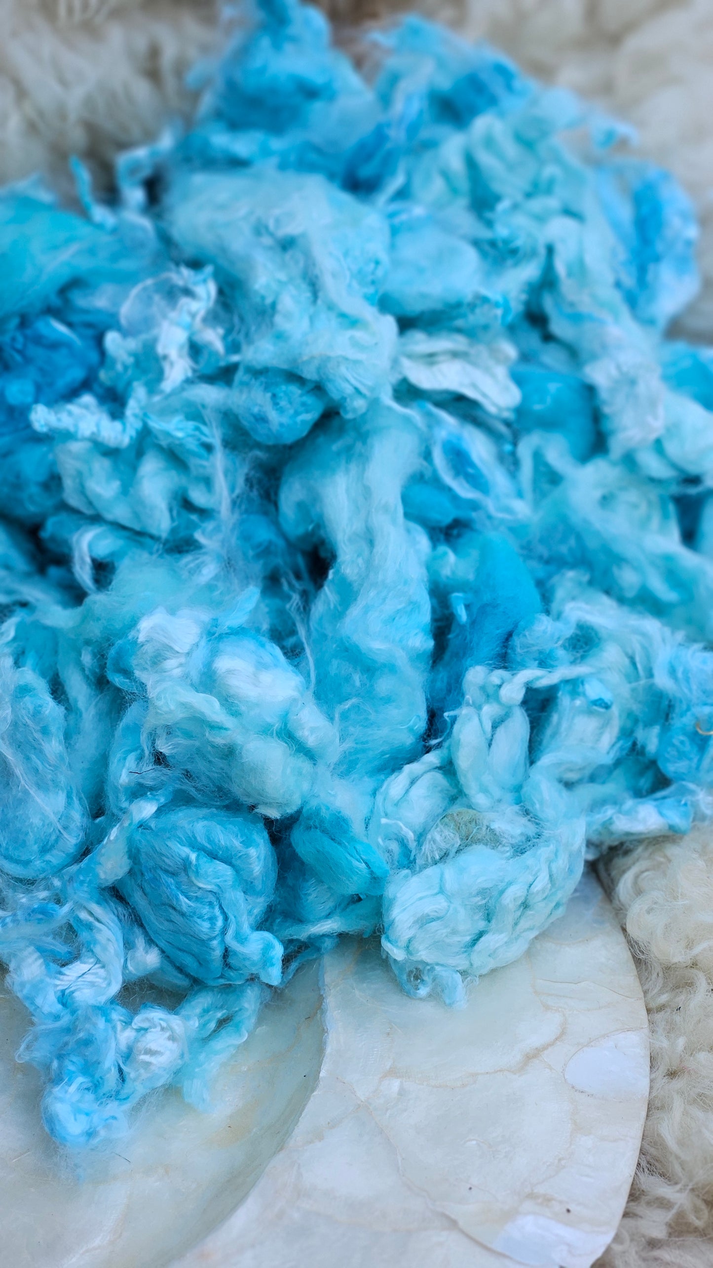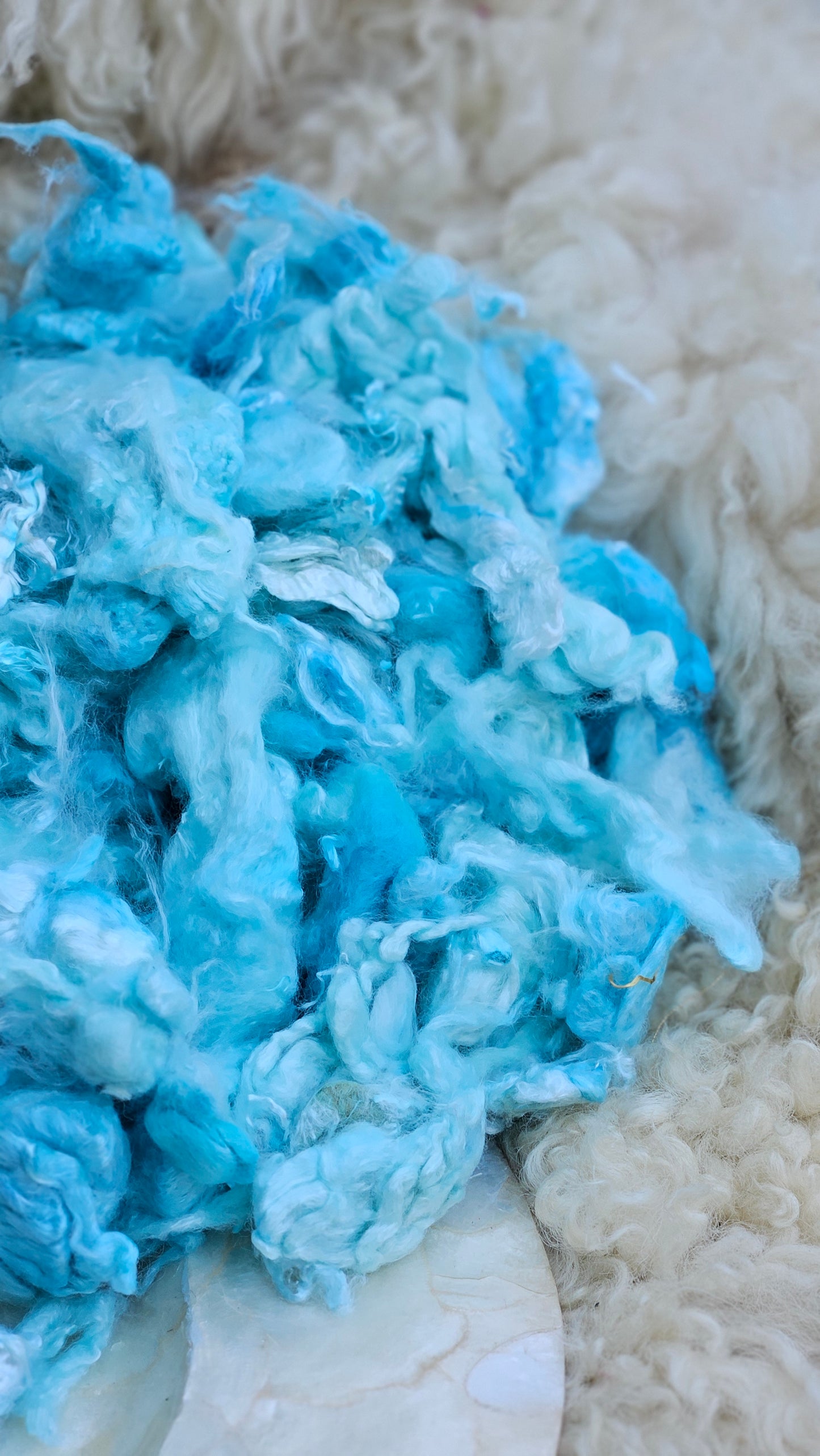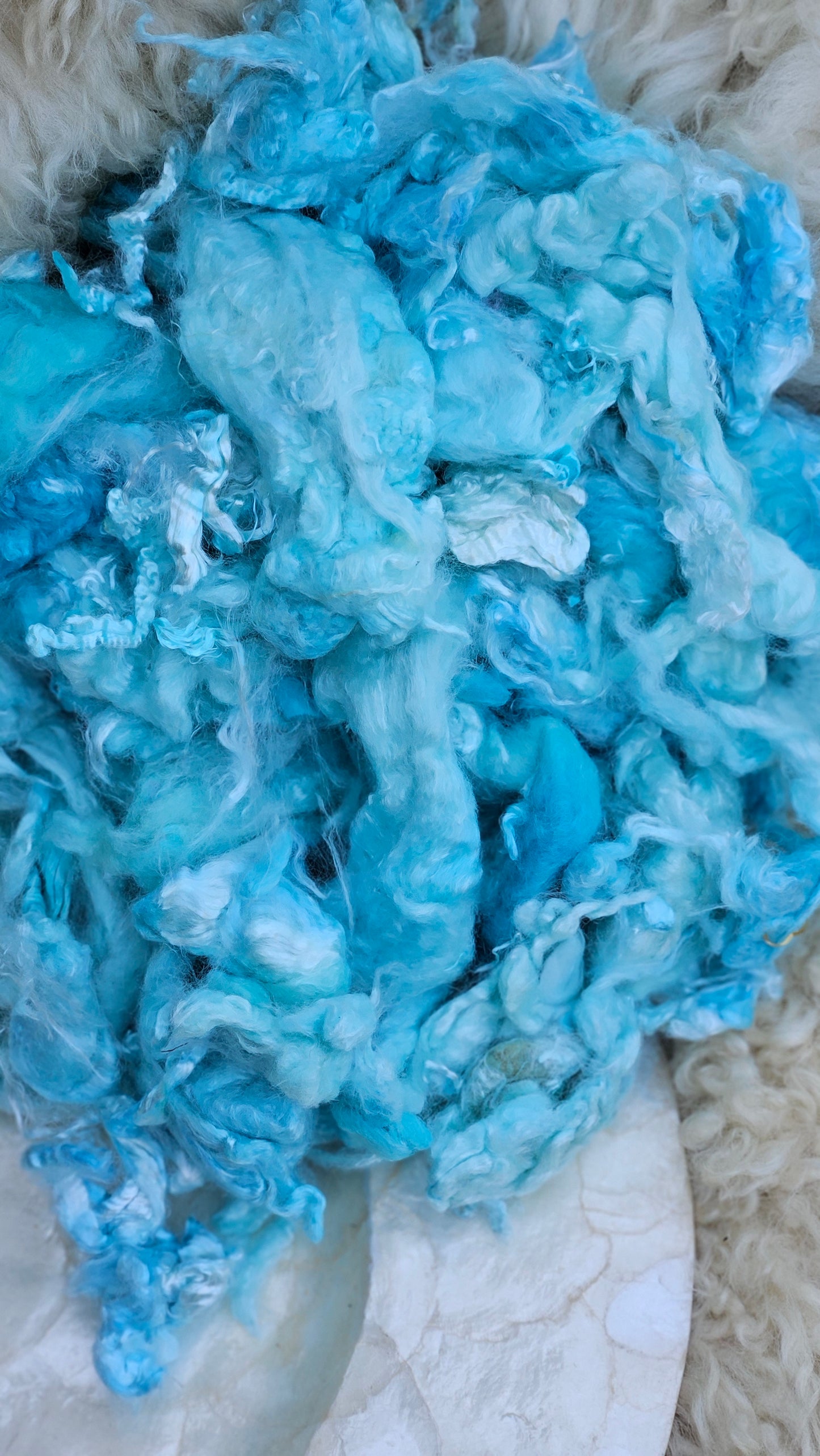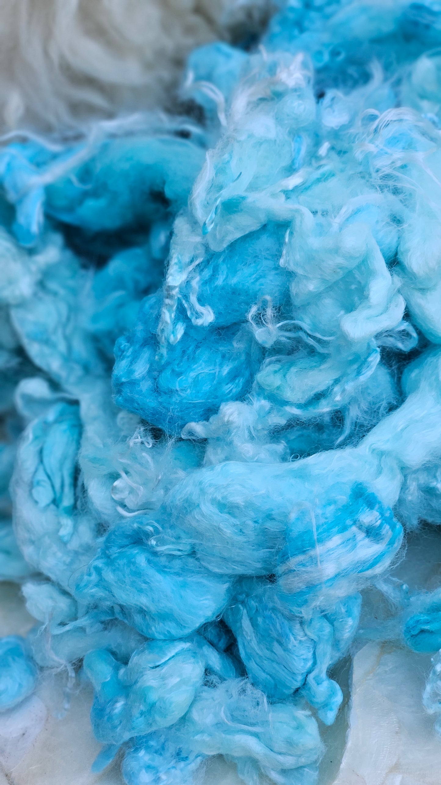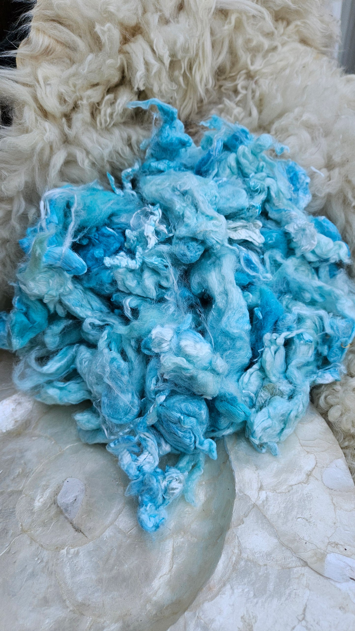 These dense mallowy chunks can be hand-picked very easily to create a fluffy cloud. Running it thru a wool picker would create divine fluffy cloud. This zero-waste fiber is a perfect foundation for art batts, felting, and fiber art.