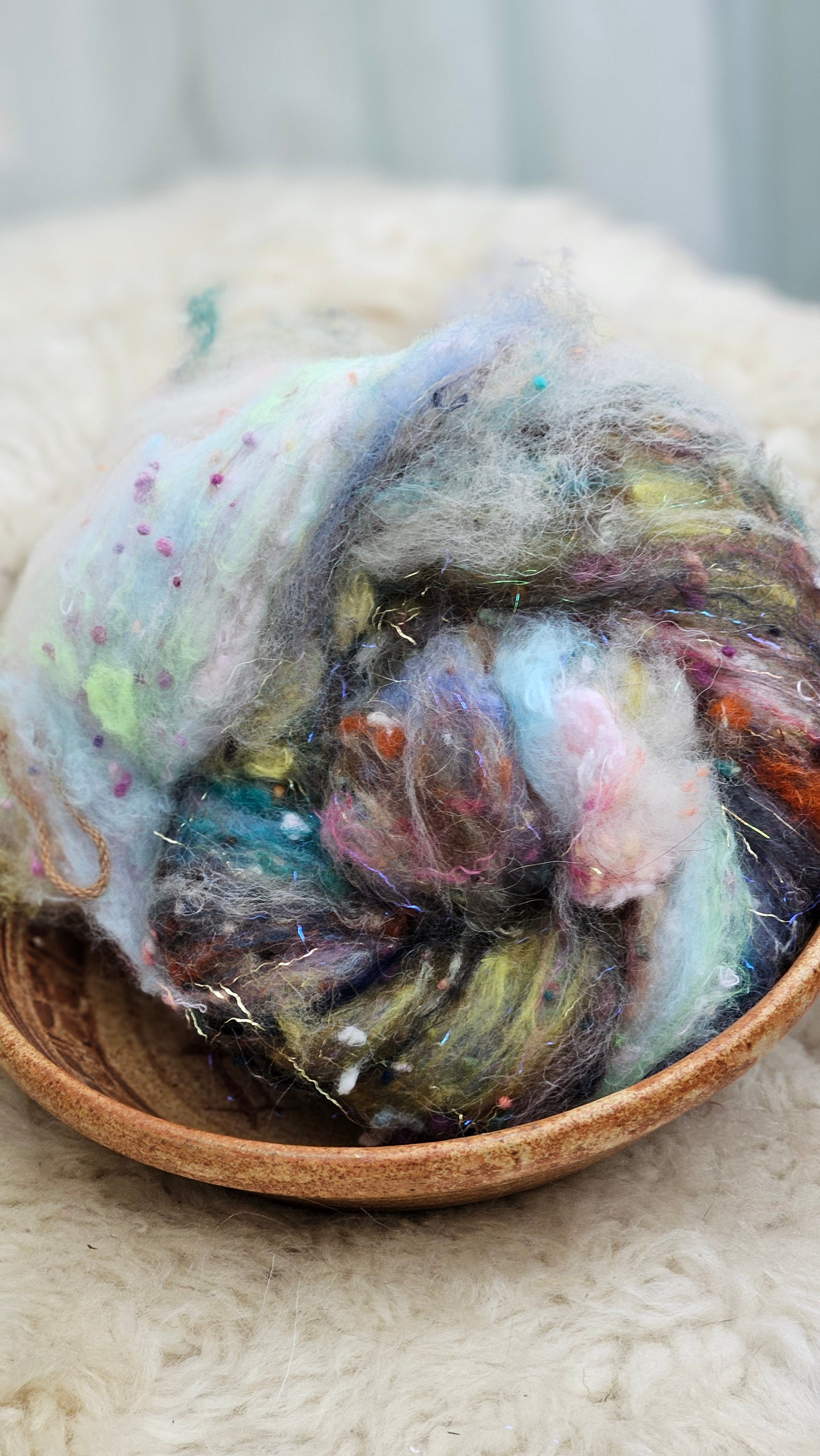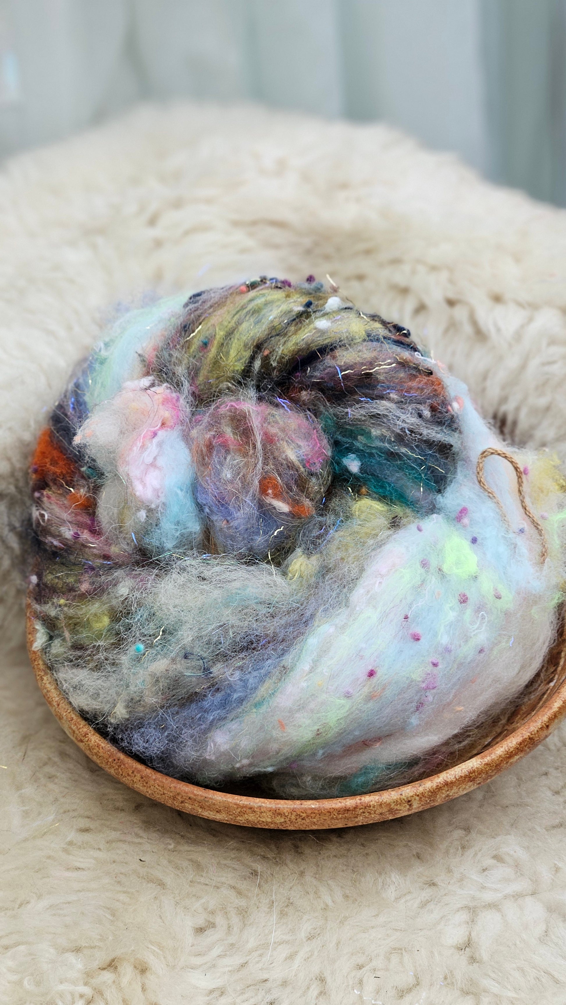 Some trace lanolin may be present in some batts due to the nature of the fine wool used in the base. Ideal for spinning art yarn especially and including corespinning.