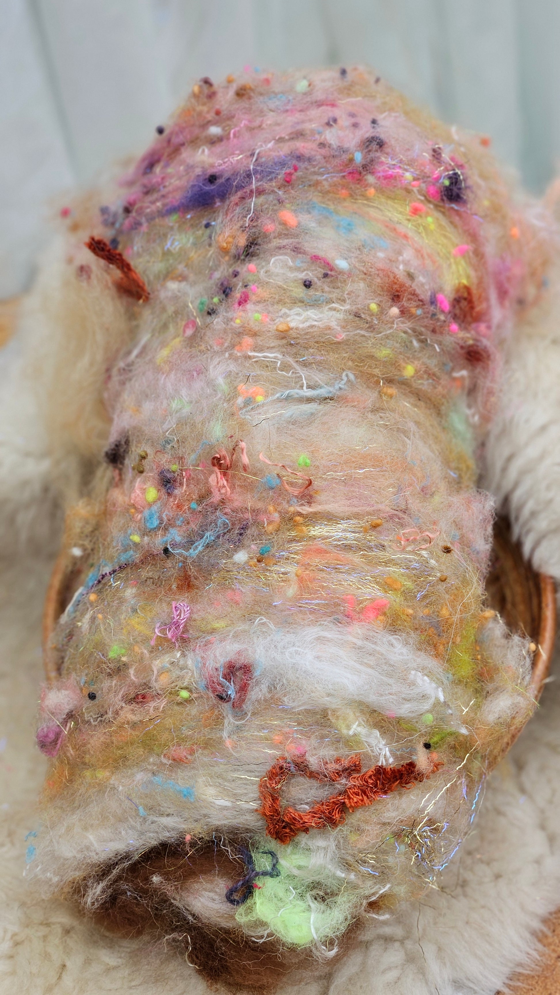 Some trace lanolin may be present in some batts due to the nature of the fine wool used in the base. Ideal for spinning art yarn especially and including corespinning.