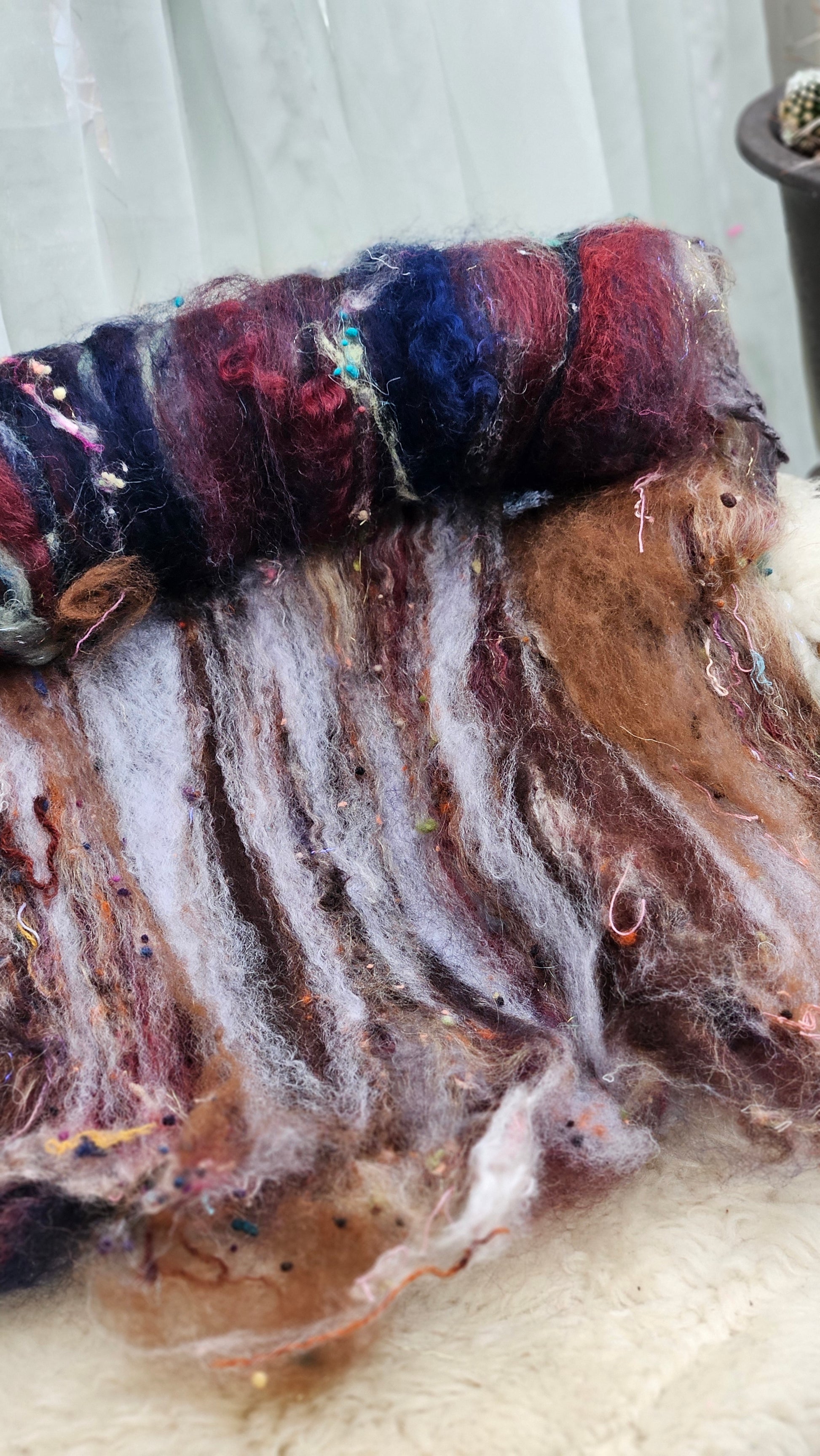 Some trace lanolin may be present in some batts due to the nature of the fine wool used in the base. Ideal for spinning art yarn especially and including corespinning.