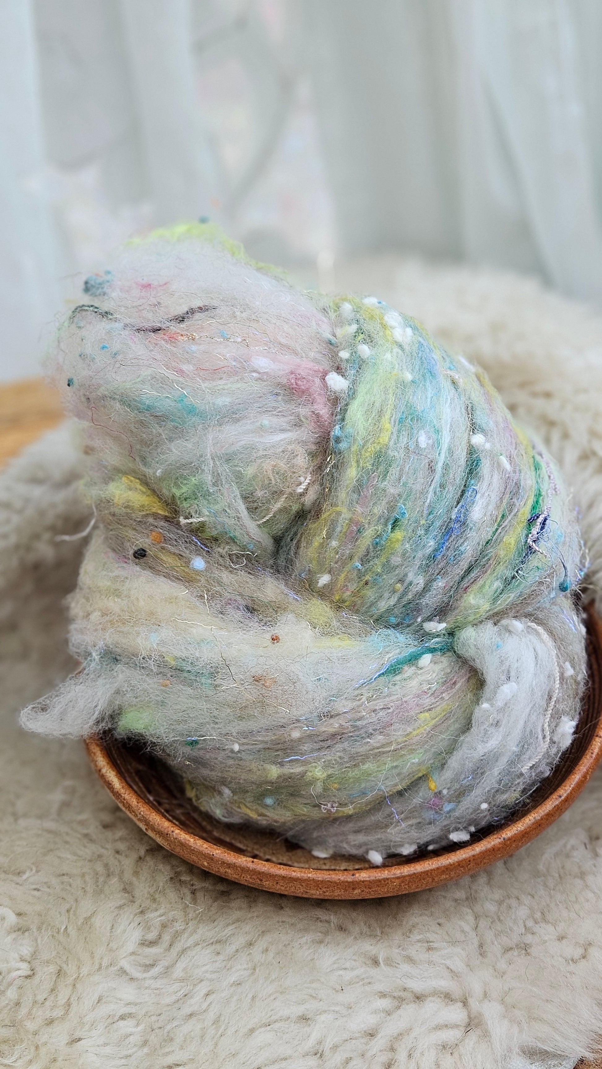 Some trace lanolin may be present in some batts due to the nature of the fine wool used in the base. Ideal for spinning art yarn especially and including corespinning.