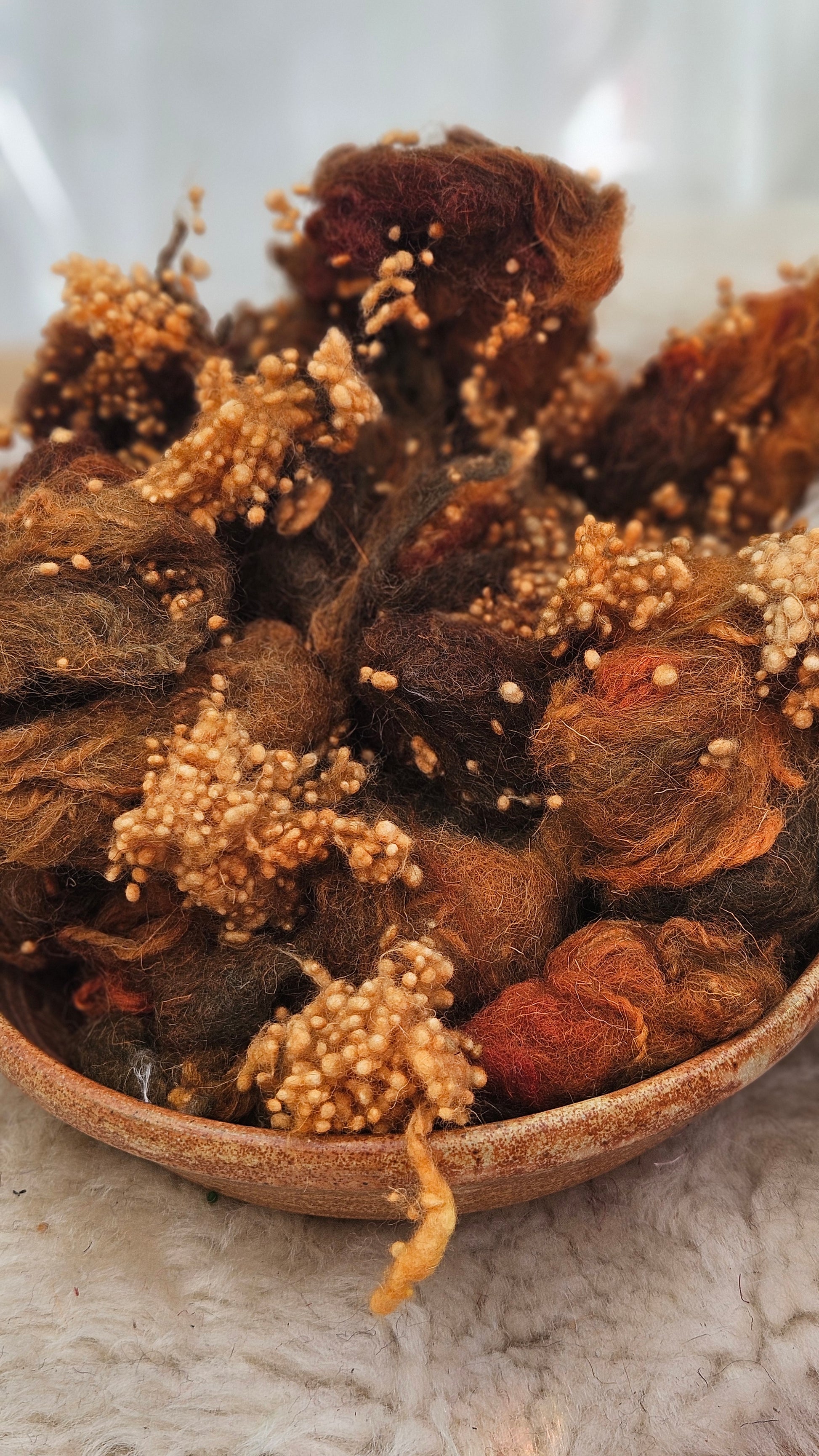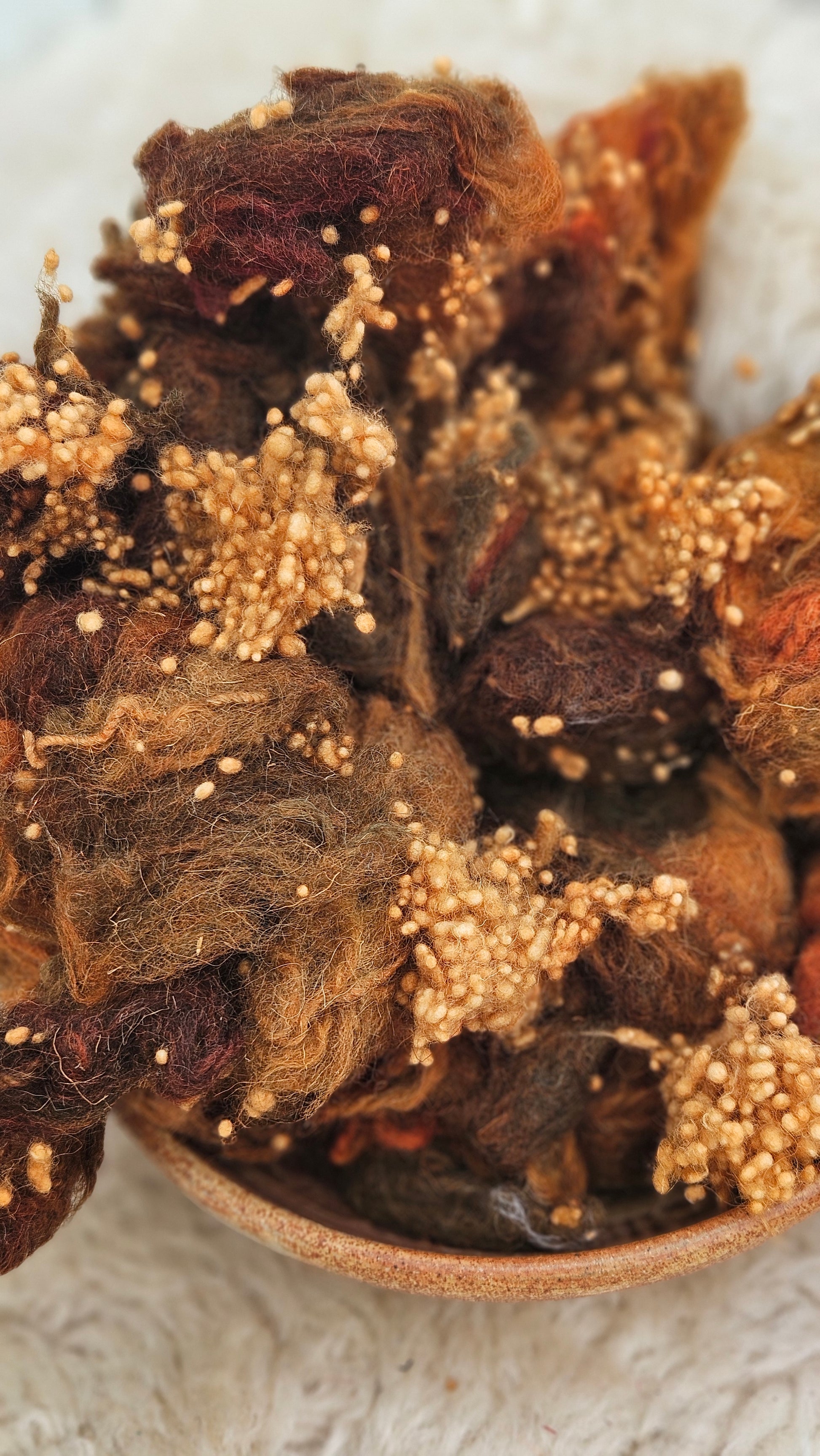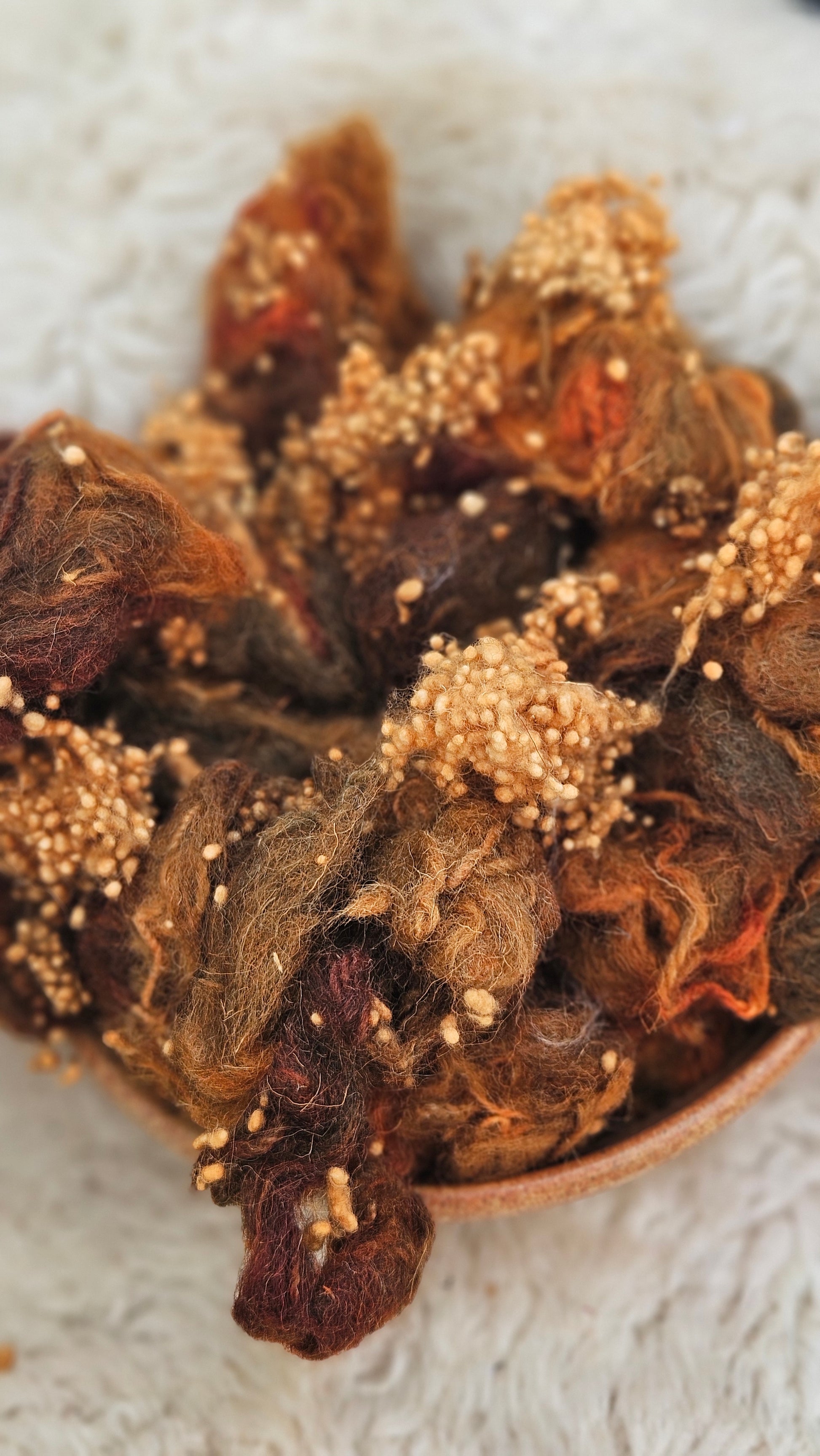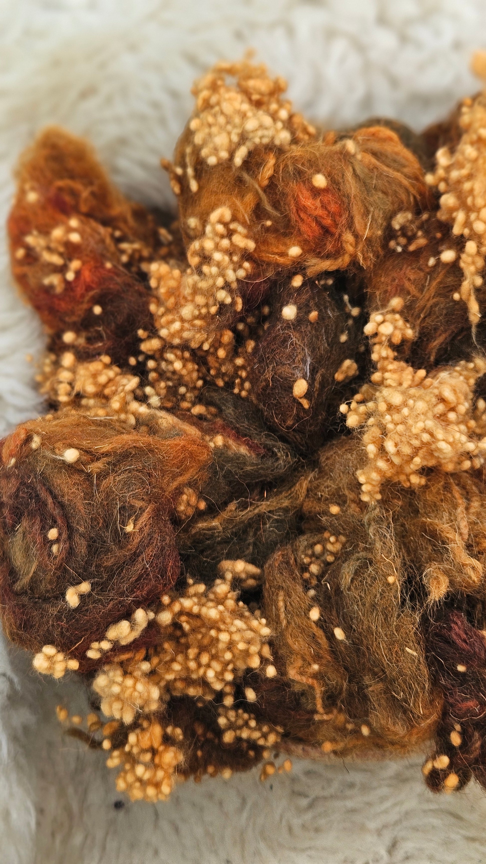 Every blend is hand-crafted in small batches. Whether you spin fine singles, textured art yarns, or add it into felting and mixed-media projects, this blend invites endless experimentation and delight.