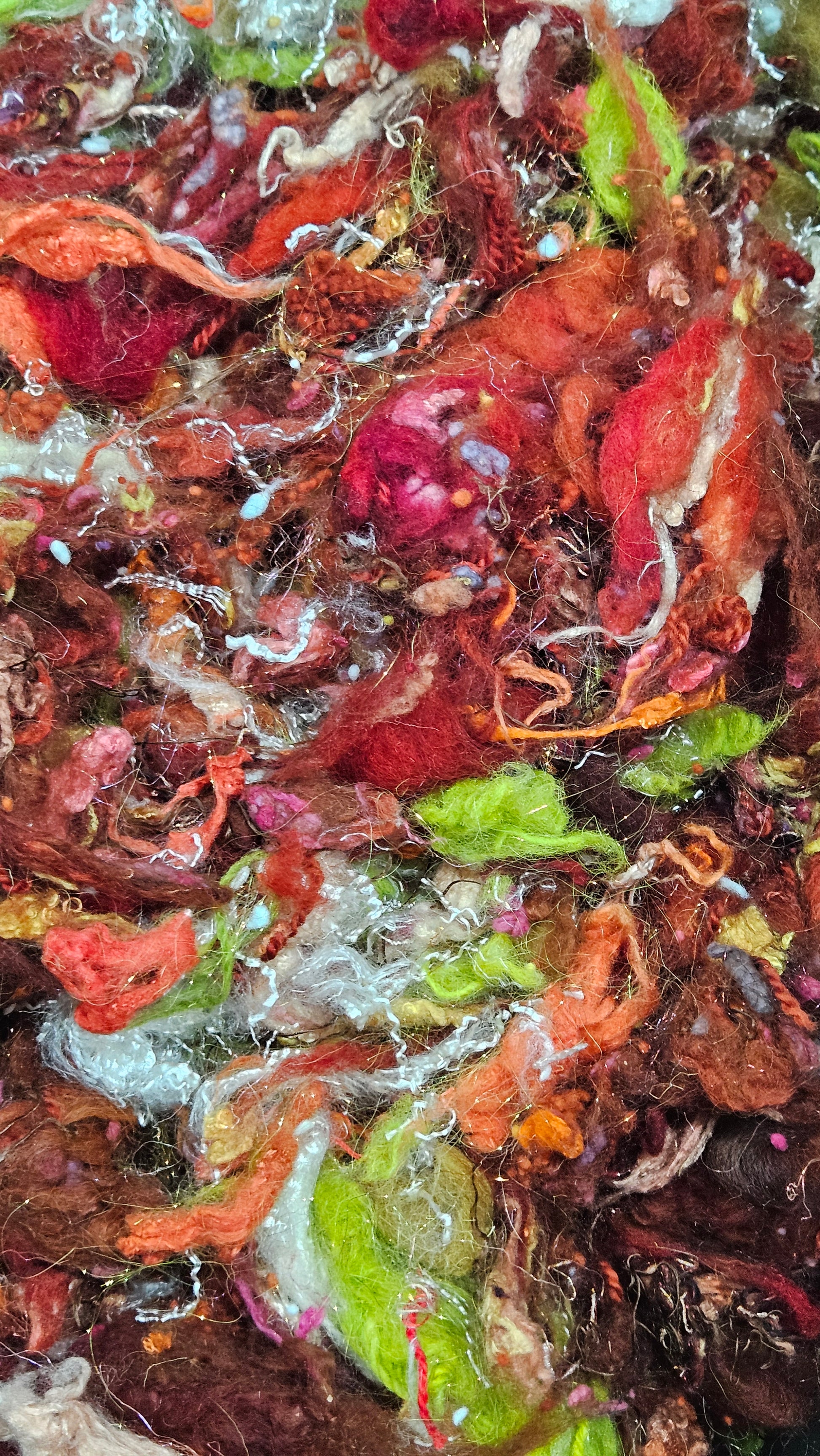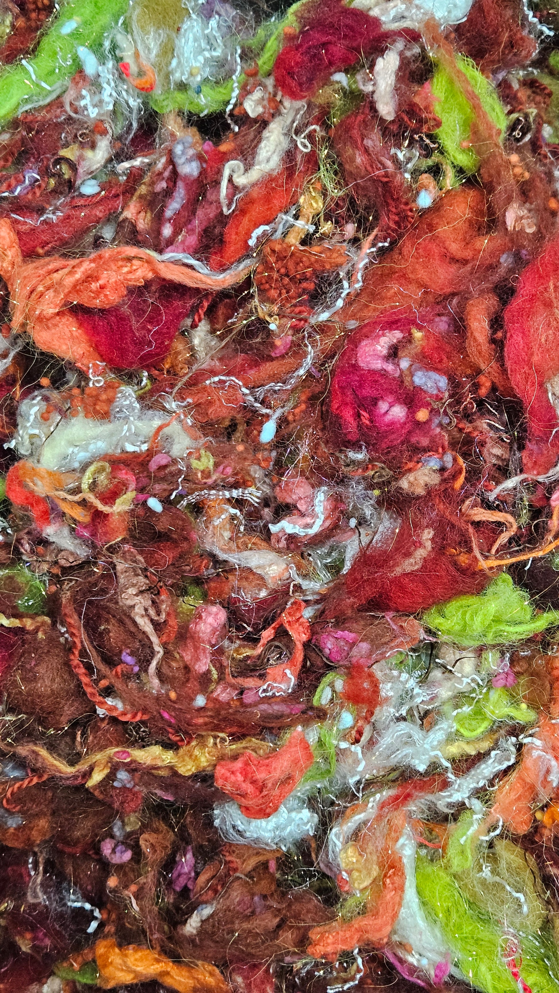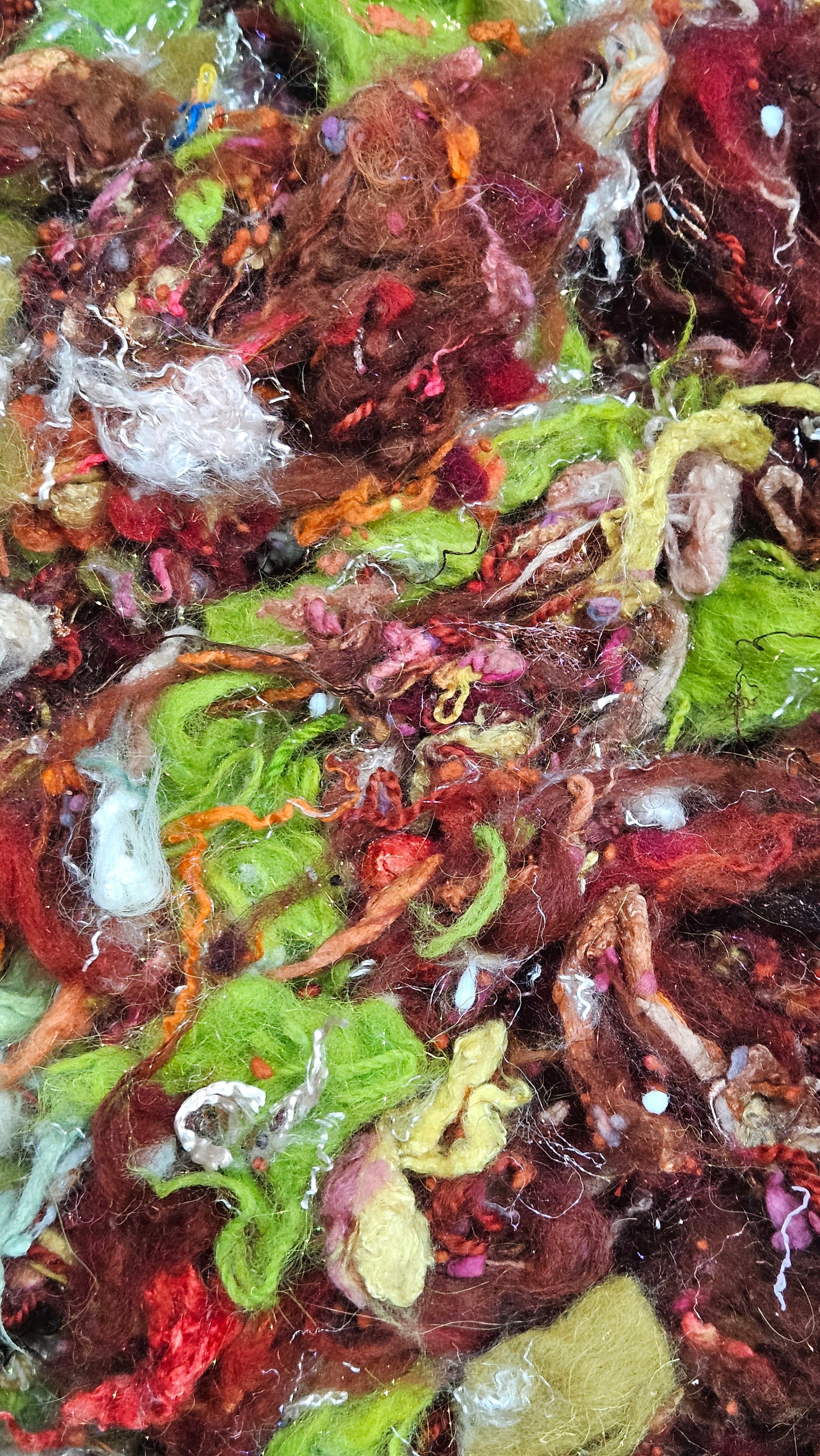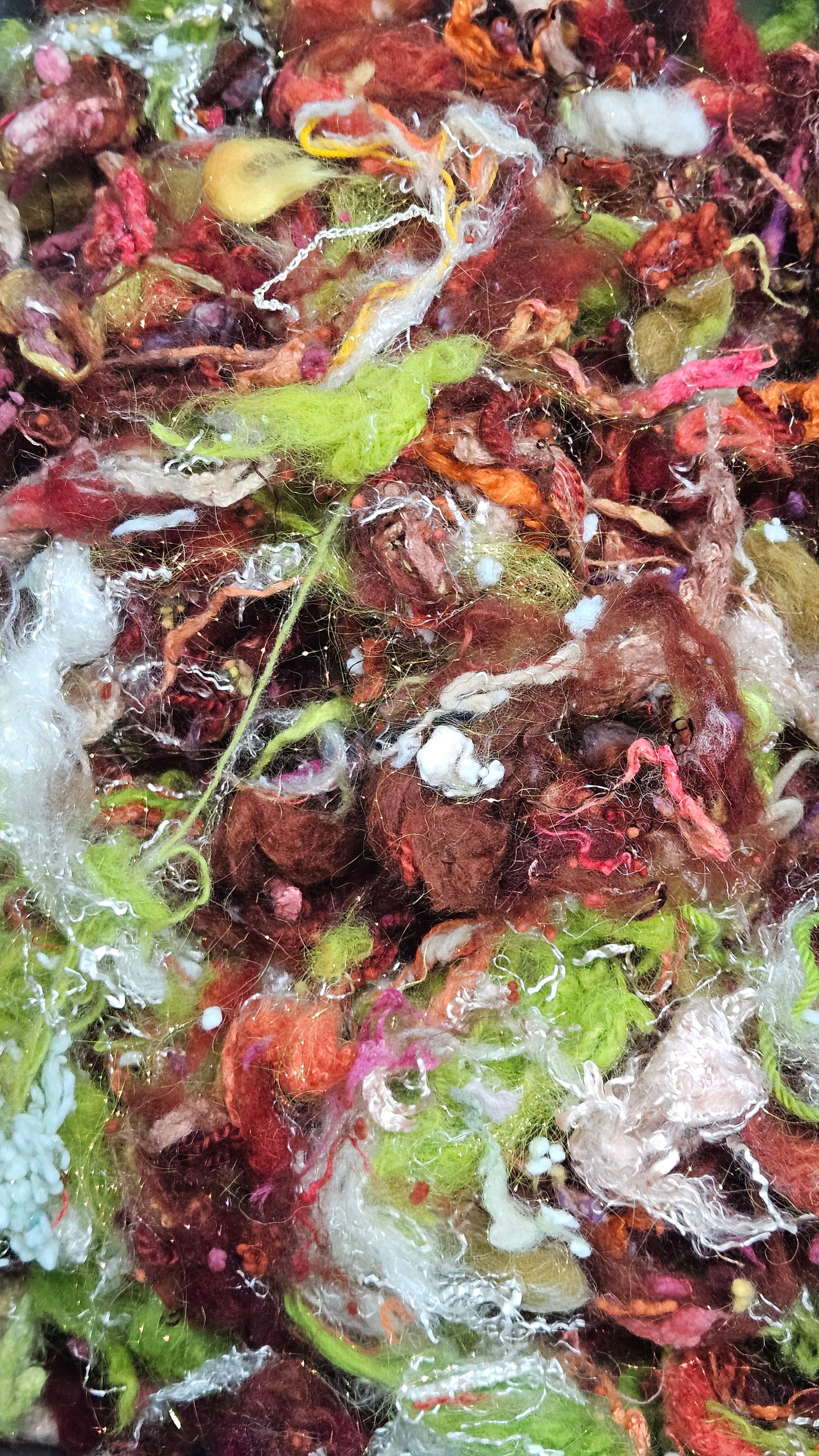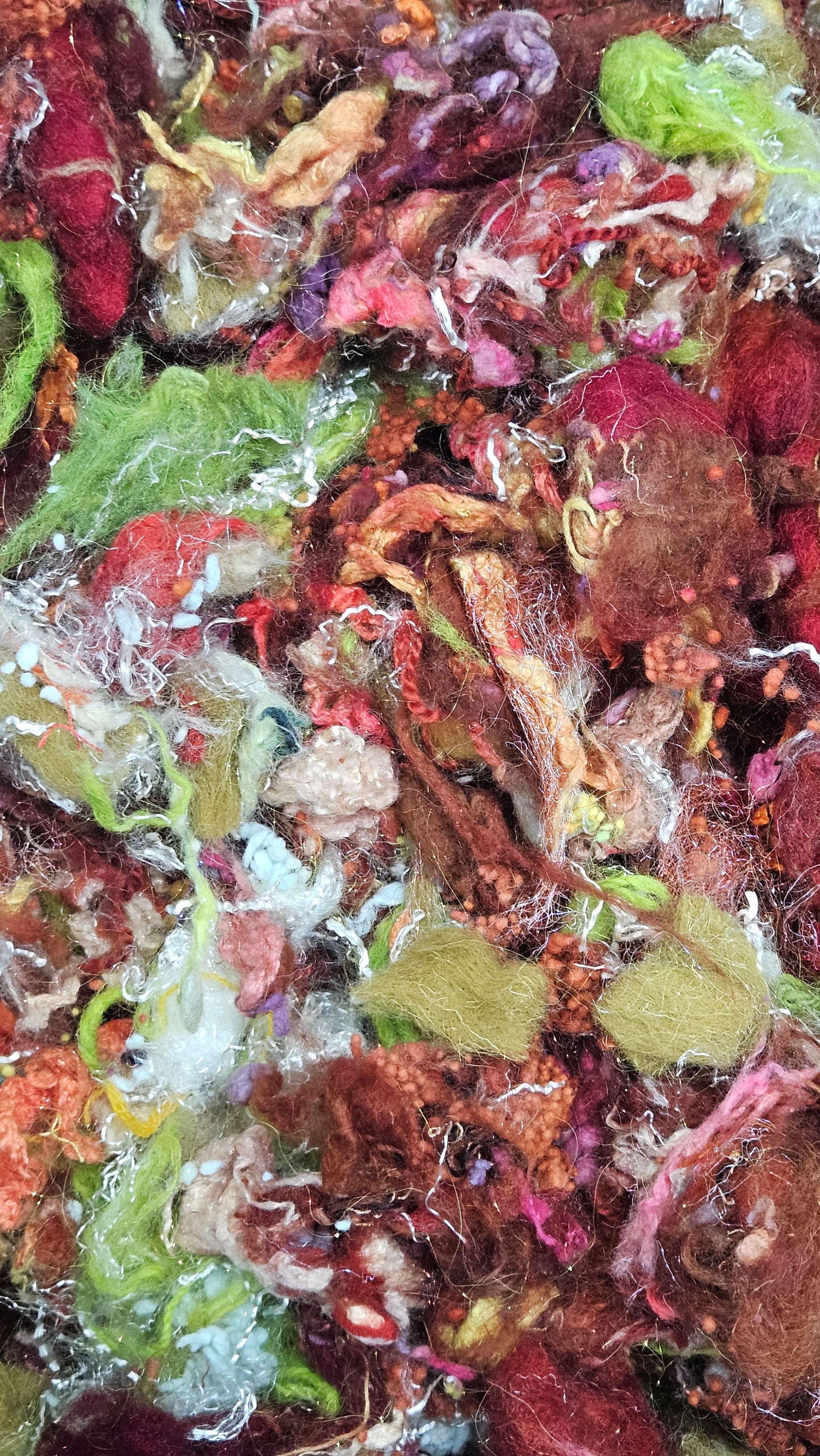 A fine art inspired extra chunky texture blend of fiber for creating art batts, rolags, and blends to spin into yarn for knitting, weaving, crochet, felting, and fiber art. A little can go a long way! Each bag is subtly different due to the size of the texture and nuance in the dyed bits.