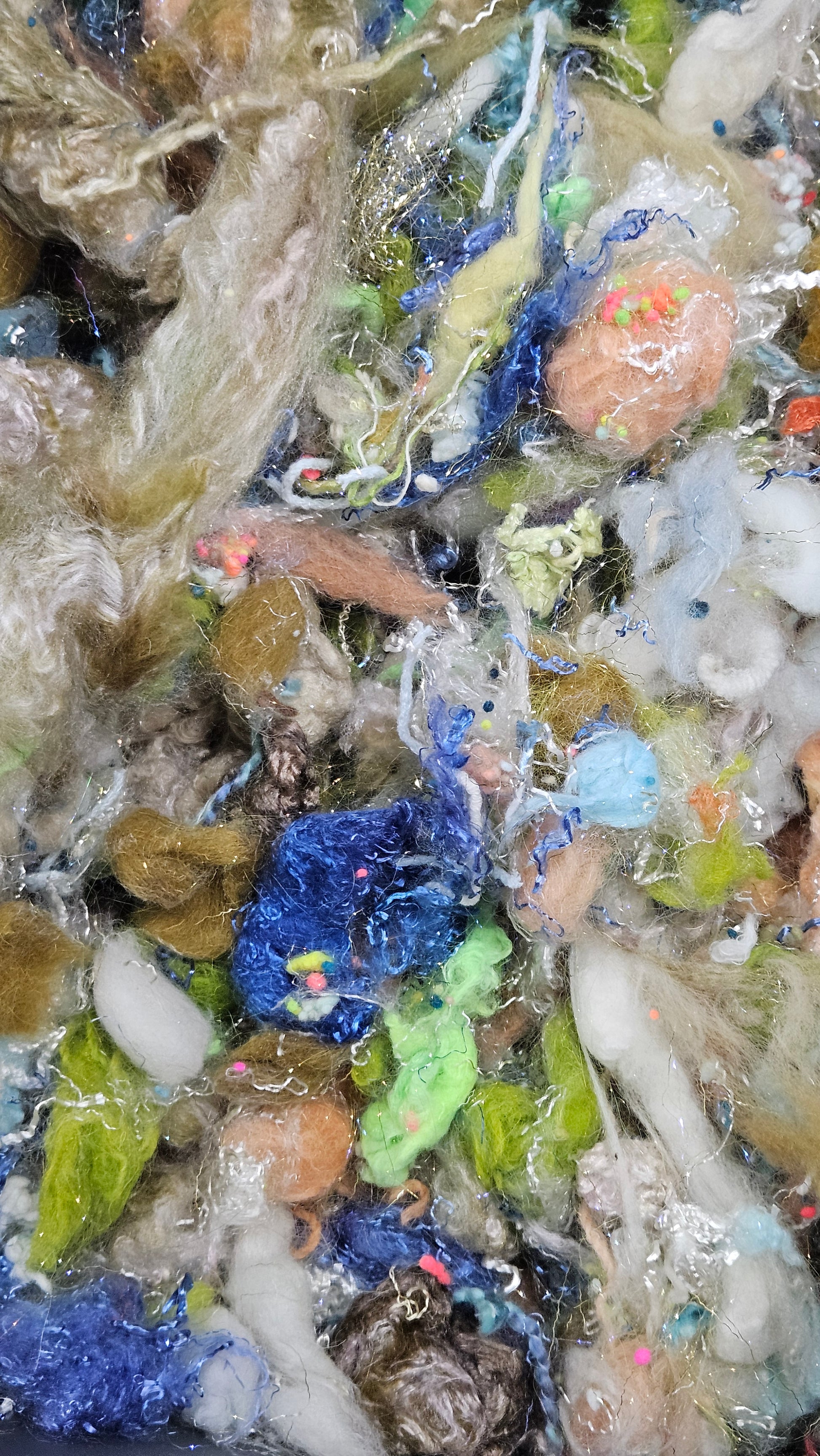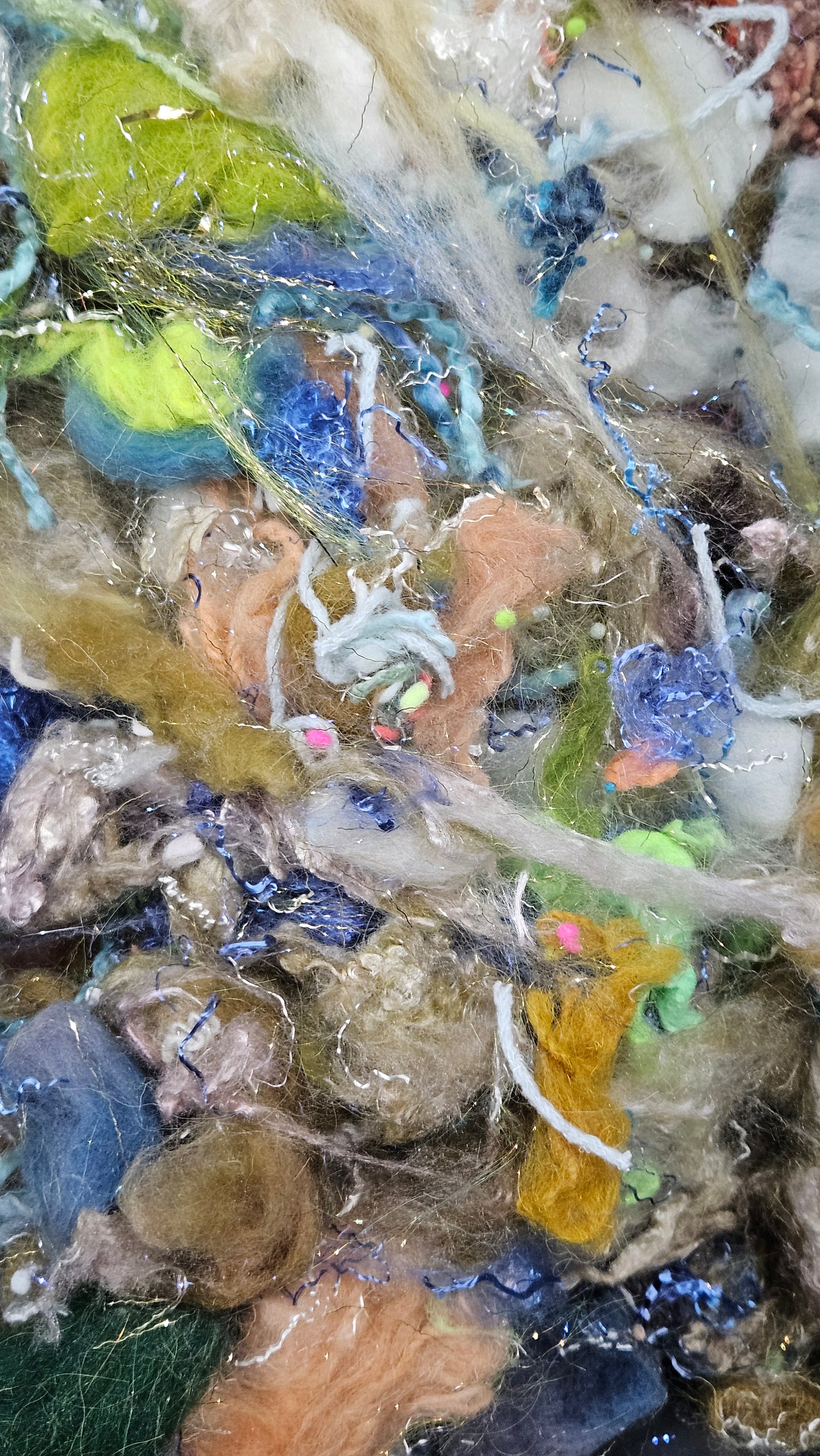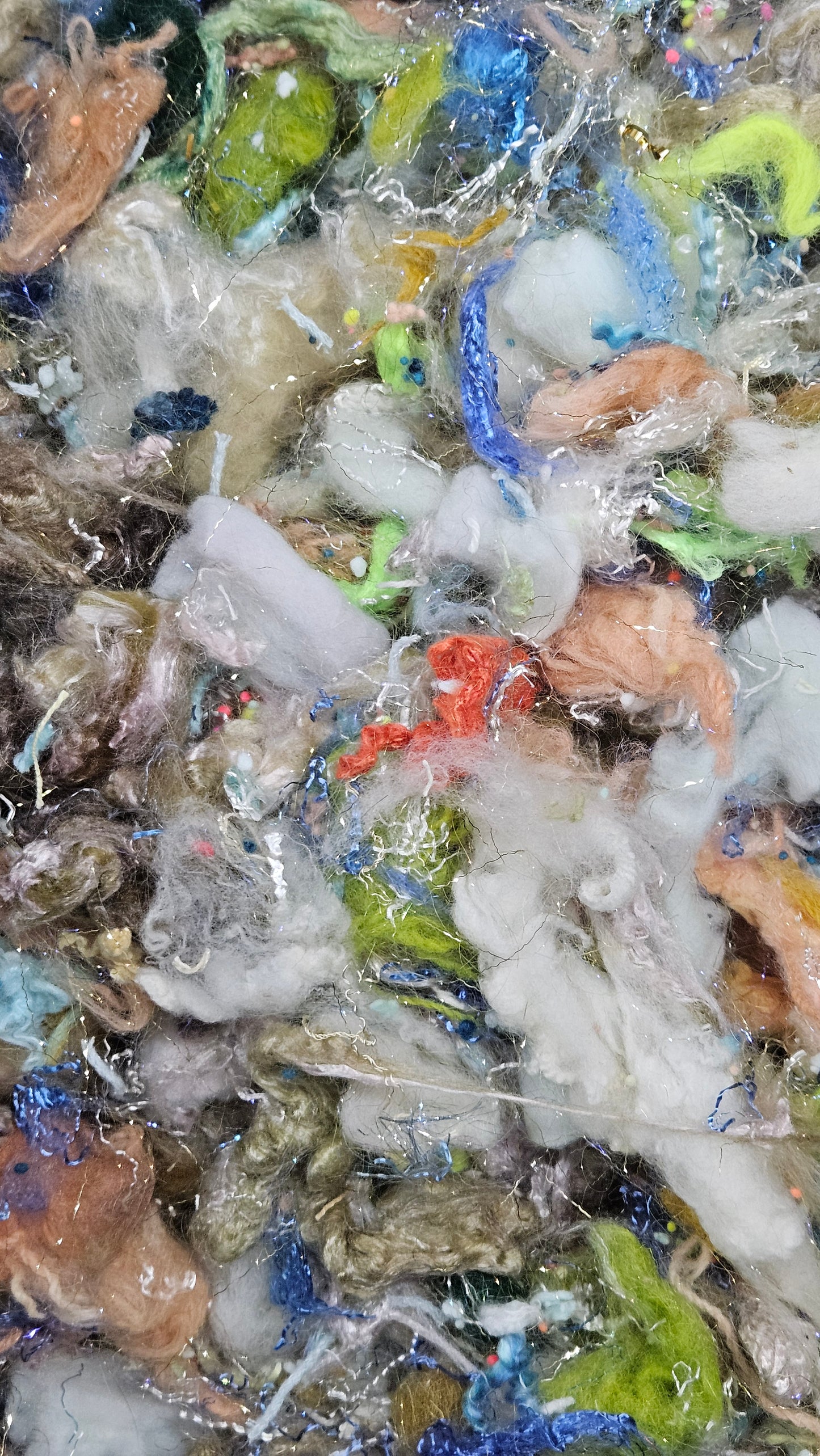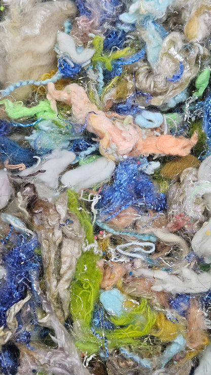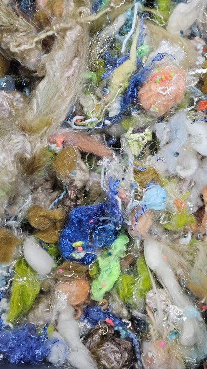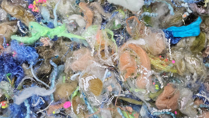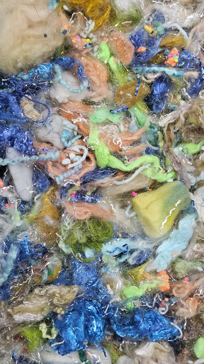 A fine art inspired extra chunky texture blend of fiber for creating art batts, rolags, and blends to spin into yarn for knitting, weaving, crochet, felting, and fiber art. A little can go a long way! Each bag is subtly different due to the size of the texture and nuance in the dyed bits.