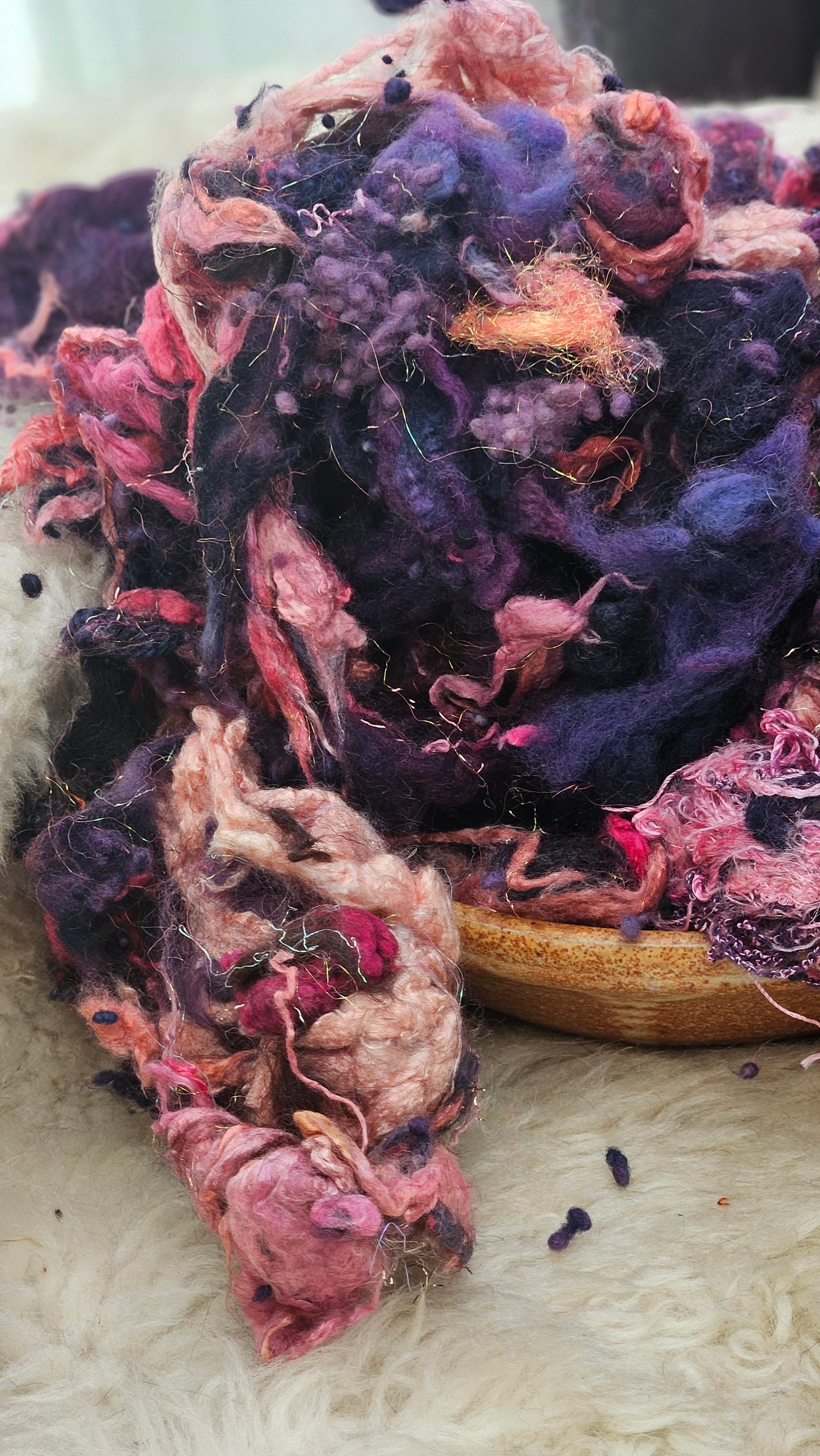 Every blend is hand-crafted in small batches. Whether you spin fine singles, textured art yarns, or add it into felting and mixed-media projects, this blend invites endless experimentation and delight.