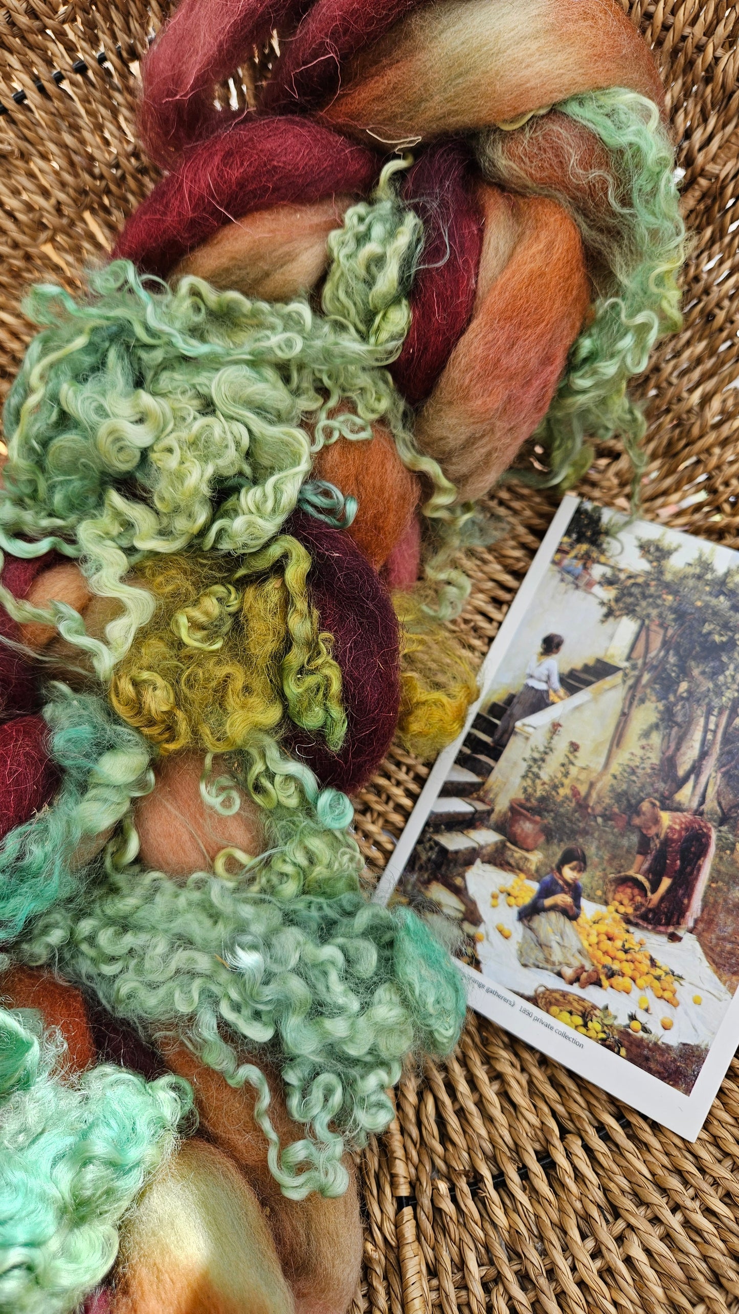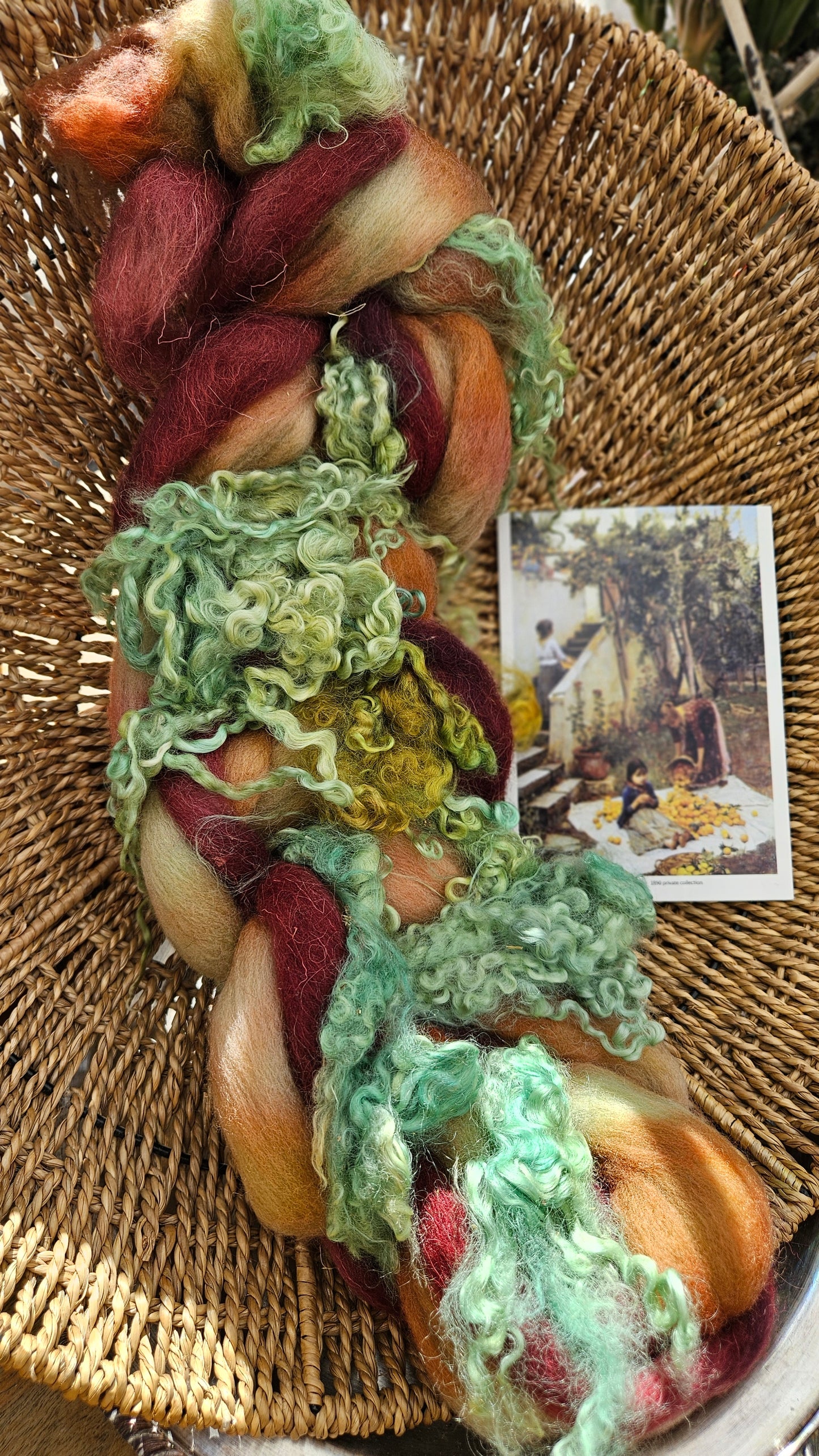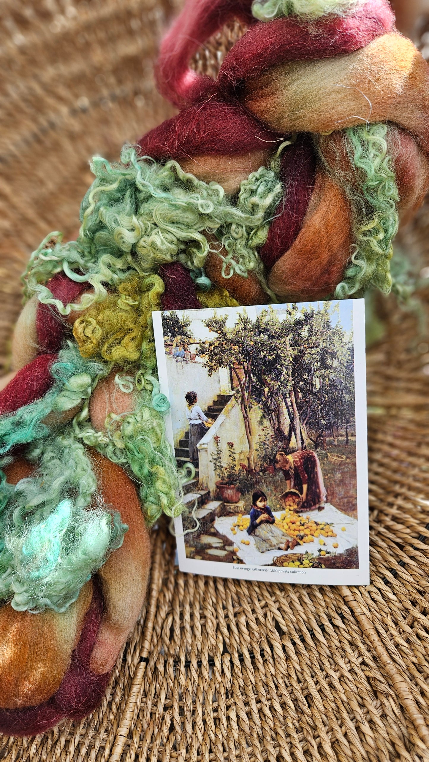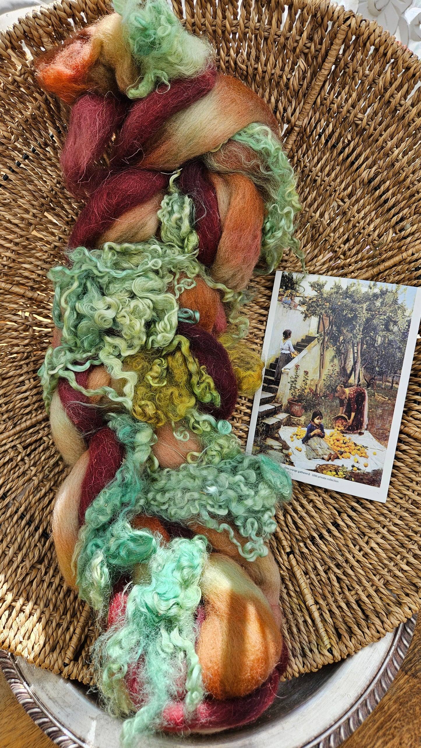 Inspired by the impressionist paintings of Waterhouse using his timeless fine art colorway pallete. Each wool roving braid includes multiple breeds and textures of high quality fiber for blending and carding into art batts or spinning into yarn directly from the braid.