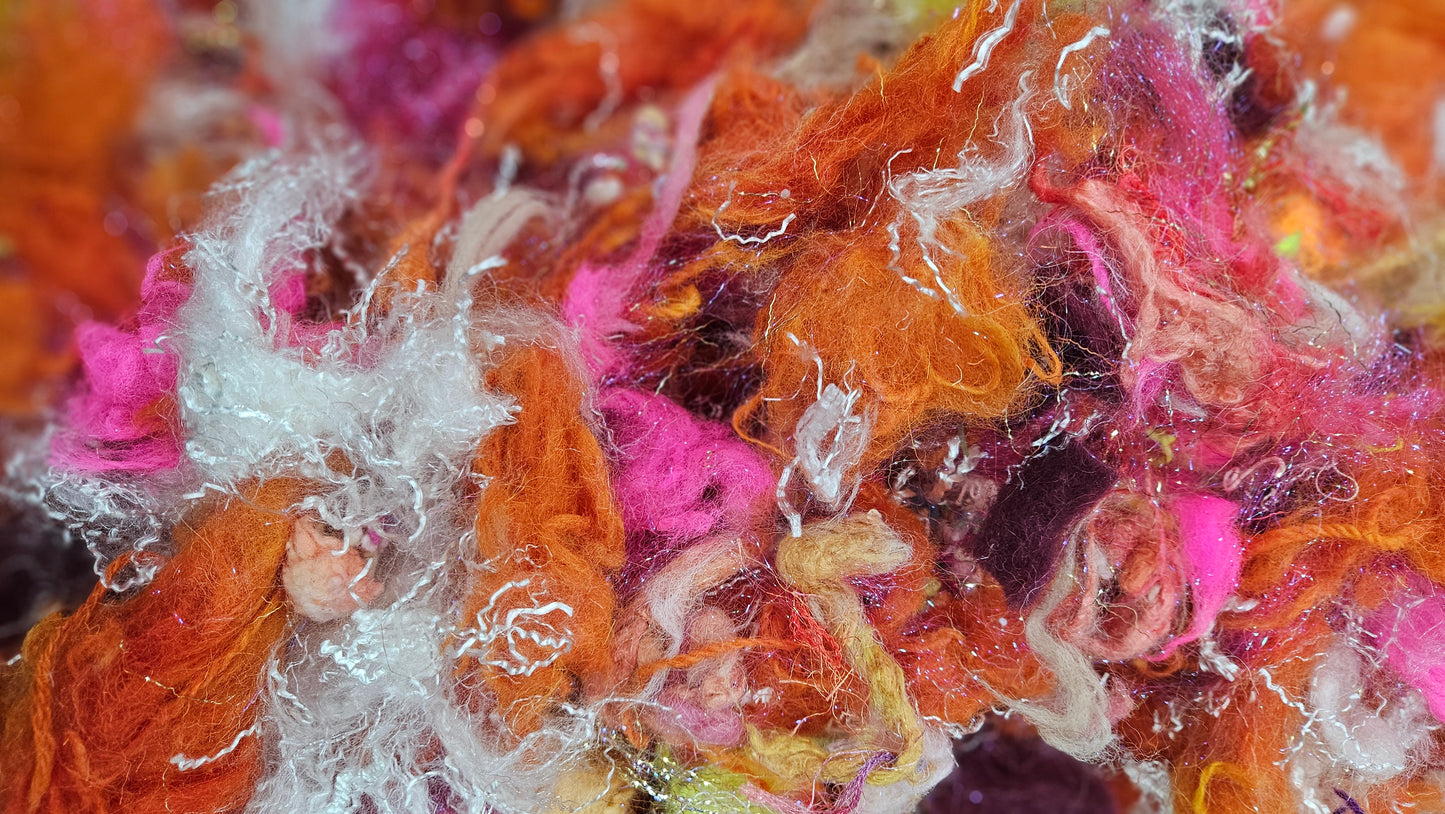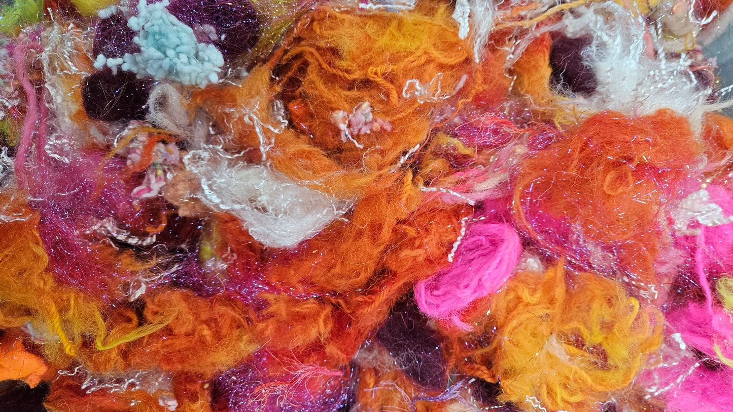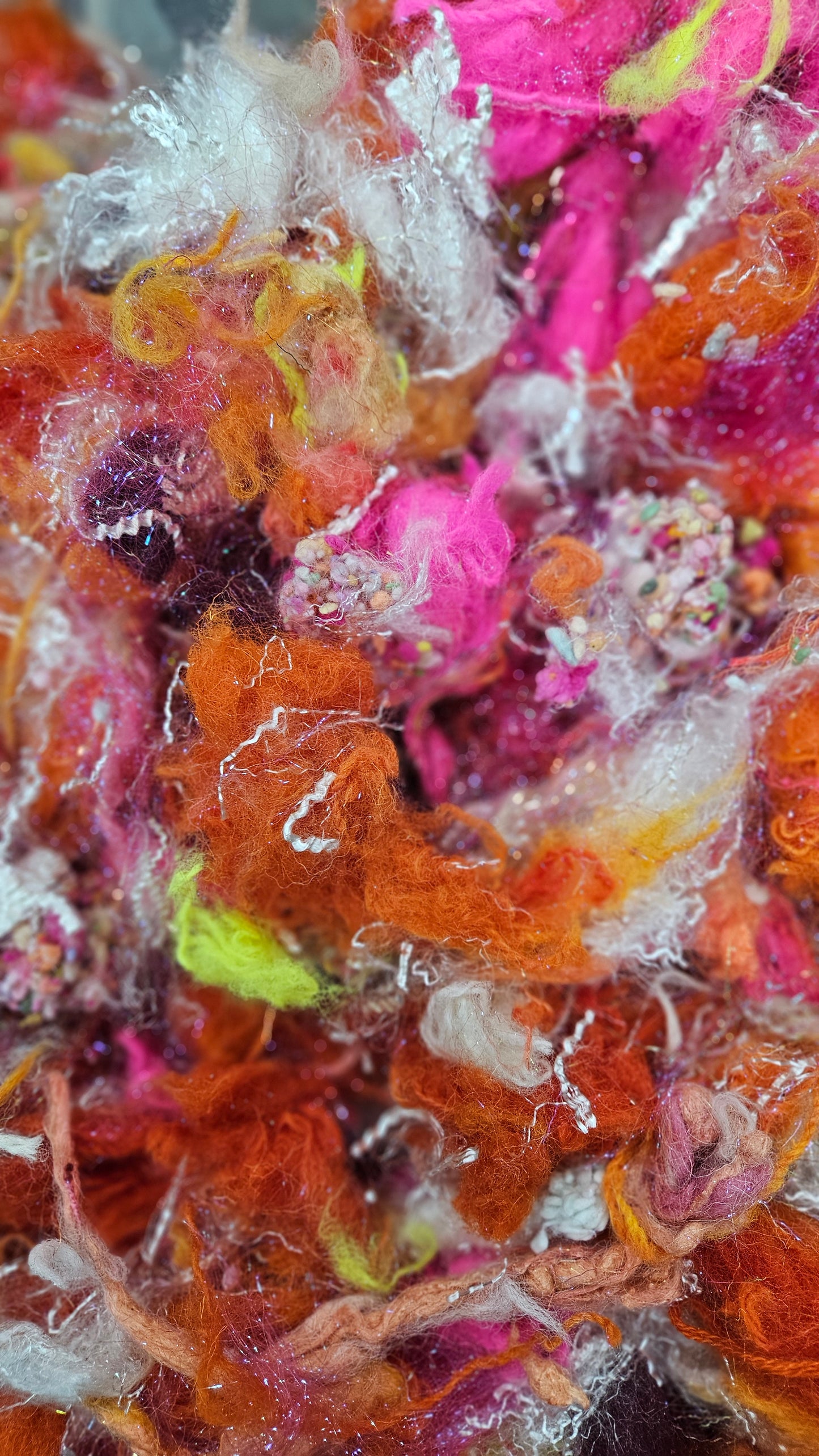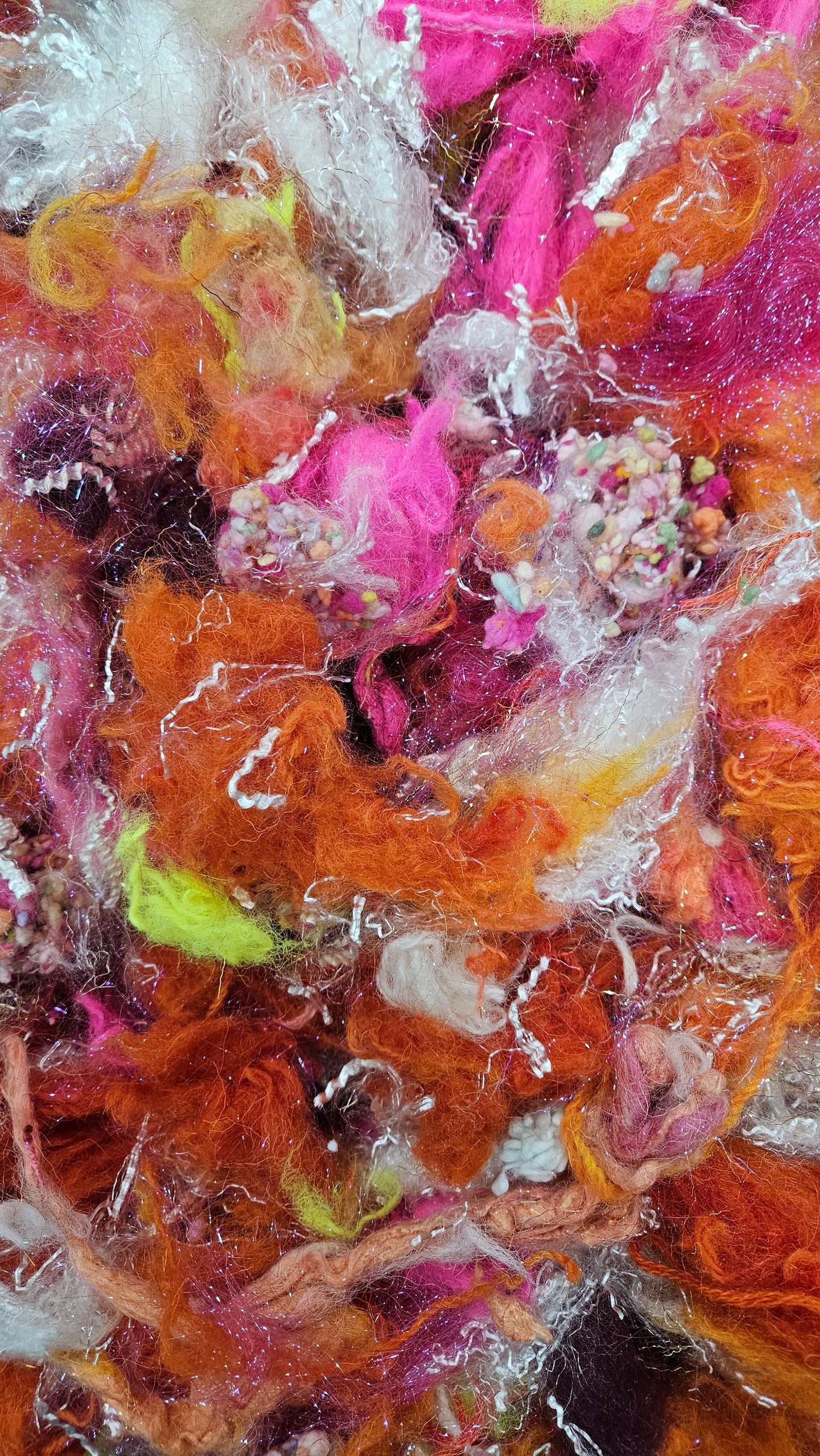 An extra chunky recycled & heritage wool based blend of fibers for blending art batts and rolags to spin into yarn for knitting, weaving, and crochet. One pinch goes a long way! Each bag is subtly different due to the size of the texture and nuance in the dyed bits.