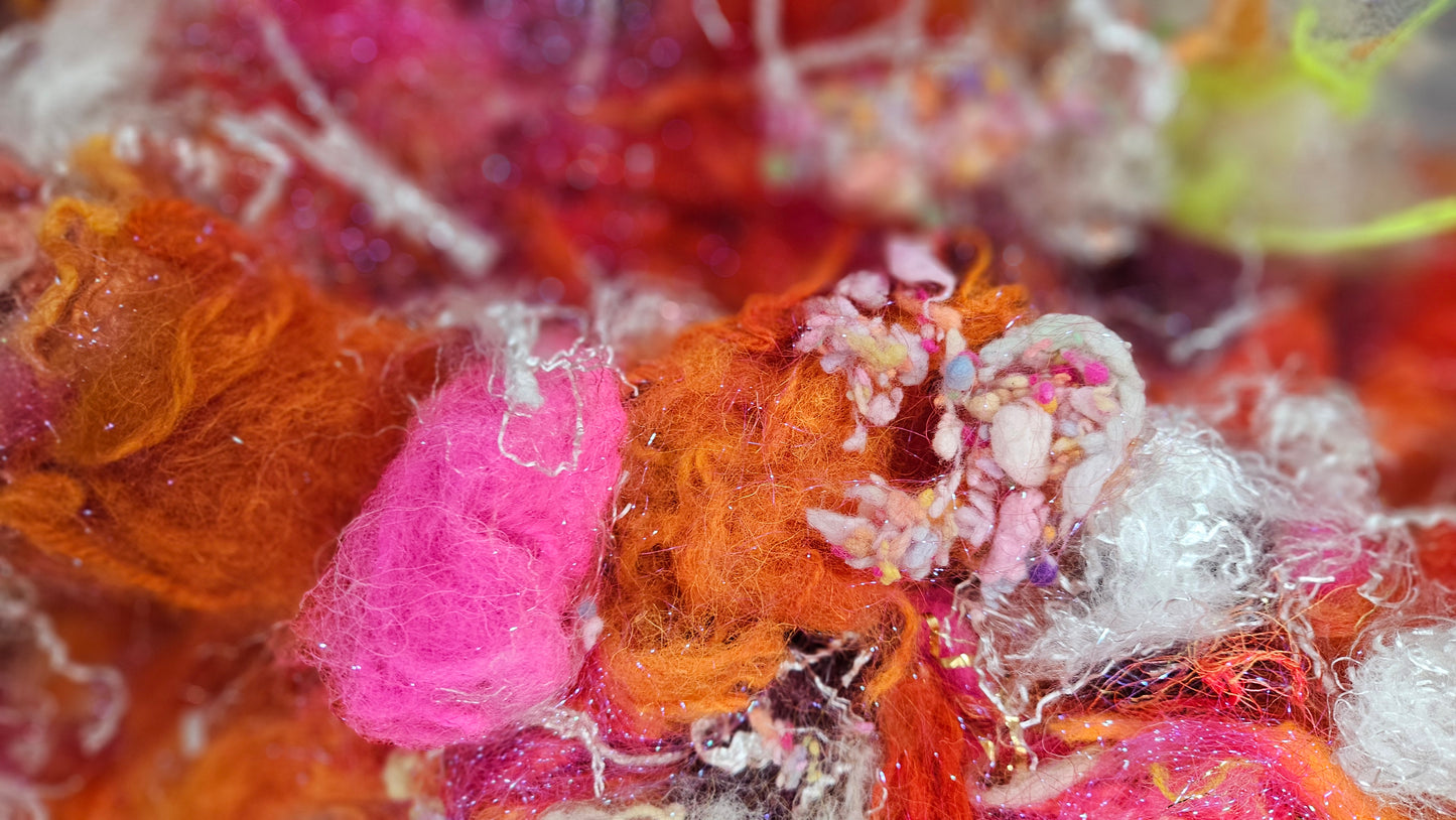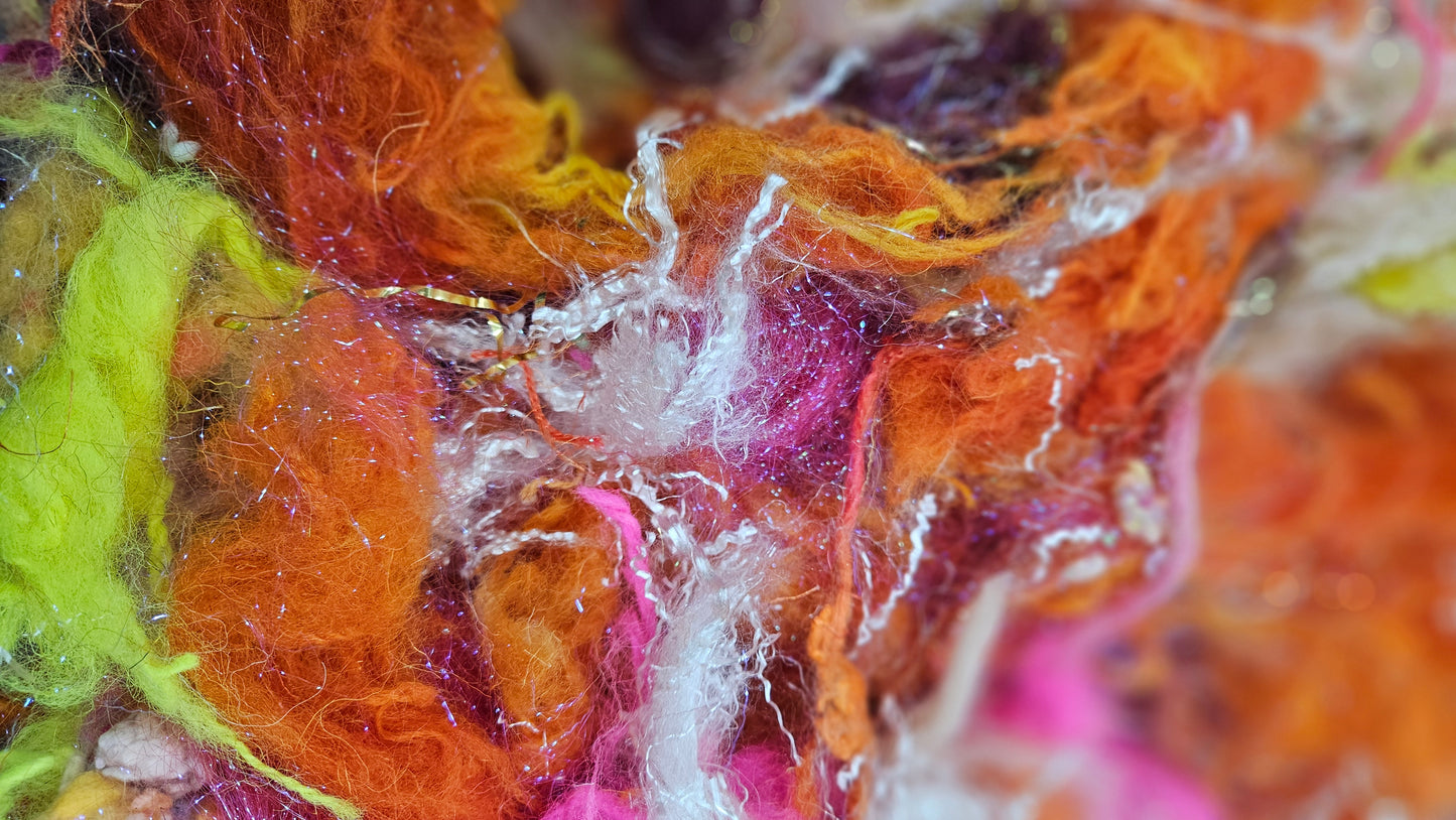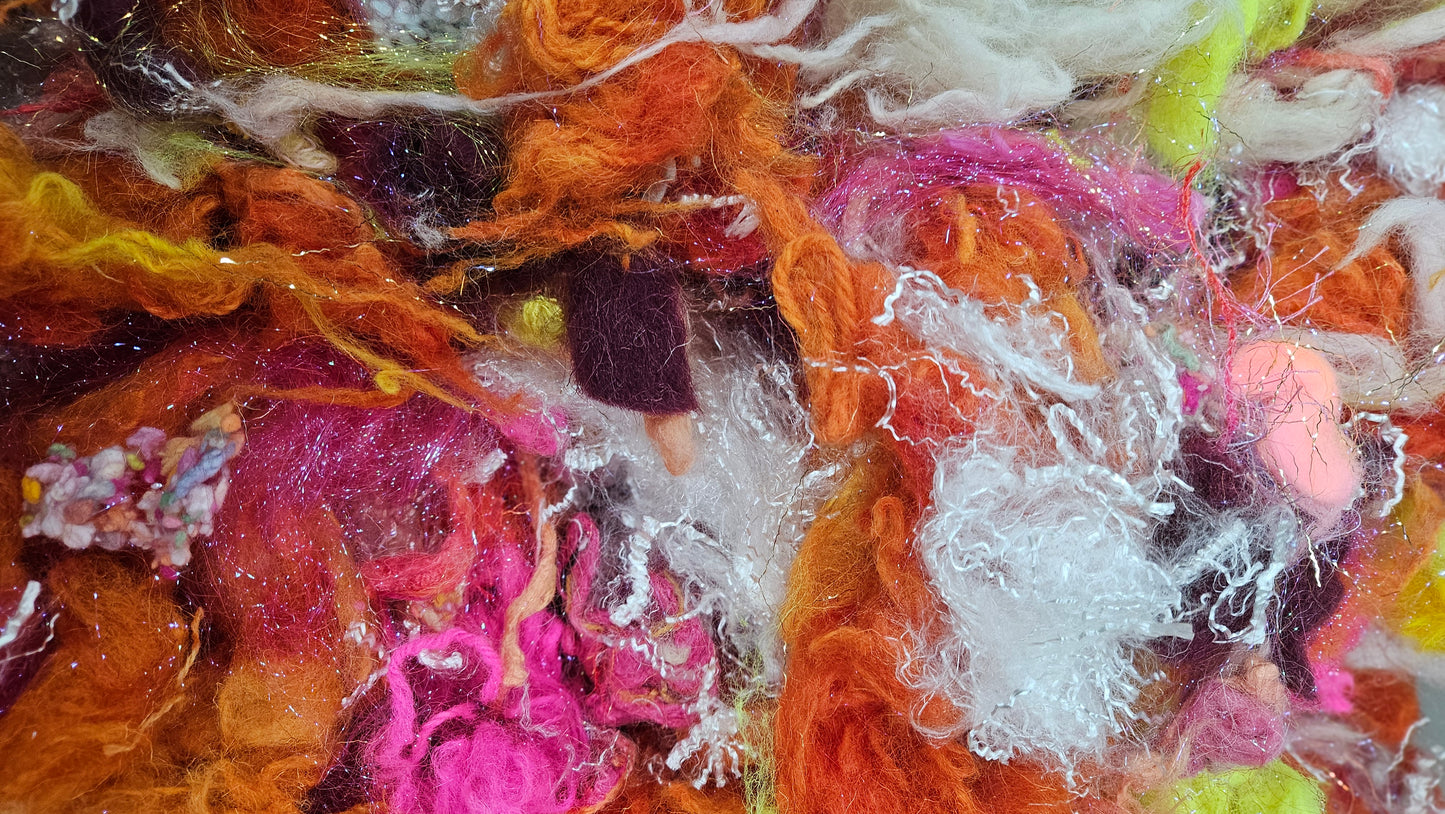 An extra chunky recycled & heritage wool based blend of fibers for blending art batts and rolags to spin into yarn for knitting, weaving, and crochet. One pinch goes a long way! Each bag is subtly different due to the size of the texture and nuance in the dyed bits.