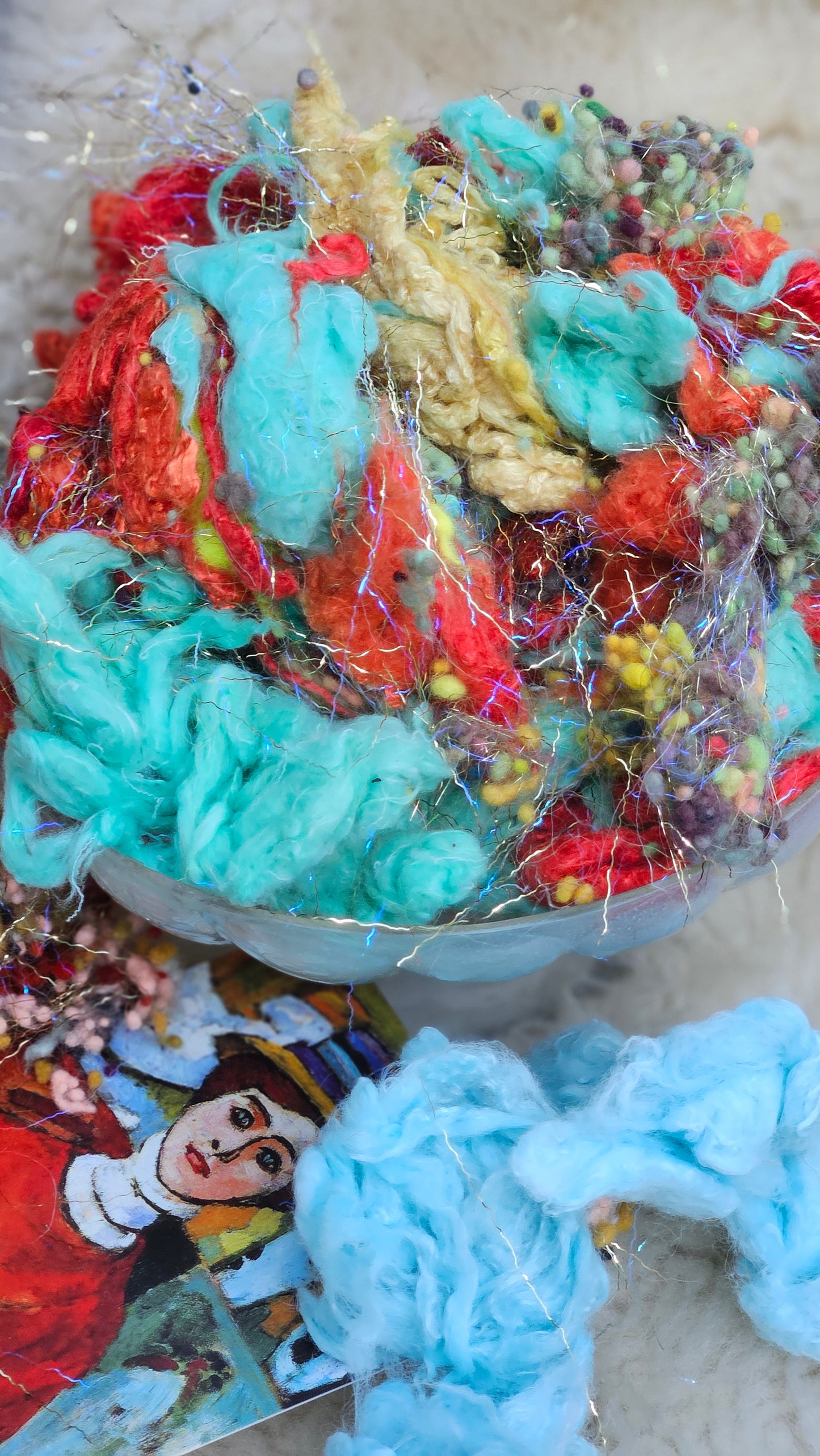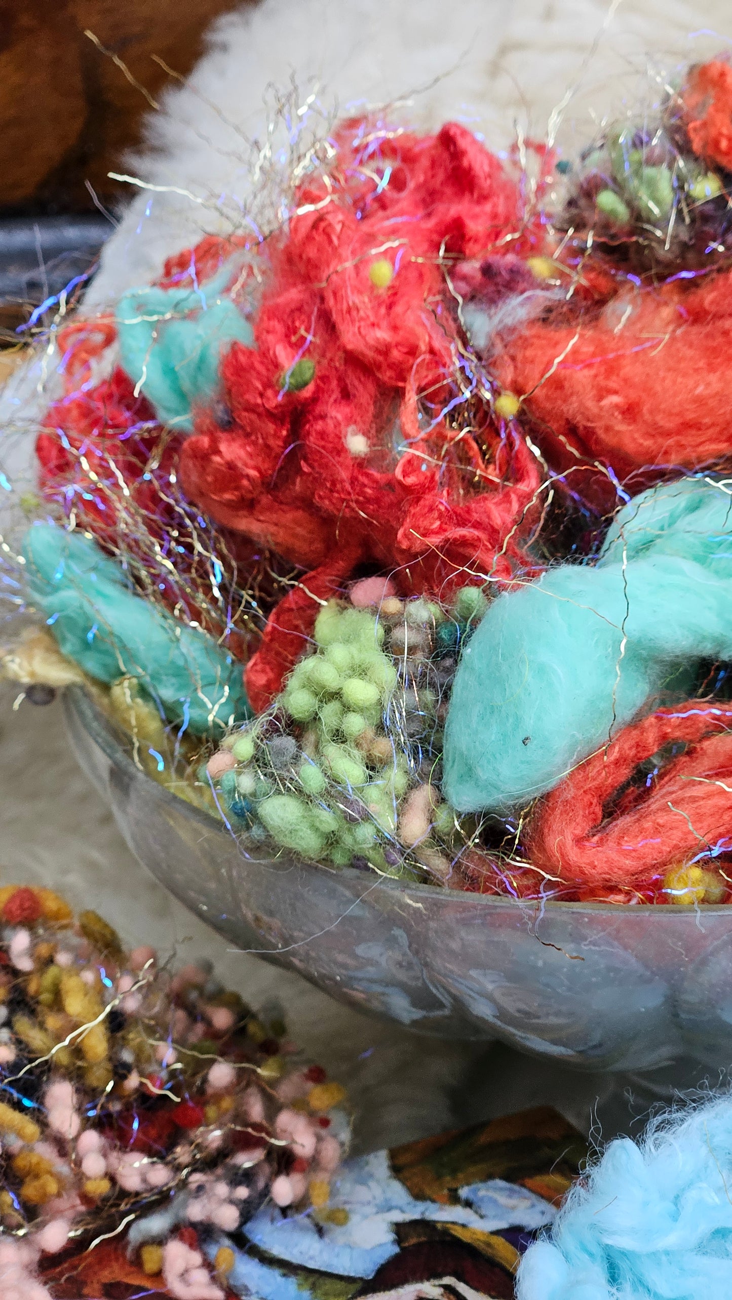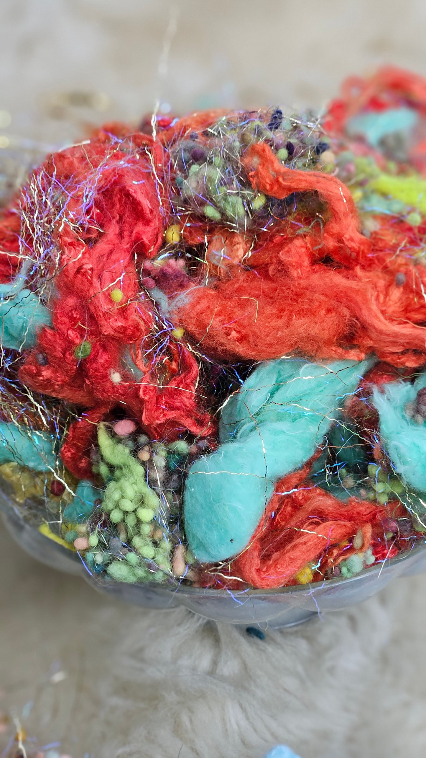 An extra chunky blend of bamboo, cotton, and recycled fibers for creating art batts, rolags, and blends to spin into yarn for knitting, weaving, crochet, felting, and fiber art. A little can go a long way! Each bag is subtly different due to the size of the texture and nuance in the dyed bits.