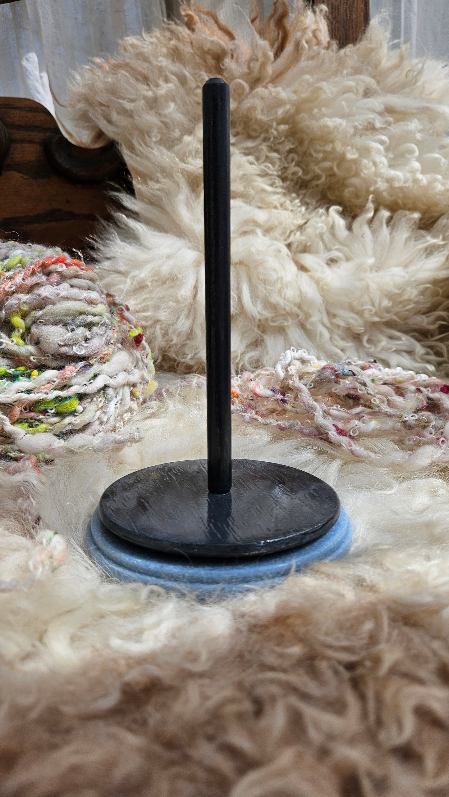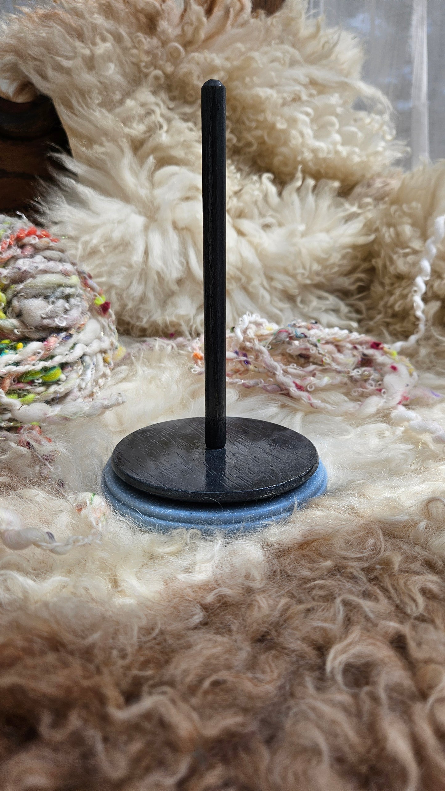 Completely handcrafted in wood and corian. Each is one of a kind. Designed for holding yarn cakes and center pull balls for knitting and crochet. Can be used to hold under 4 inch wide yarn cones for plying. Bearings for smooth payoff of yarn from ball or cone.
