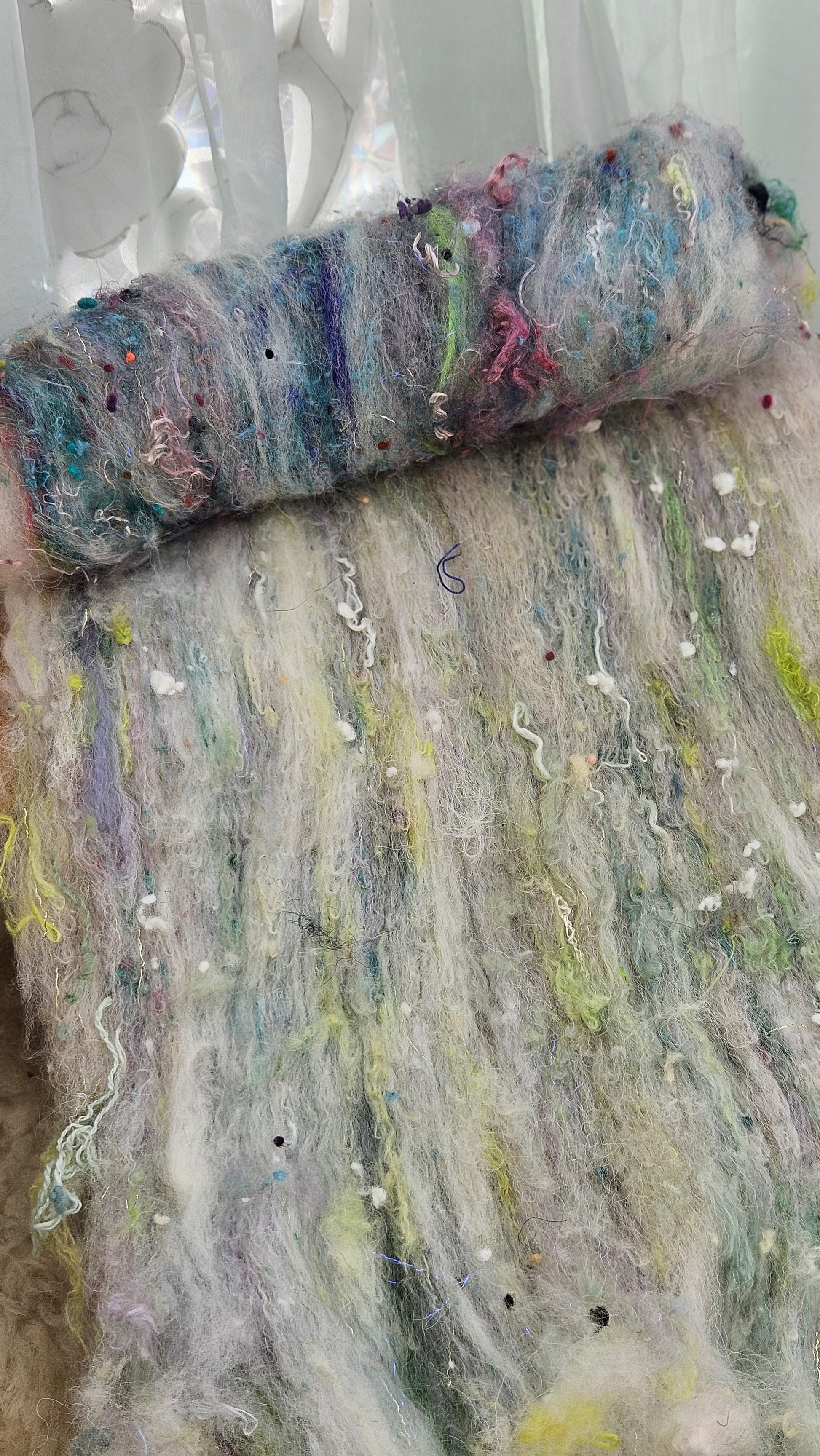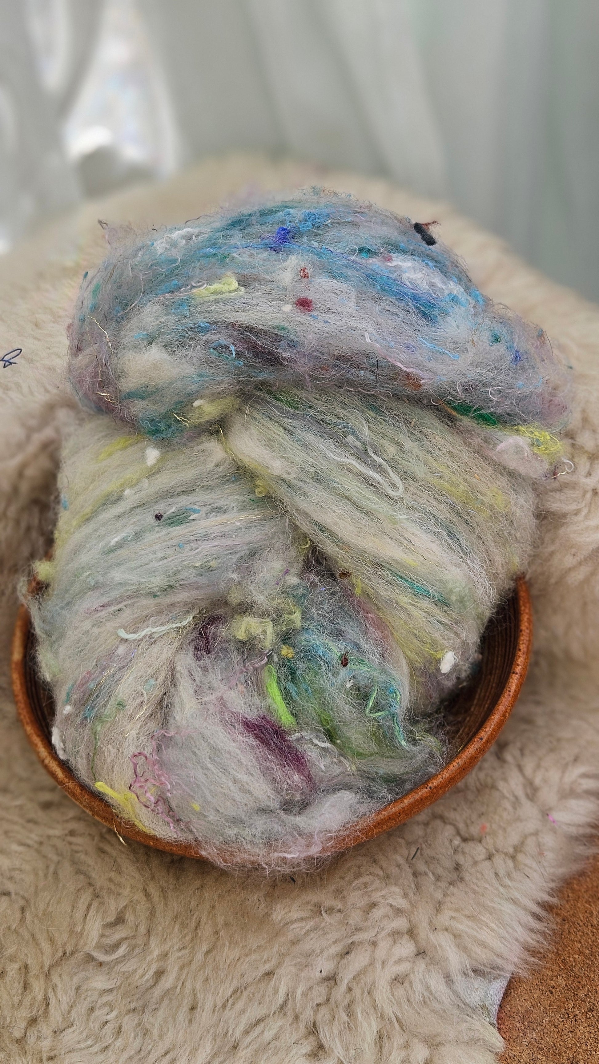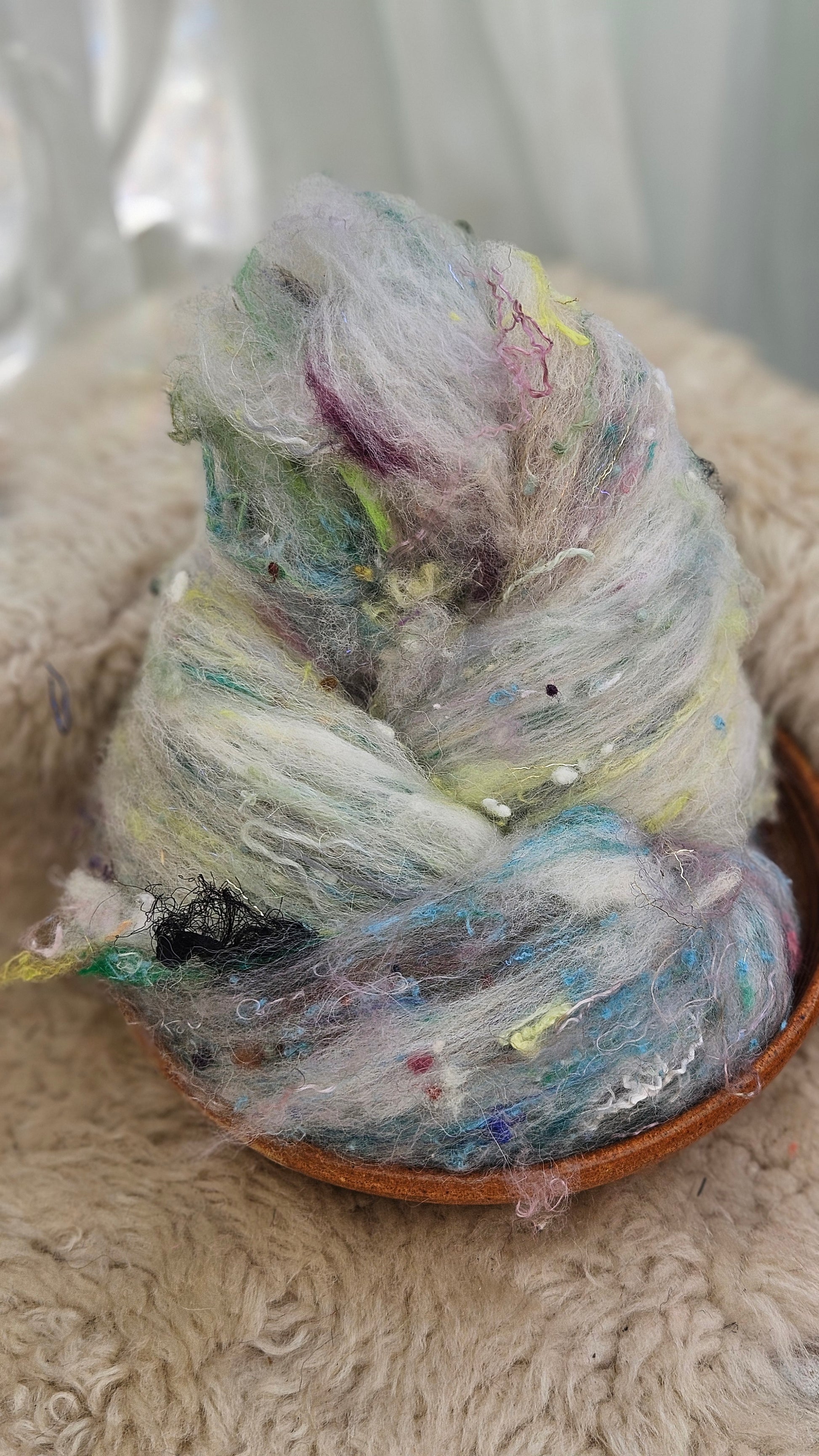 Some trace lanolin may be present in some batts due to the nature of the fine wool used in the base. Ideal for spinning art yarn especially and including corespinning.
