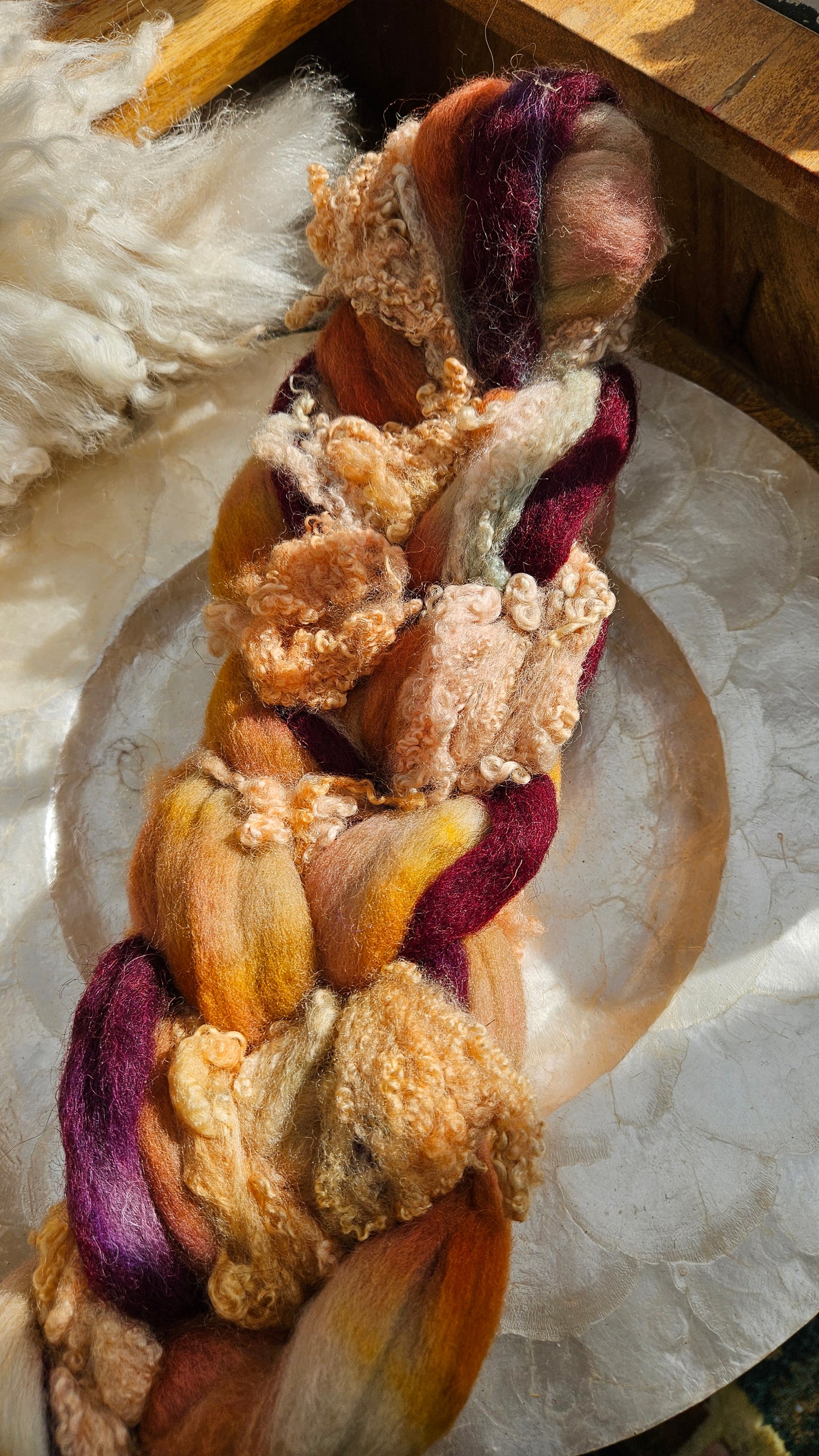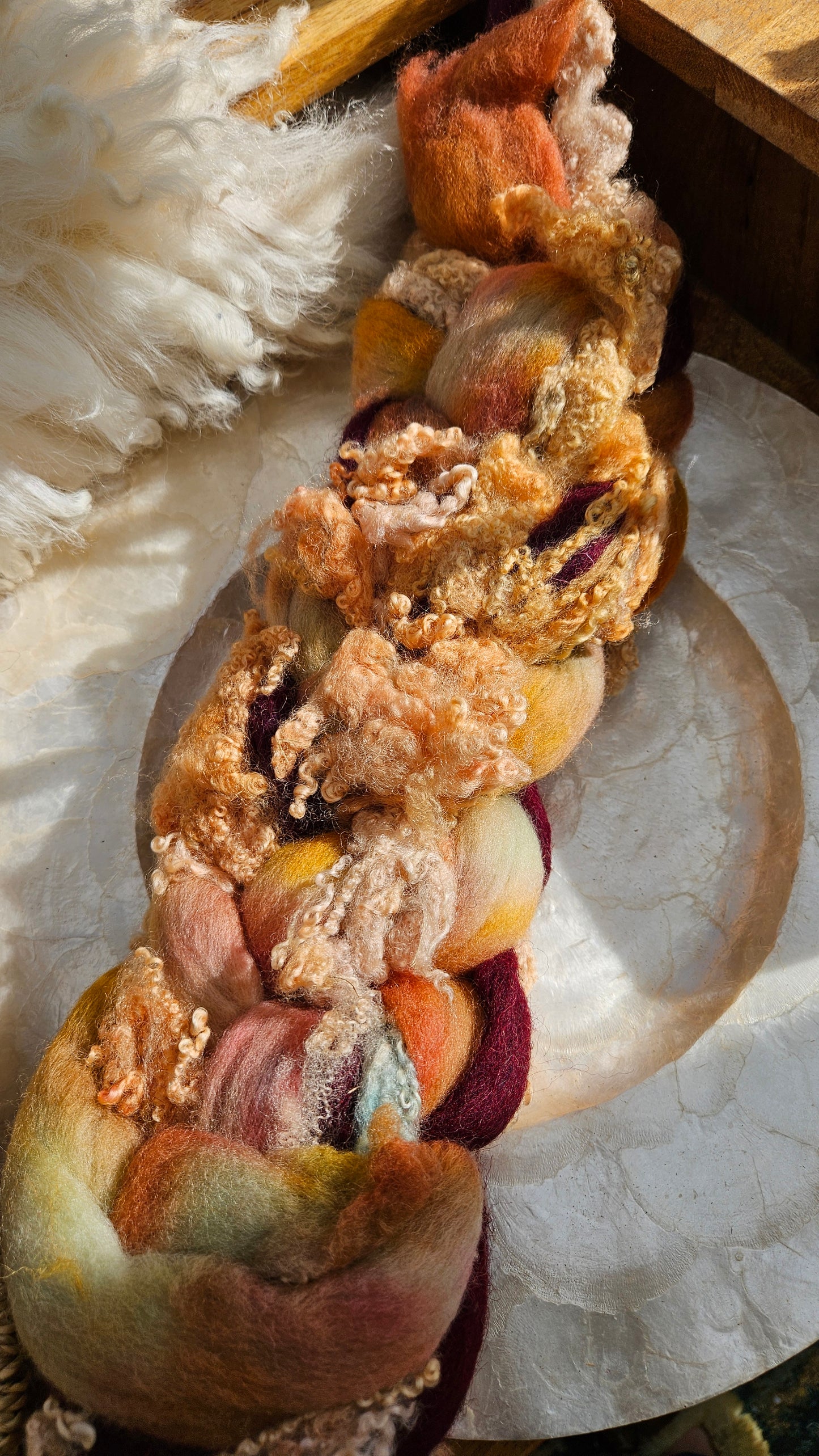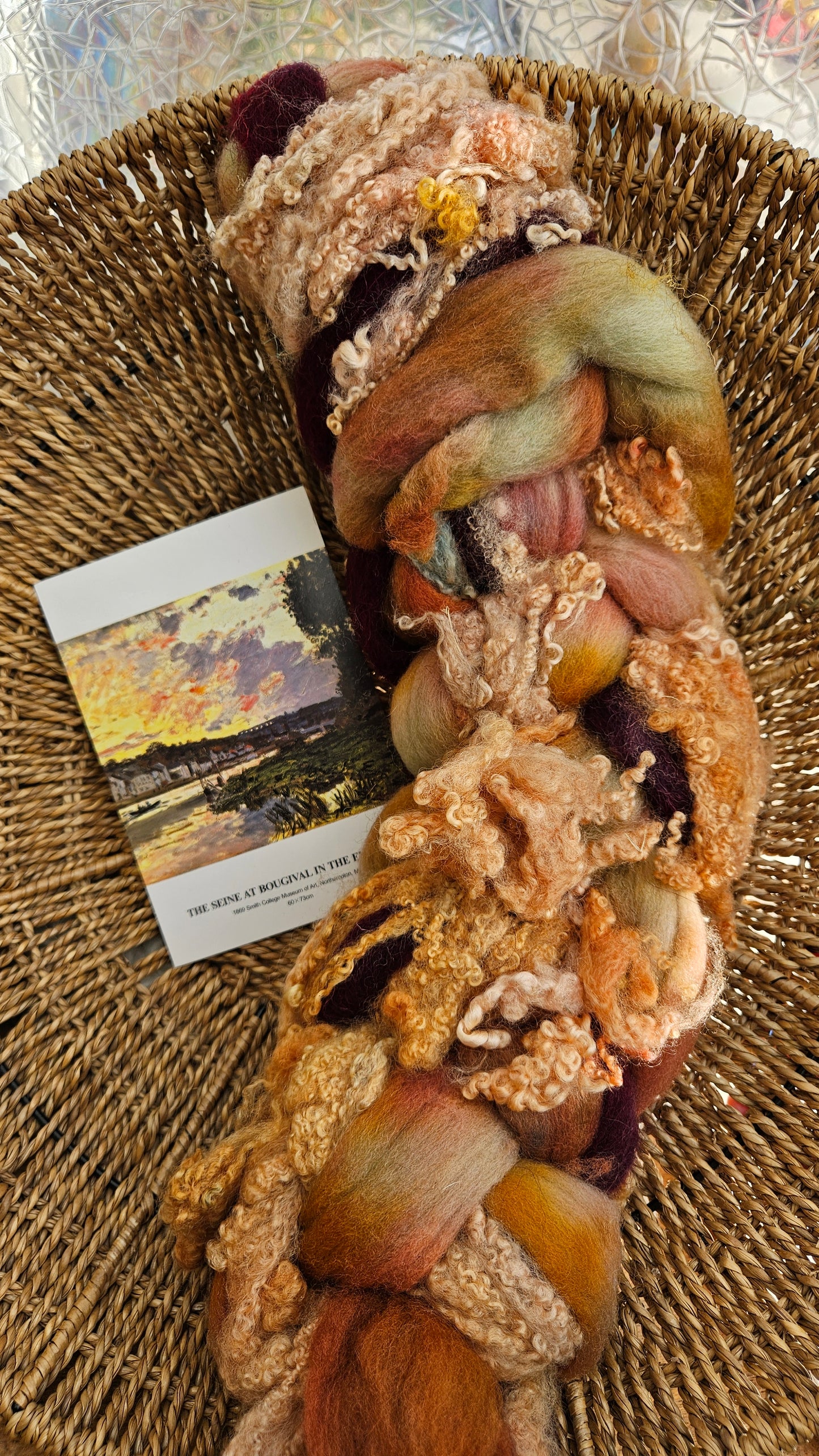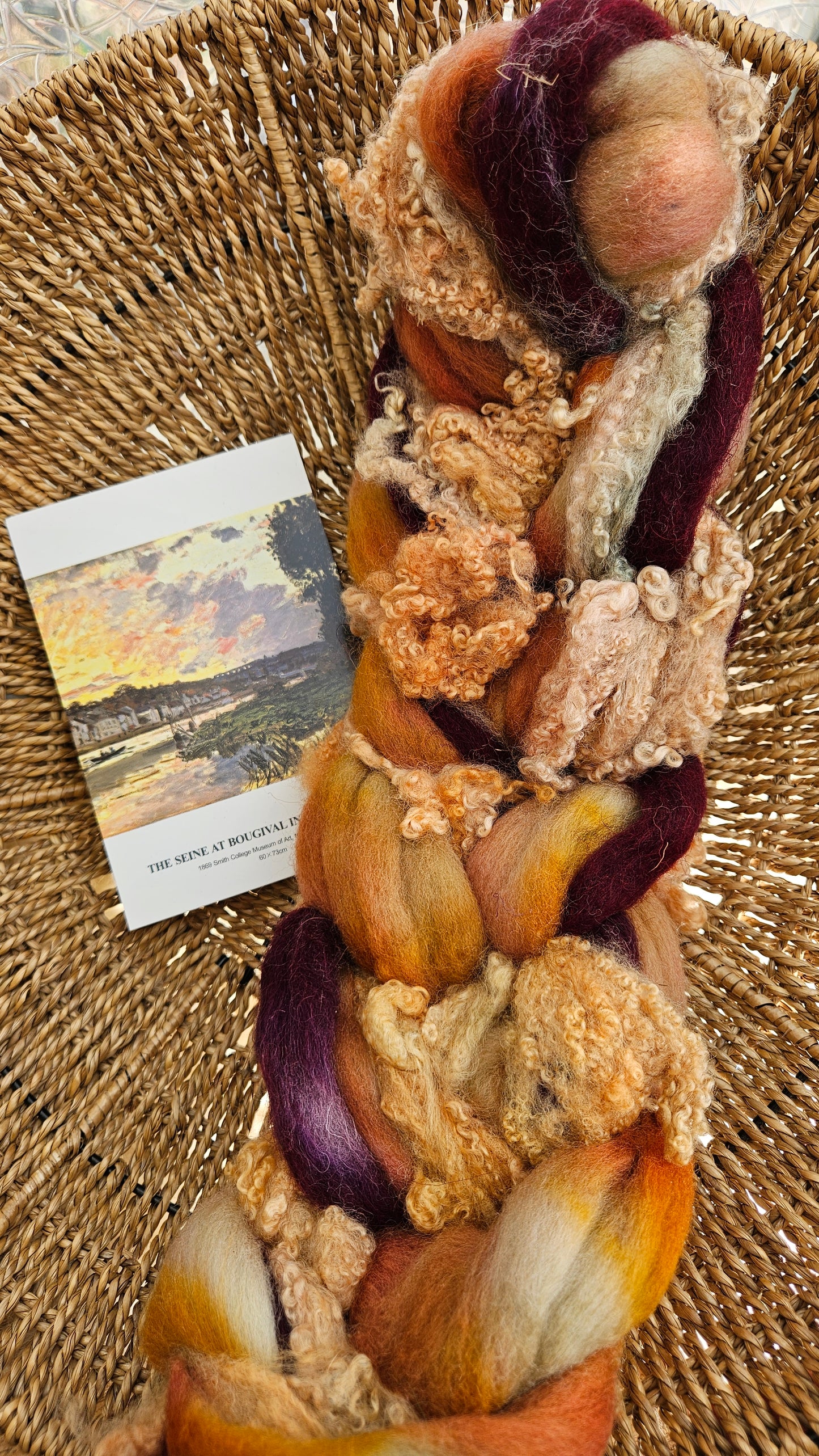 Inspired by the impressionist paintings of Waterhouse using his timeless fine art colorway pallete. Each wool roving braid includes multiple breeds and textures of high quality fiber for blending and carding into art batts or spinning into yarn directly from the braid.