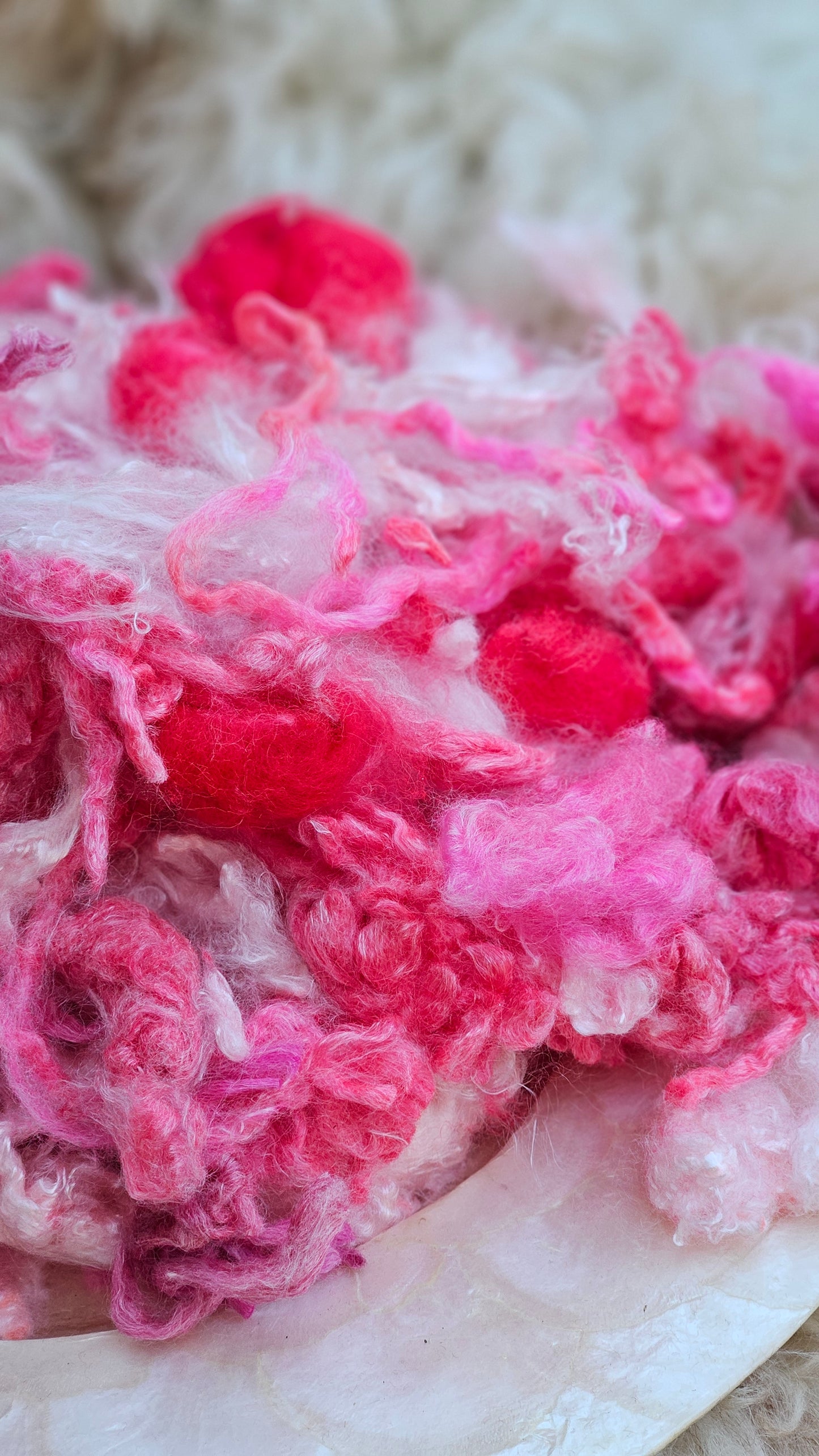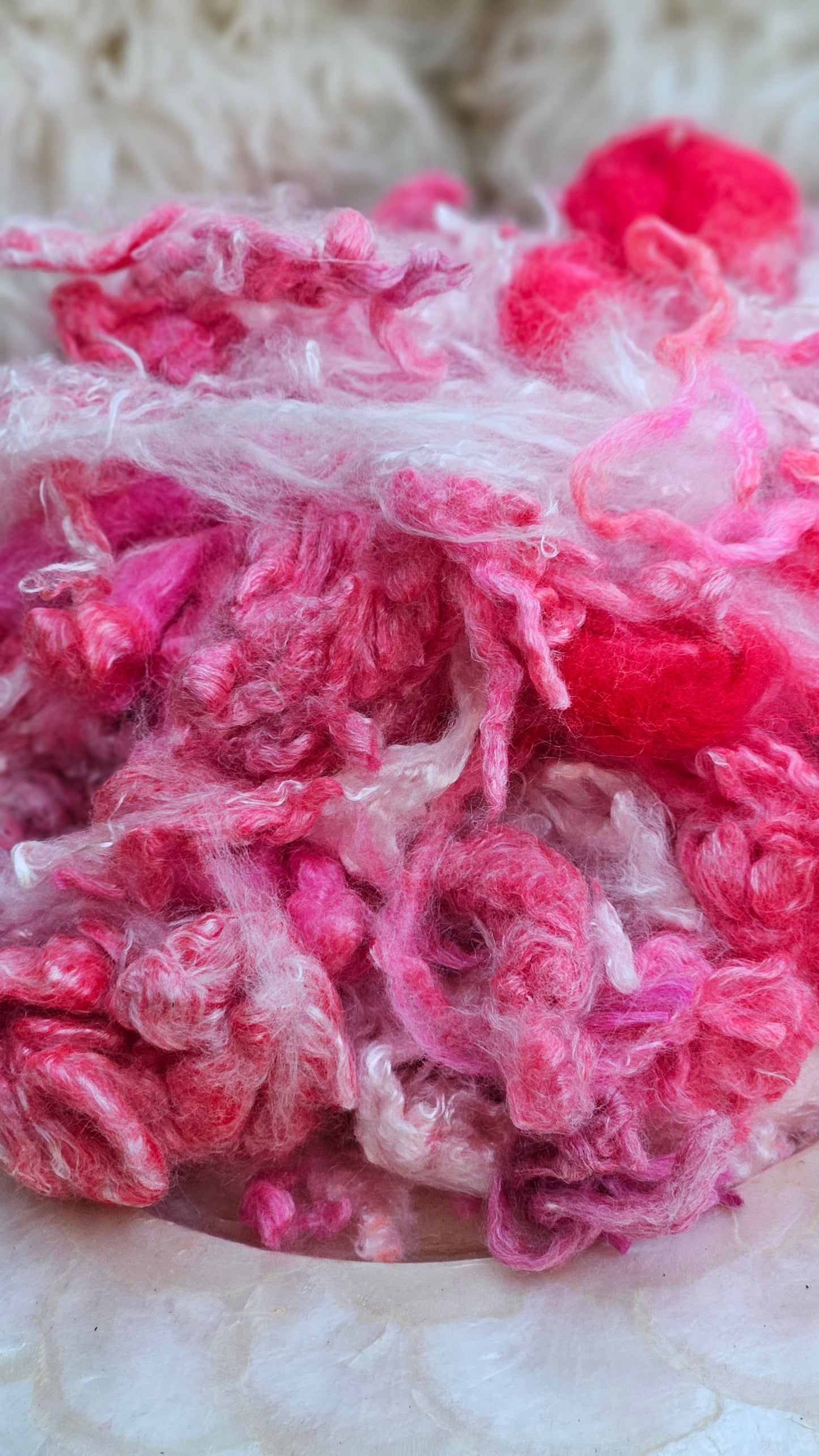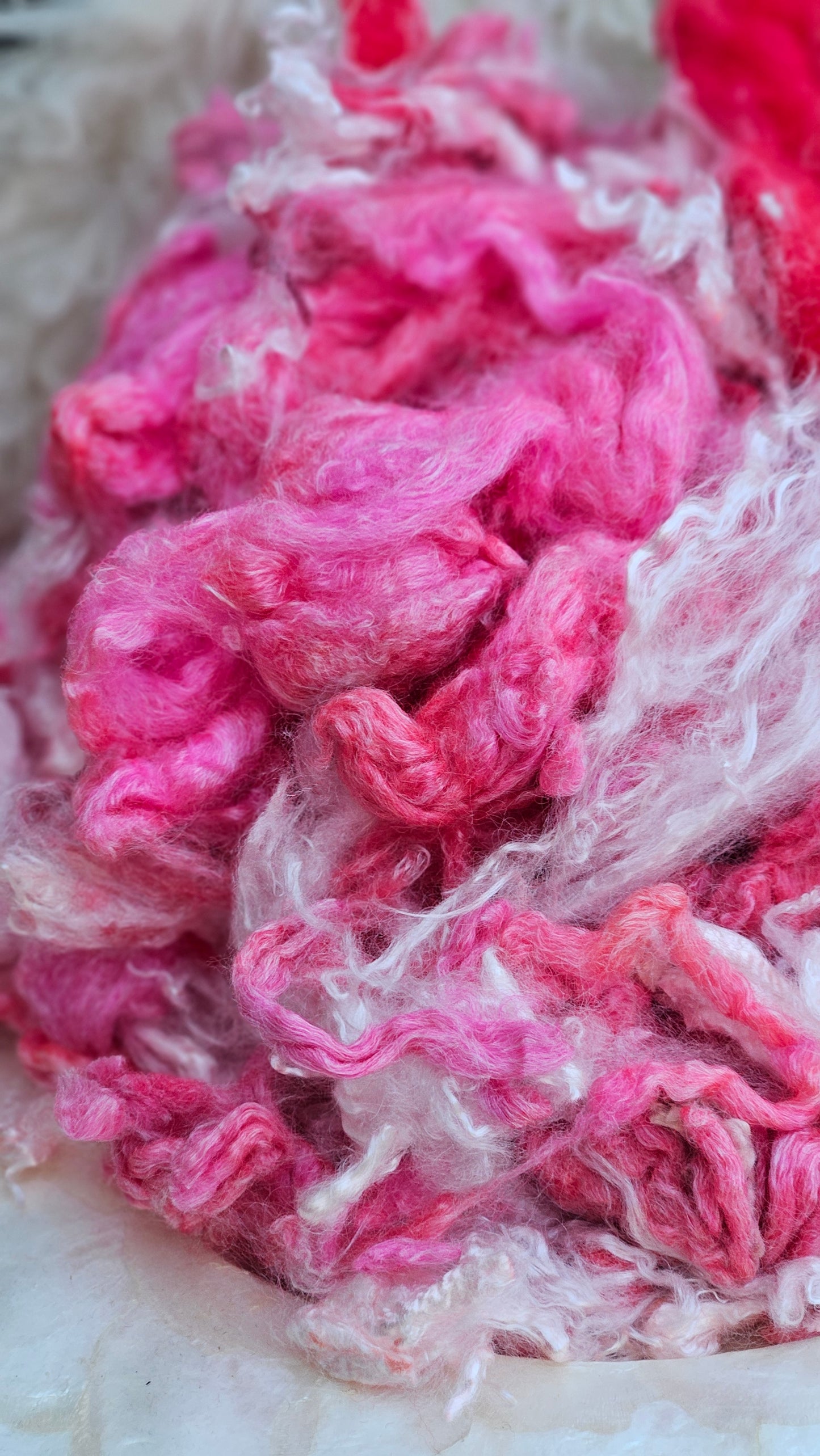 These dense mallowy chunks can be hand-picked very easily to create a fluffy cloud. Running it thru a wool picker would create divine fluffy cloud. This zero-waste fiber is a perfect foundation for art batts, felting, and fiber art.