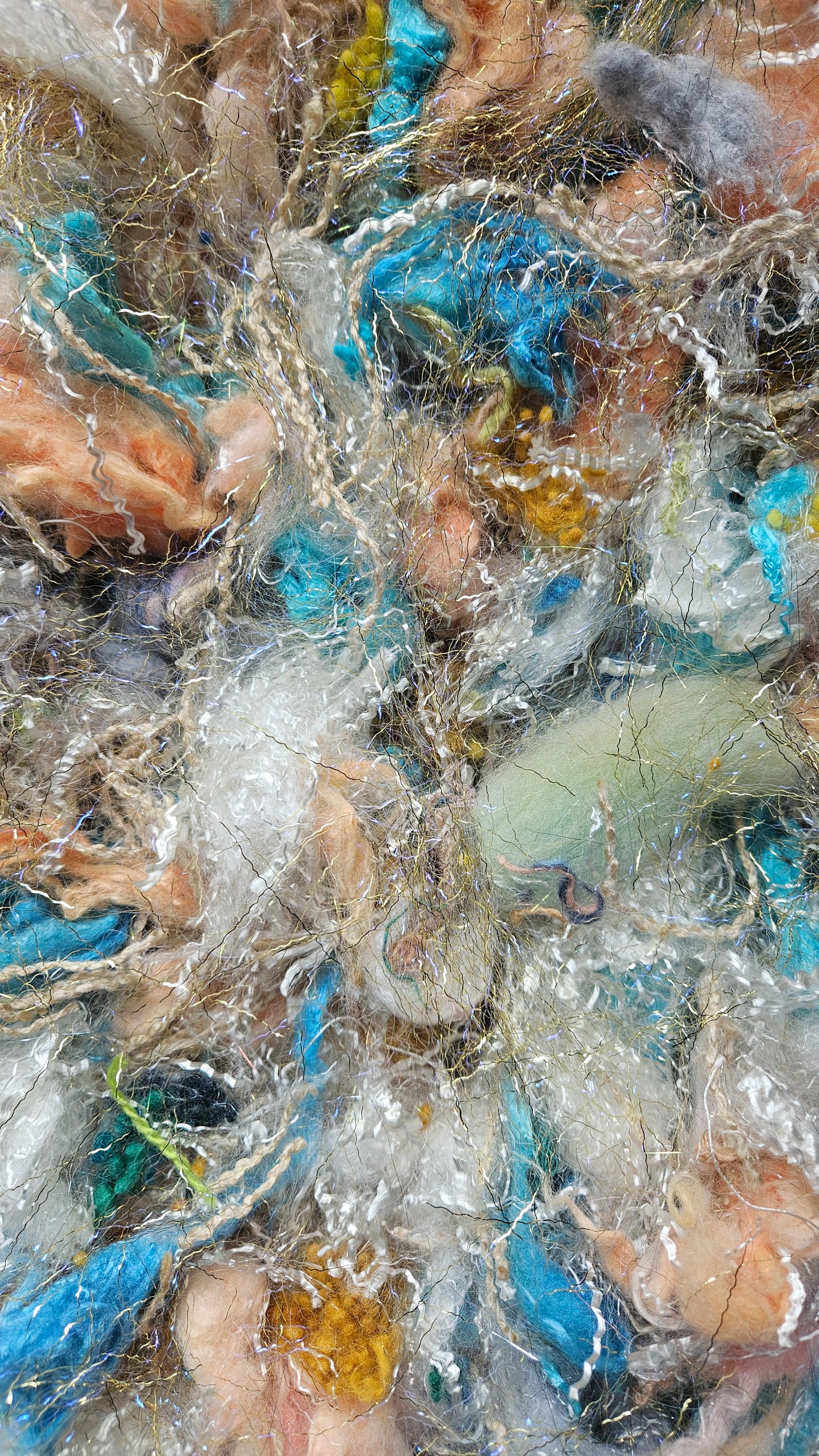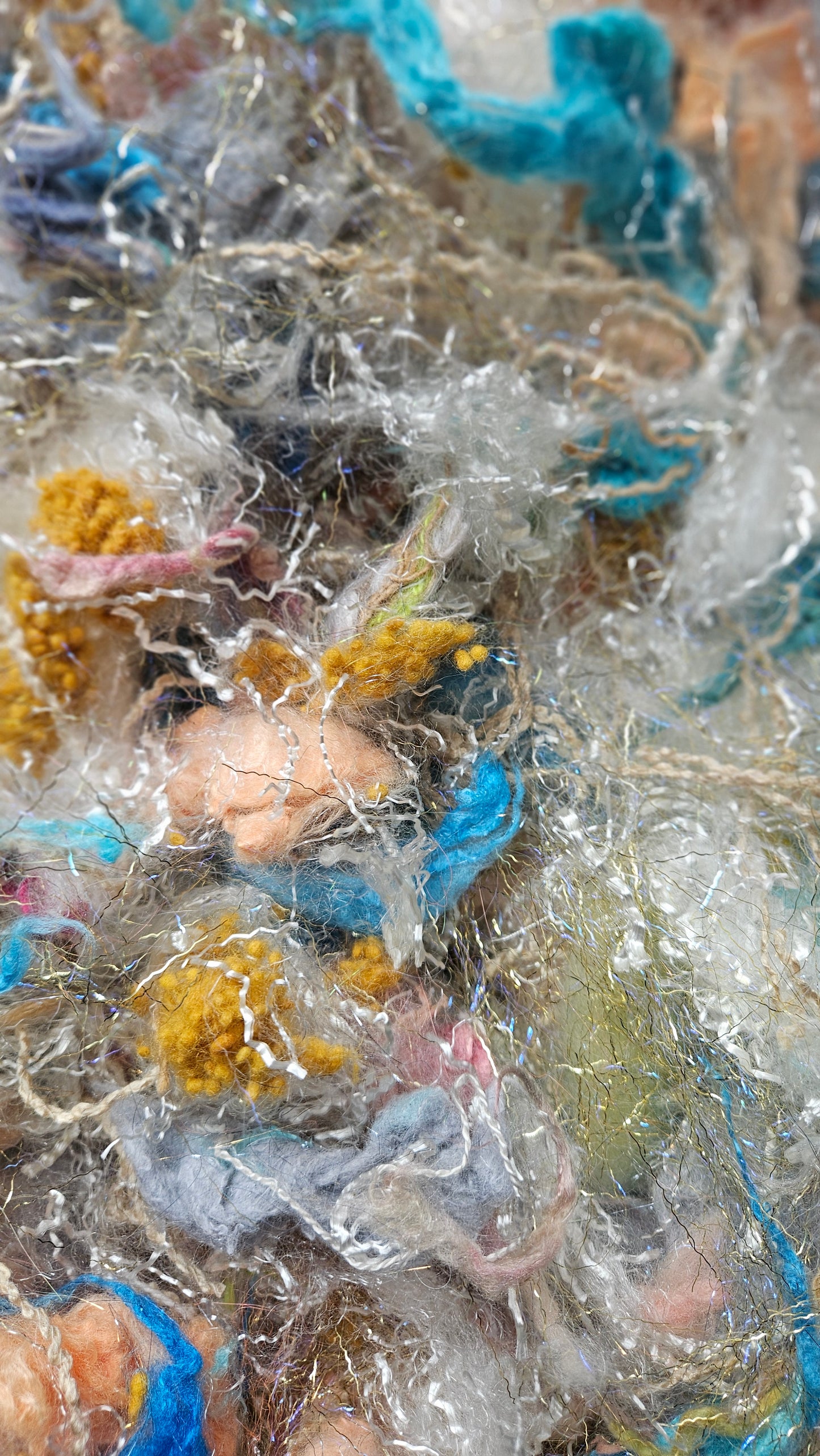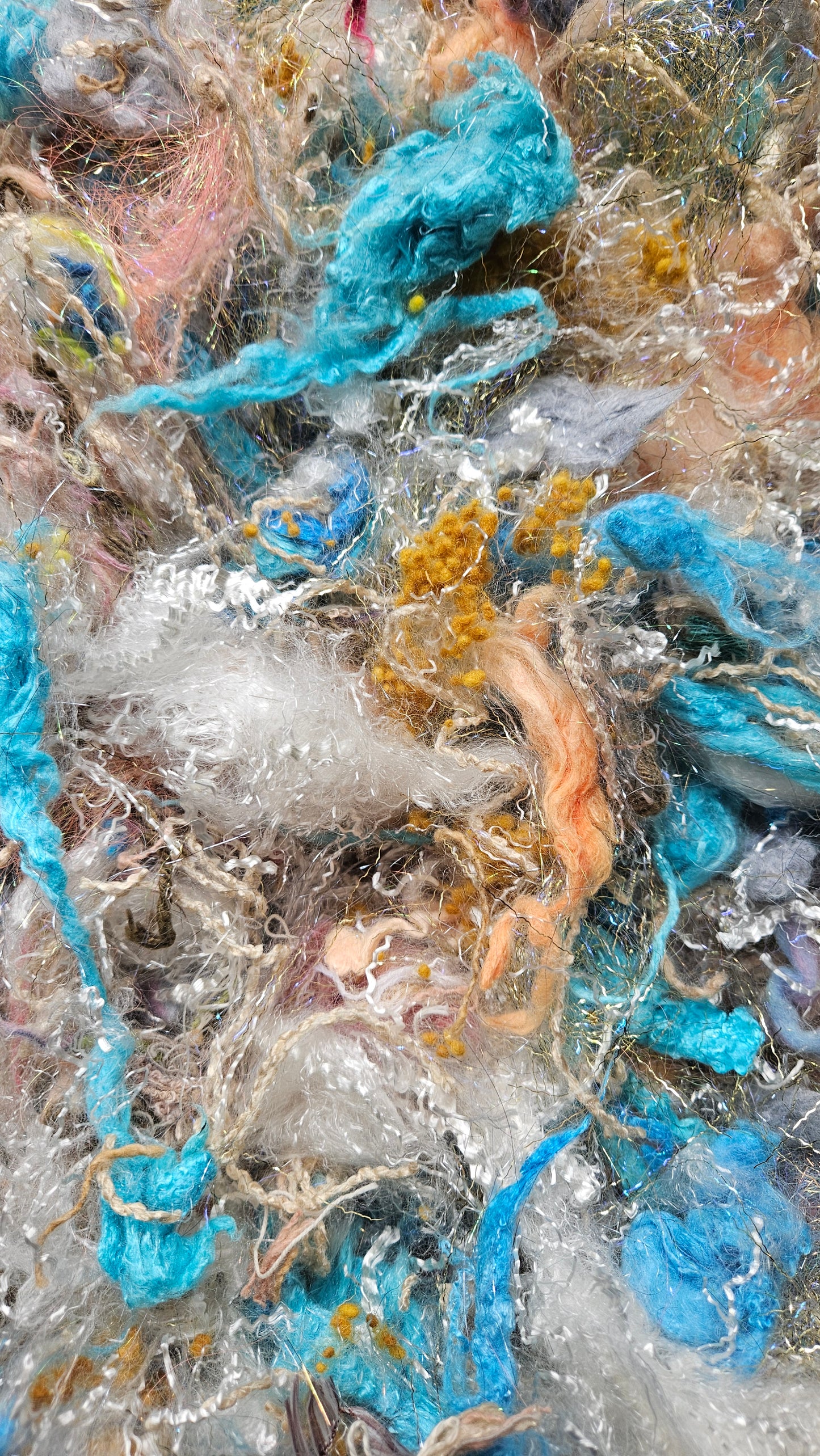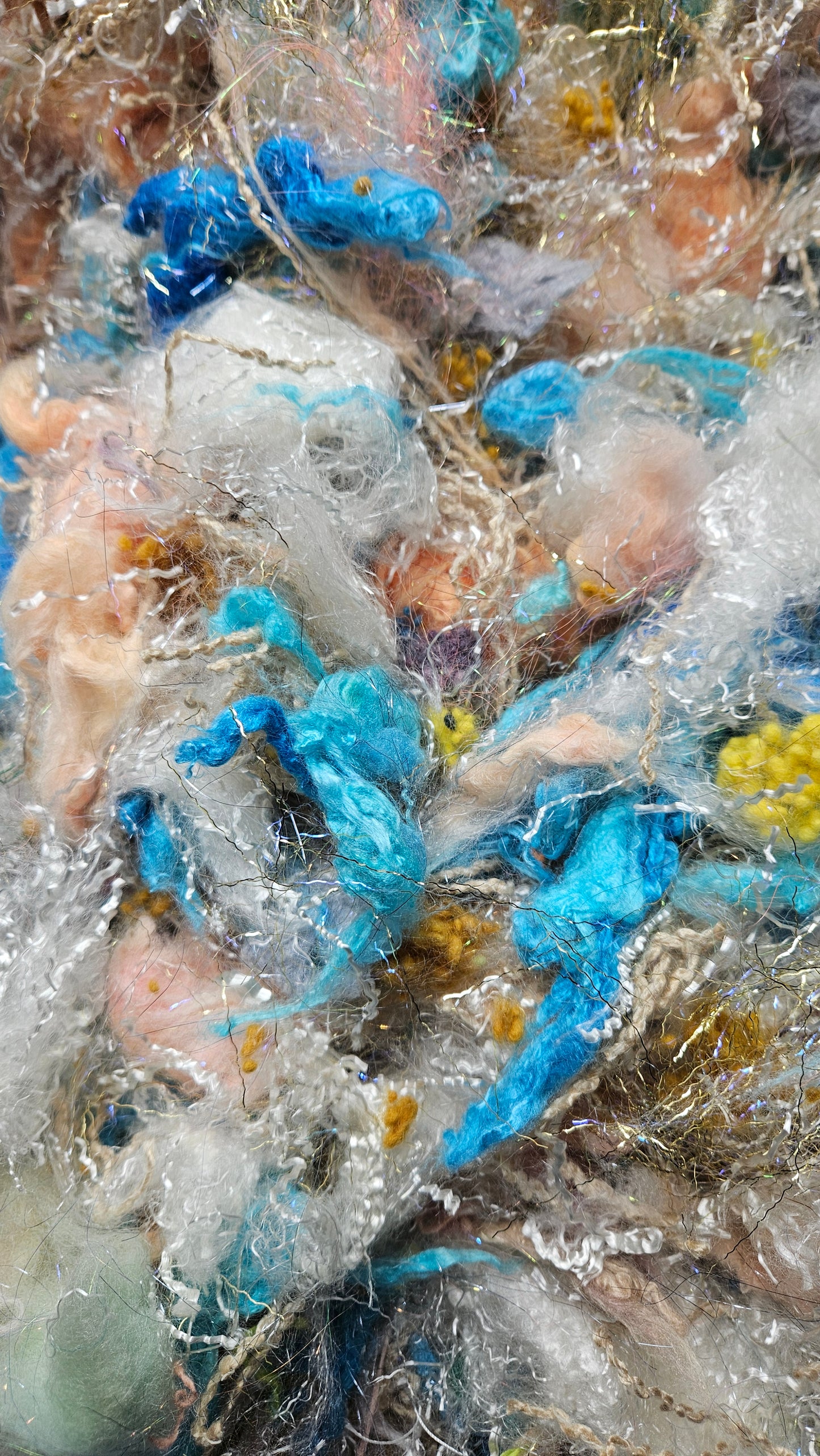 A kit of fine art inspired eucalyptus crimp texture and wool nepps for creating art batts, rolags, and blends to spin into yarn for knitting, weaving, crochet, felting, and fiber art. A little can go a long way! Each bag is subtly different due to the size of the texture and nuance in the dyed bits.