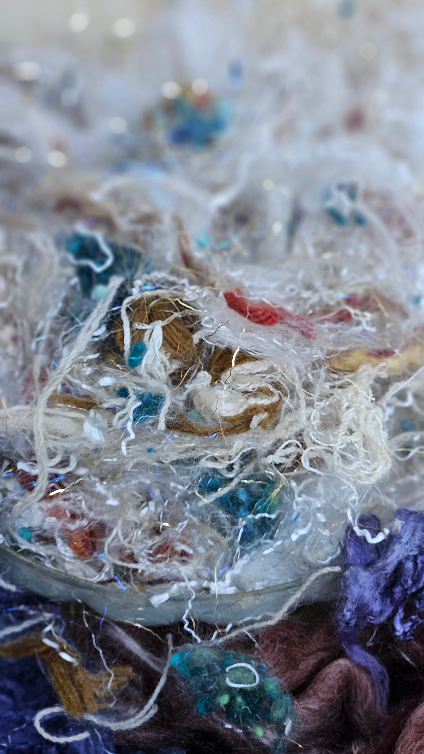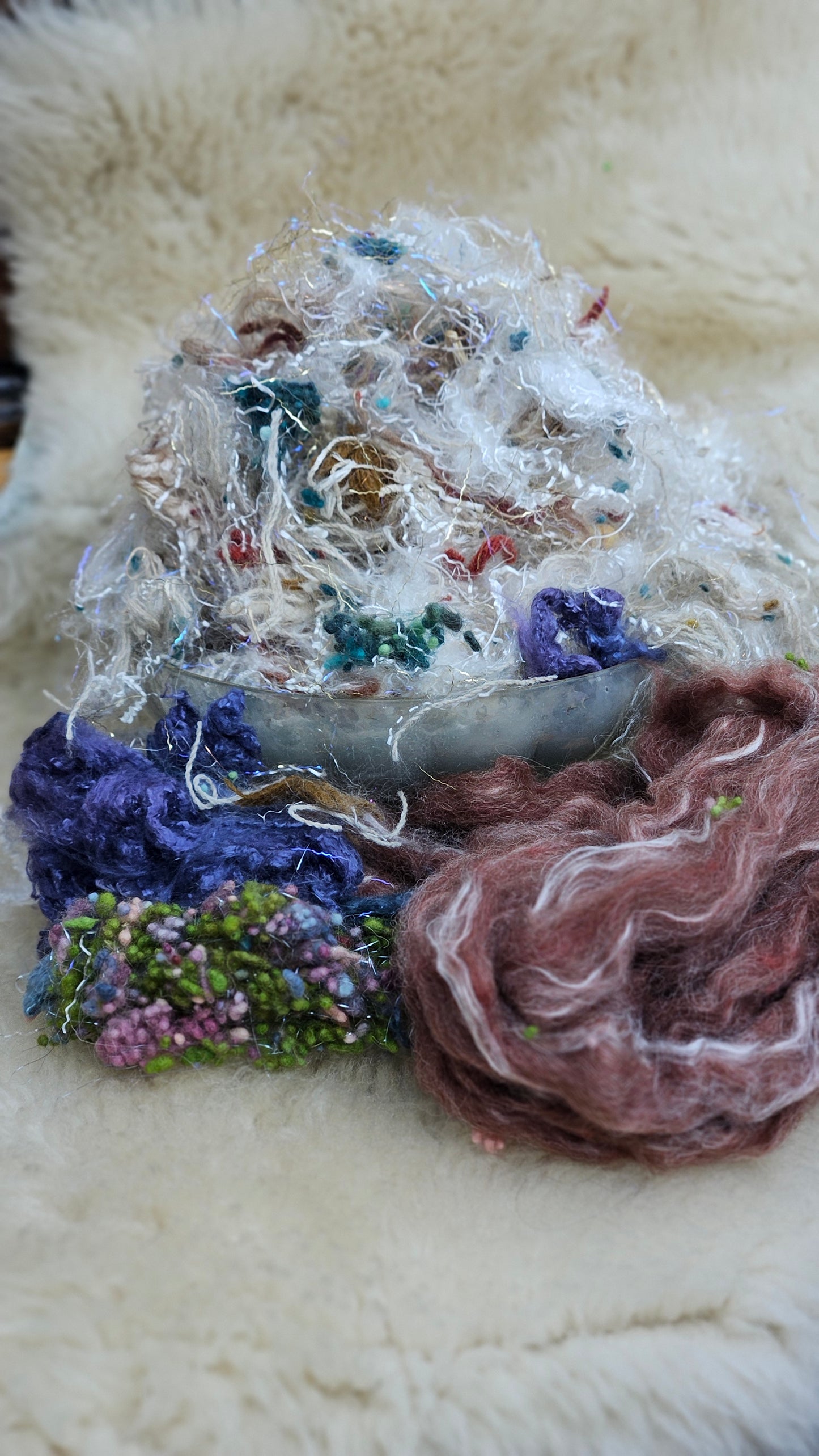 A 2.5 ounce kit of fine art inspired extra chunky texture and fiber for creating art batts, rolags, and blends to spin into yarn for knitting, weaving, crochet, felting, and fiber art. A little can go a long way! Each bag is subtly different due to the size of the texture and nuance in the dyed bits.