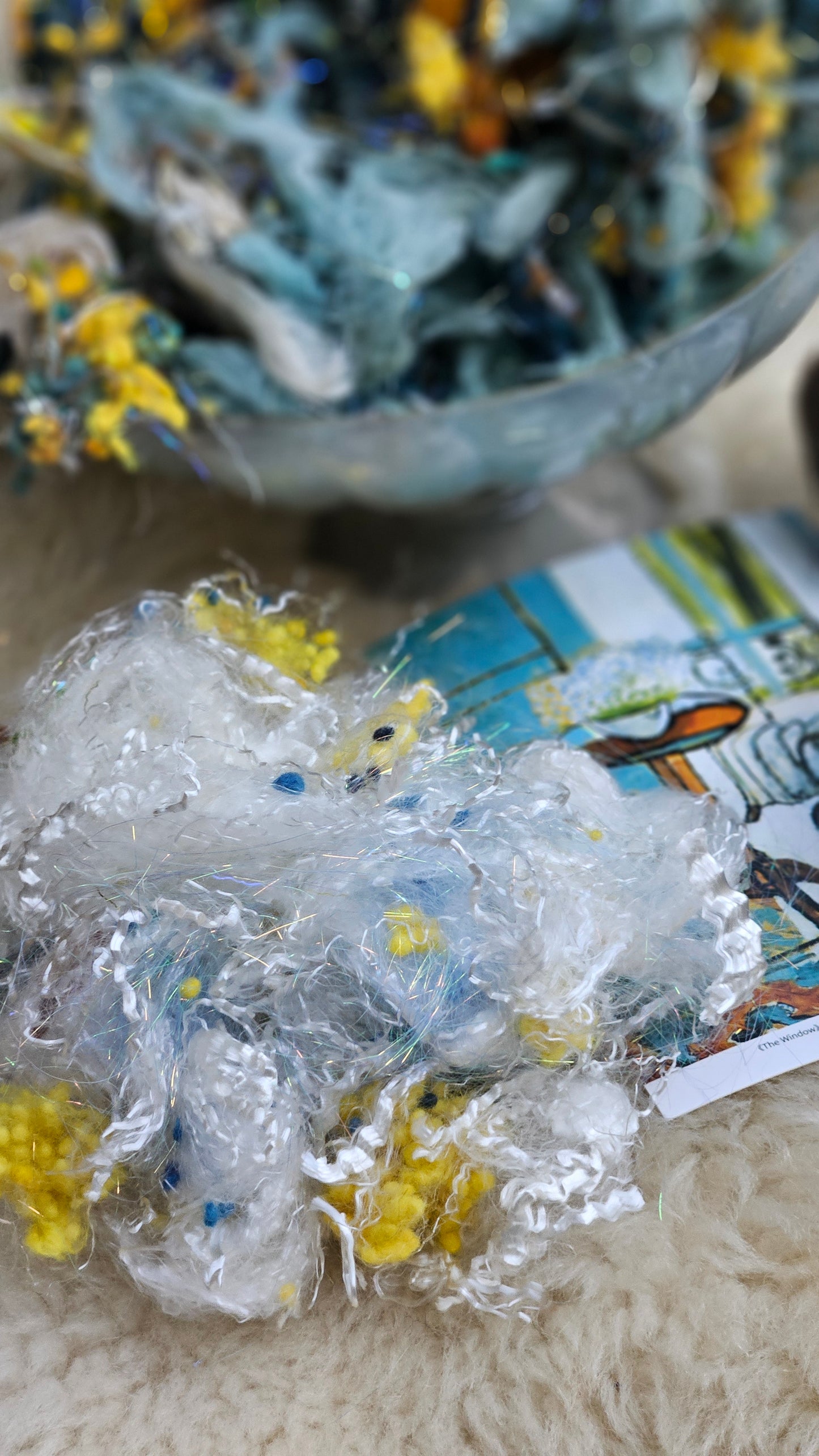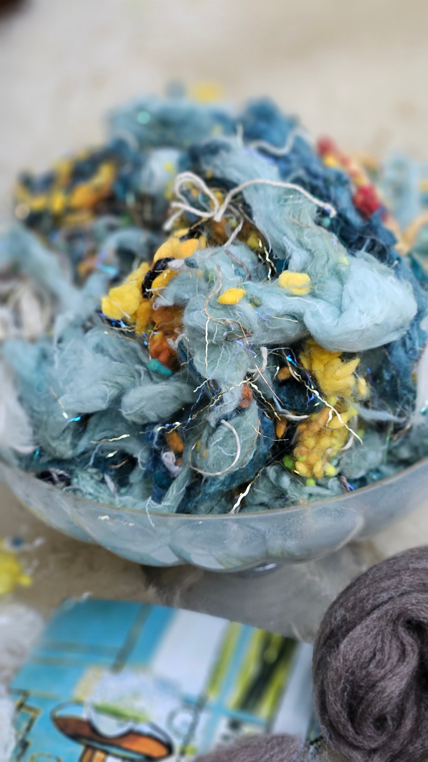 An extra chunky blend of cotton, bamboo, and recycled fibers for creating art batts, rolags, and blends to spin into yarn for knitting, weaving, crochet, felting, and fiber art. A little can go a long way! Each bag is subtly different due to the size of the texture and nuance in the dyed bits.