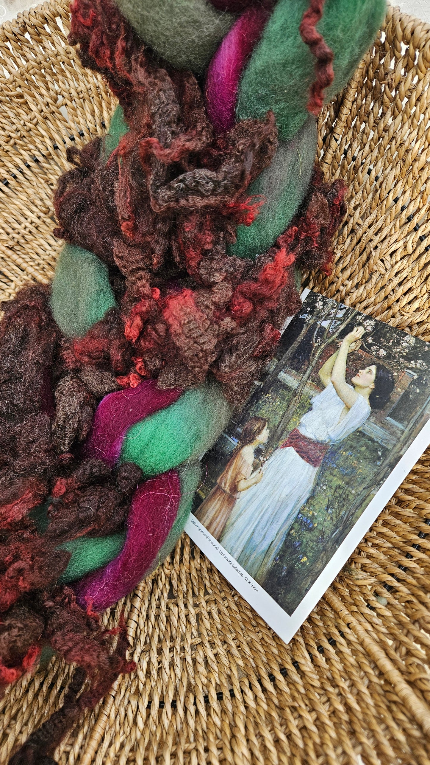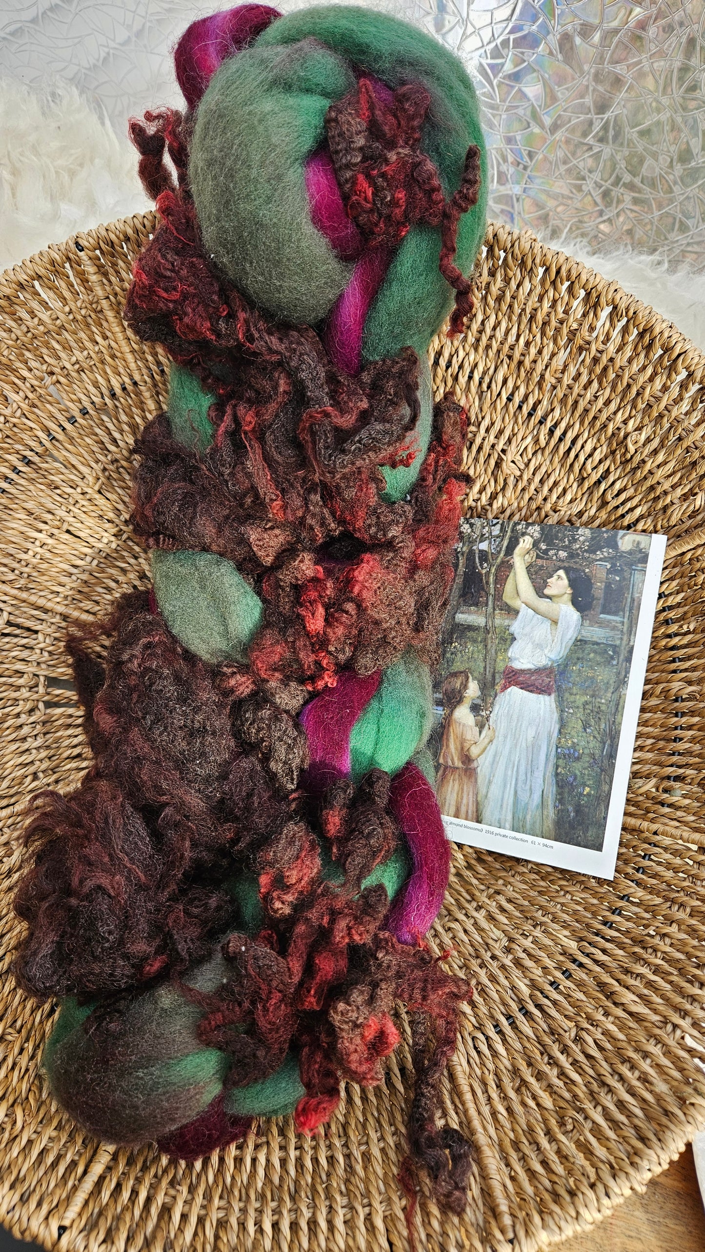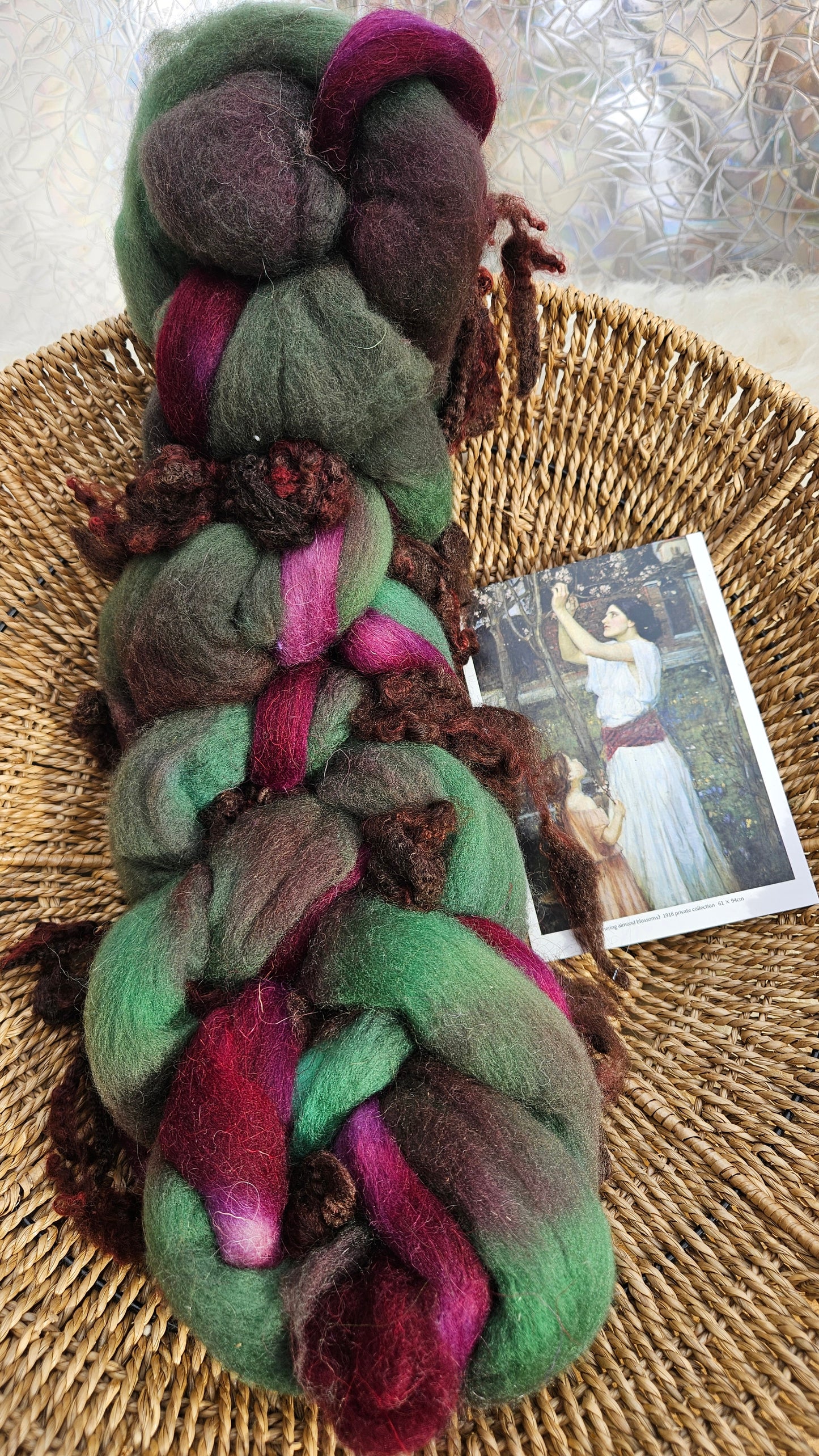 Inspired by the impressionist paintings of Waterhouse using his timeless fine art colorway pallete. Each wool roving braid includes multiple breeds and textures of high quality fiber for blending and carding into art batts or spinning into yarn directly from the braid.