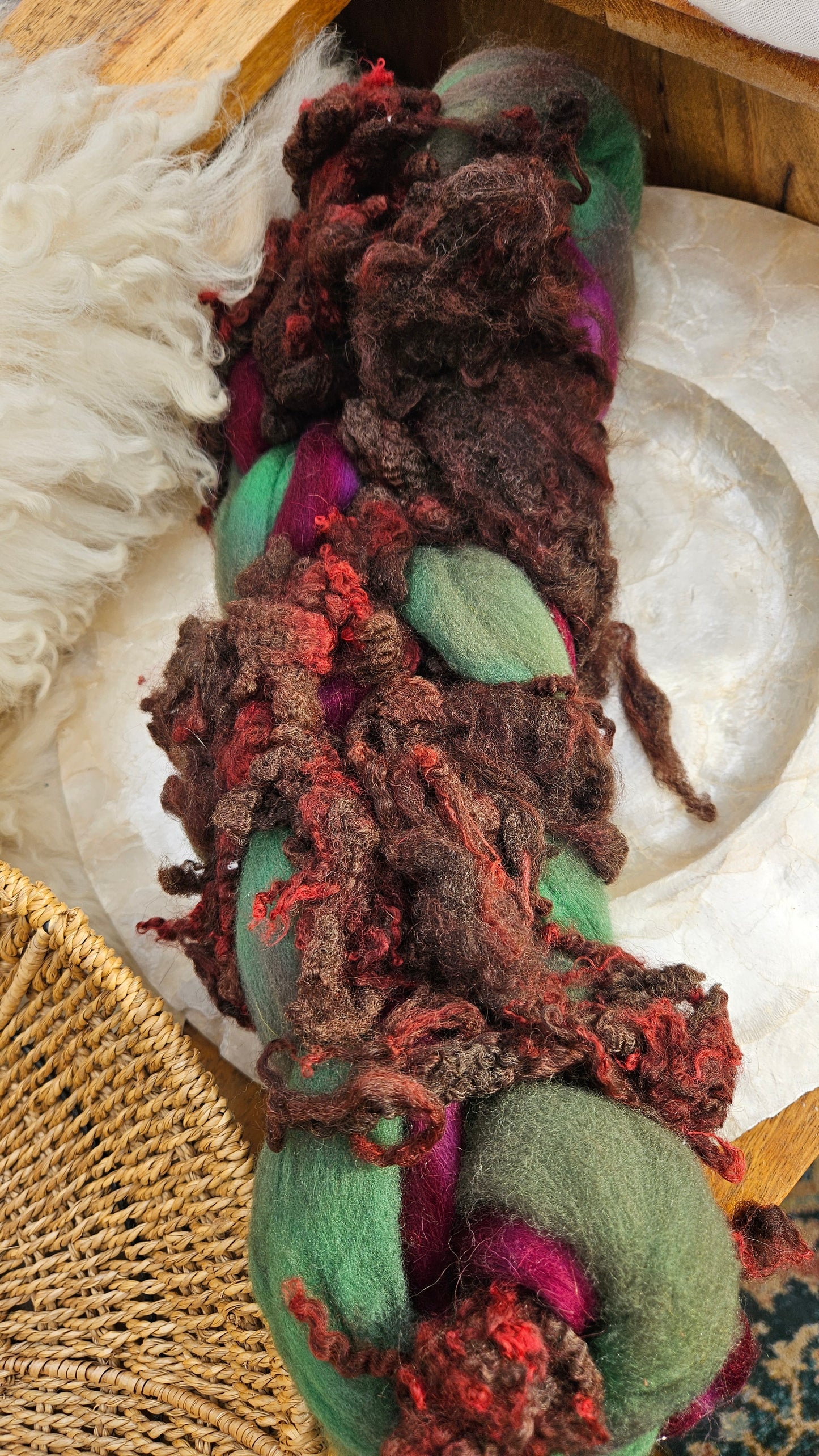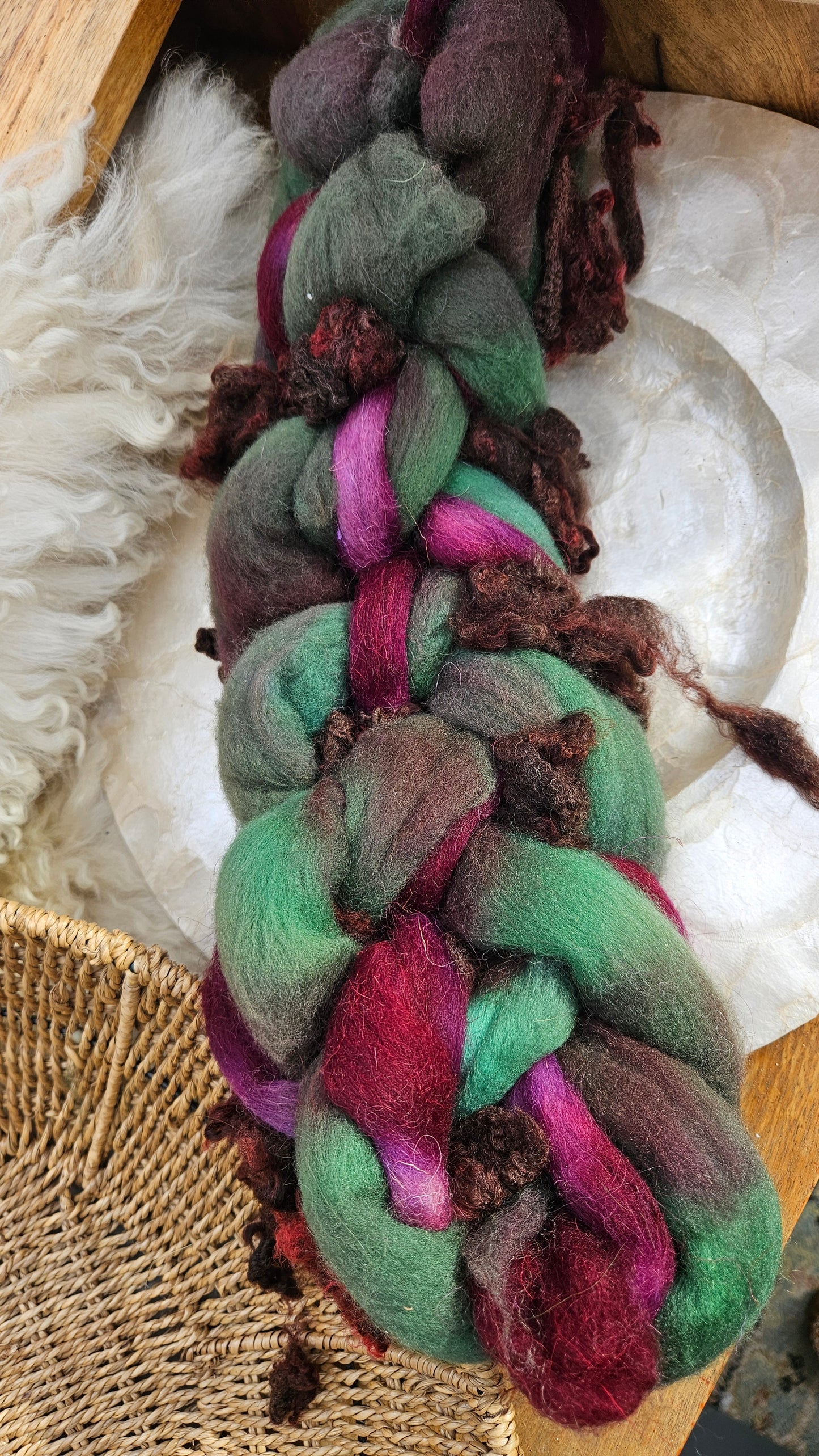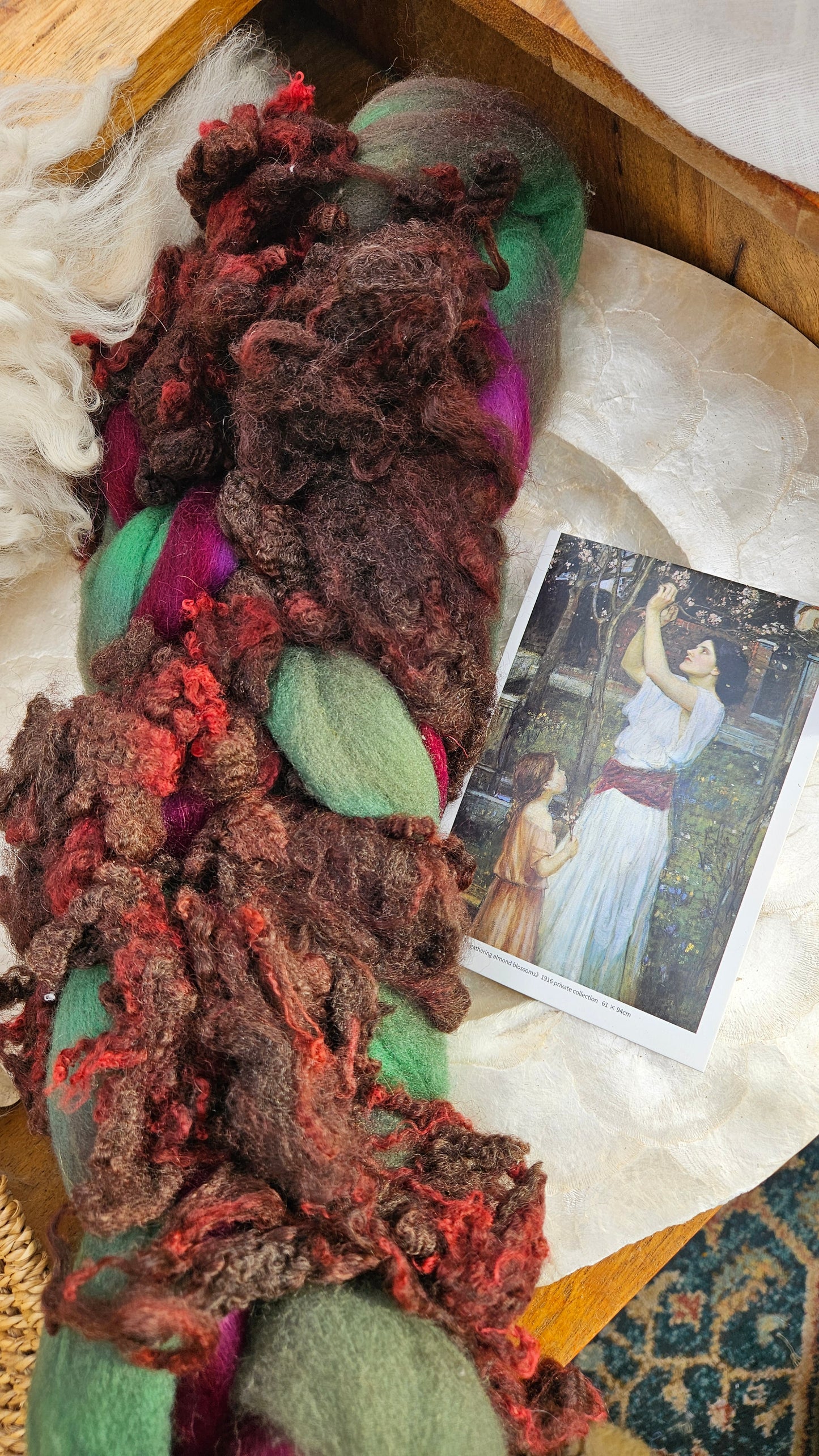 Inspired by the impressionist paintings of Waterhouse using his timeless fine art colorway pallete. Each wool roving braid includes multiple breeds and textures of high quality fiber for blending and carding into art batts or spinning into yarn directly from the braid.
