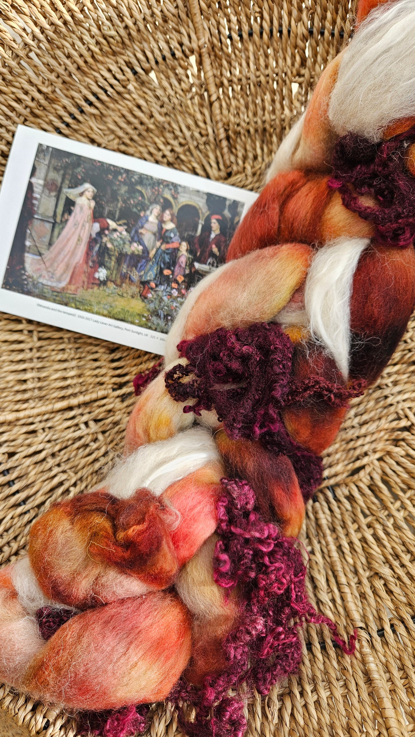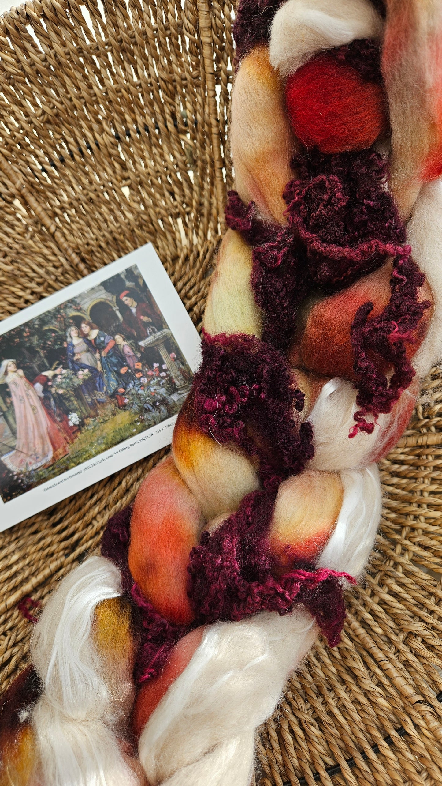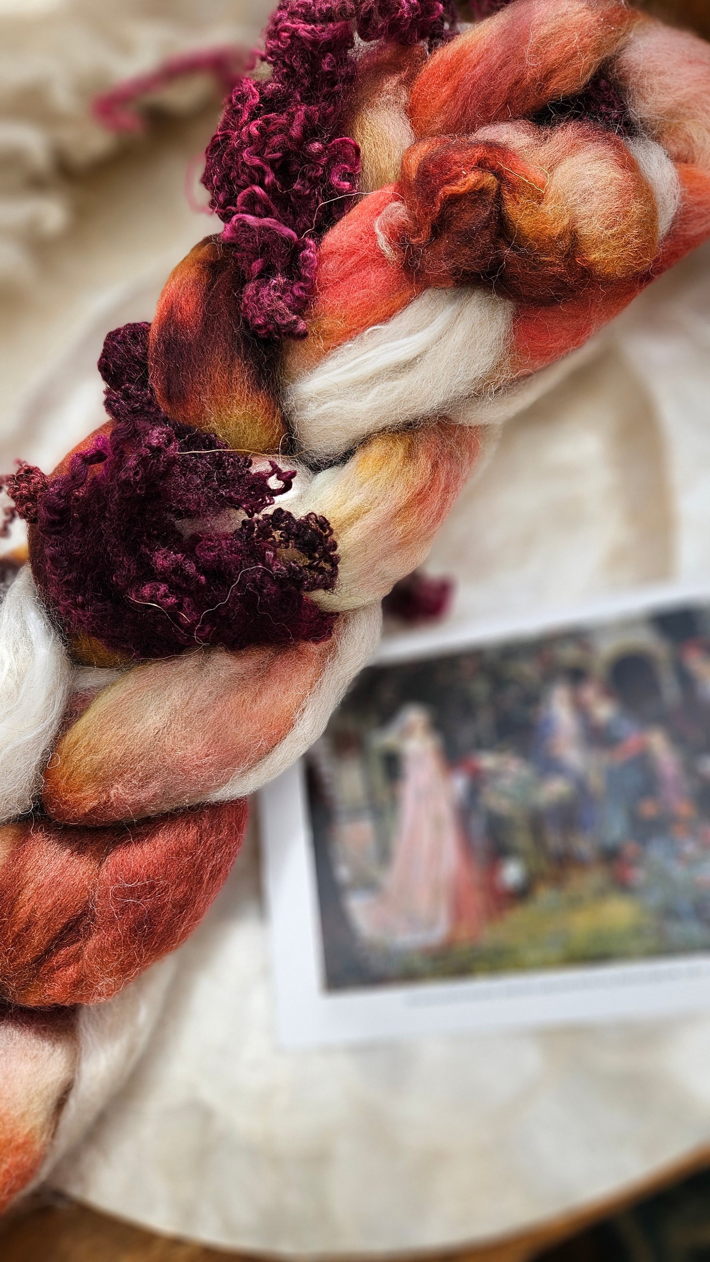 Inspired by the impressionist paintings of Waterhouse using his timeless fine art colorway pallete. Each wool roving braid includes multiple breeds and textures of high quality fiber for blending and carding into art batts or spinning into yarn directly from the braid.