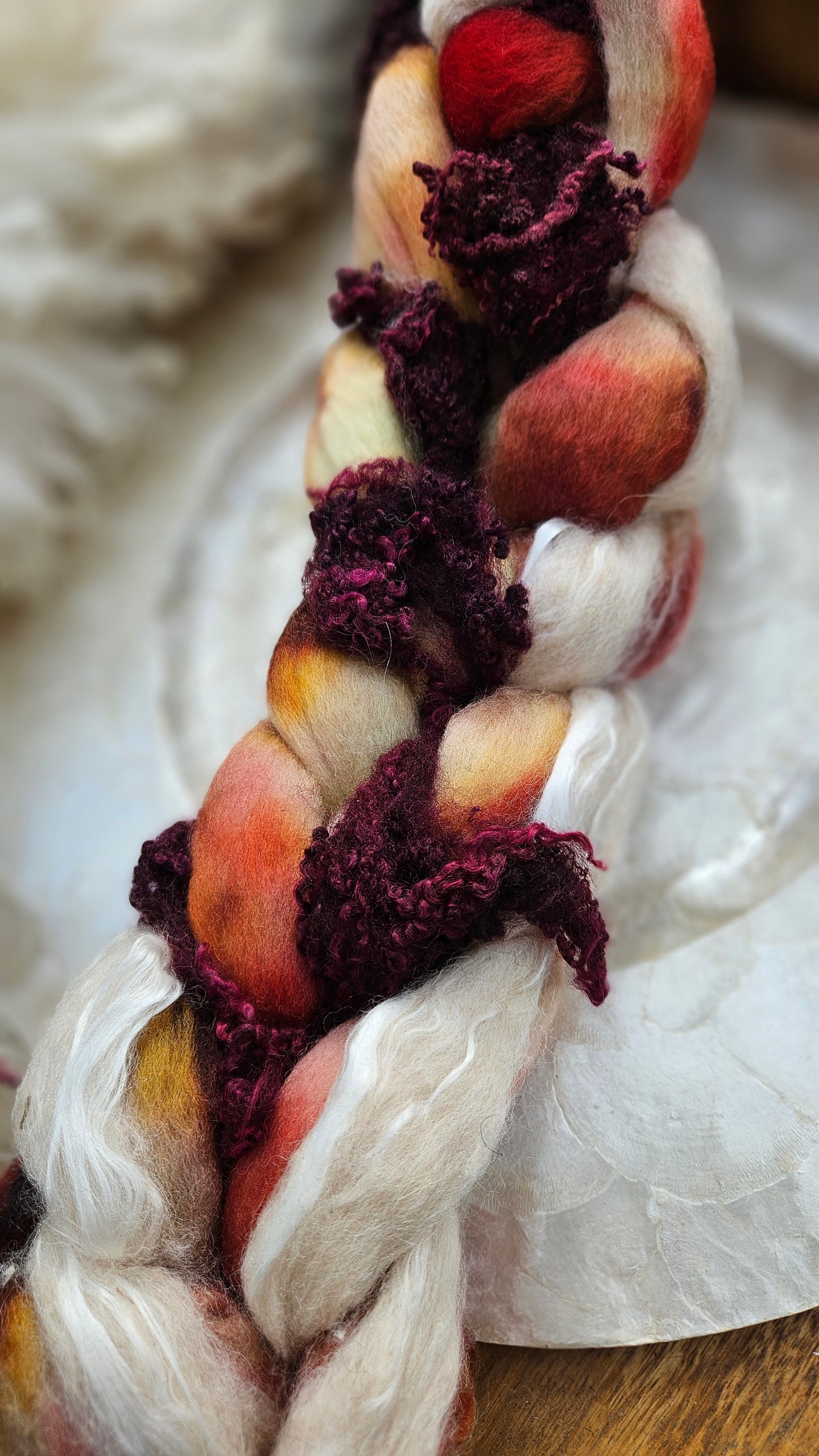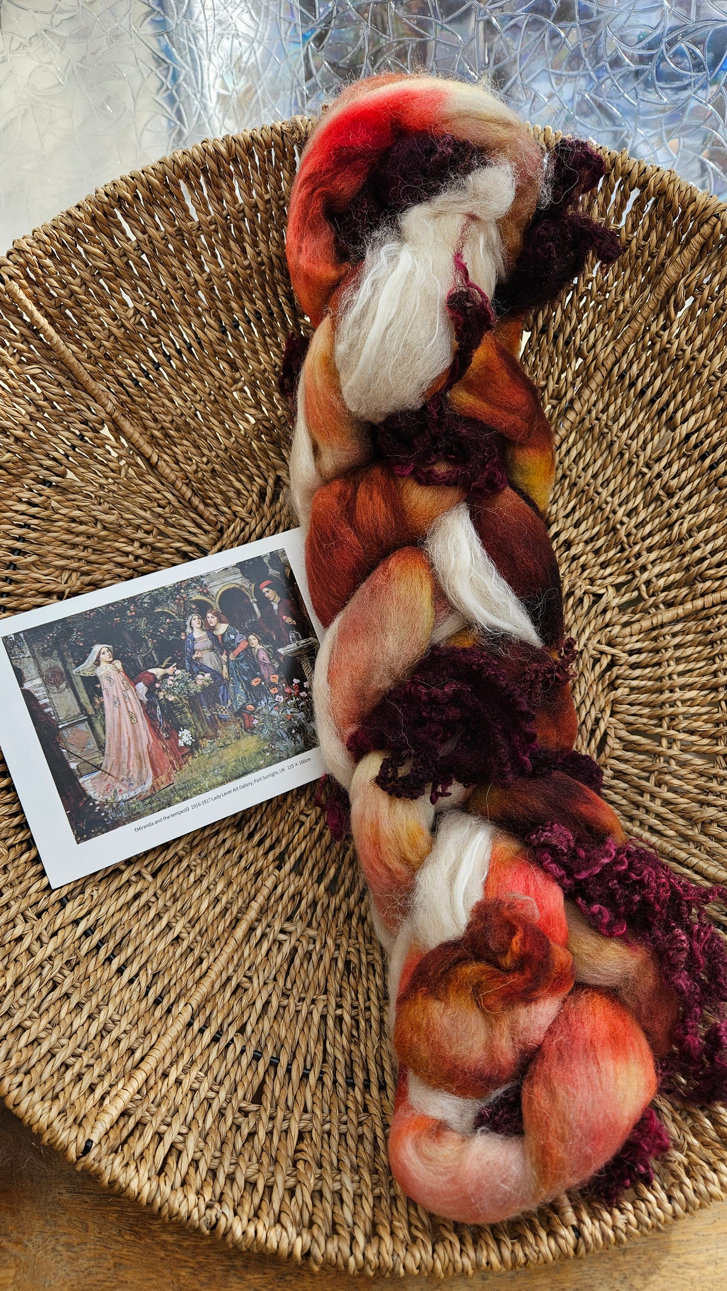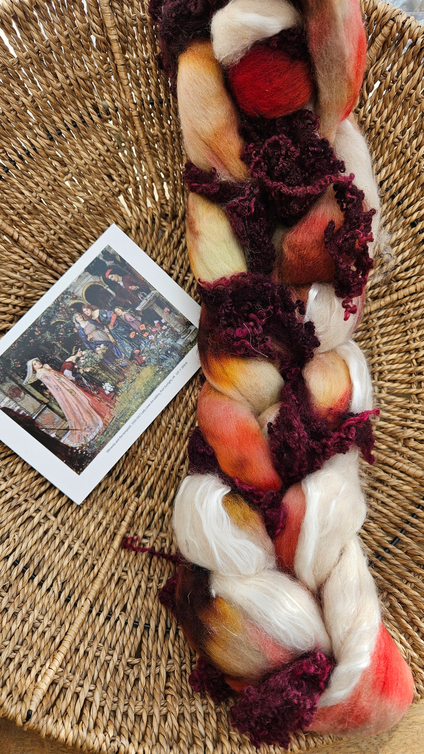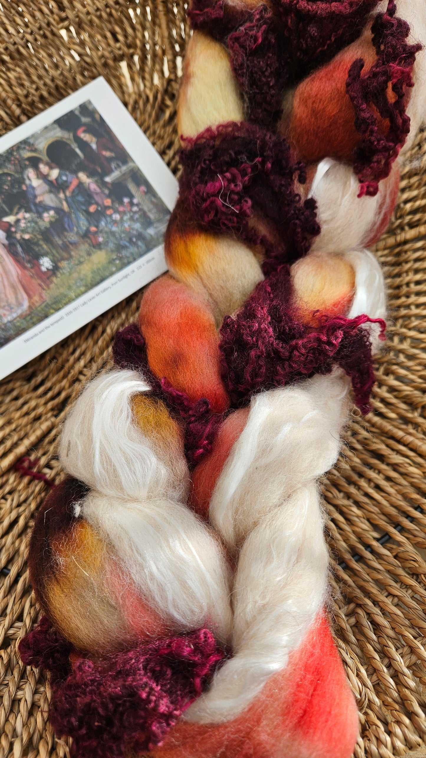 Inspired by the impressionist paintings of Waterhouse using his timeless fine art colorway pallete. Each wool roving braid includes multiple breeds and textures of high quality fiber for blending and carding into art batts or spinning into yarn directly from the braid.