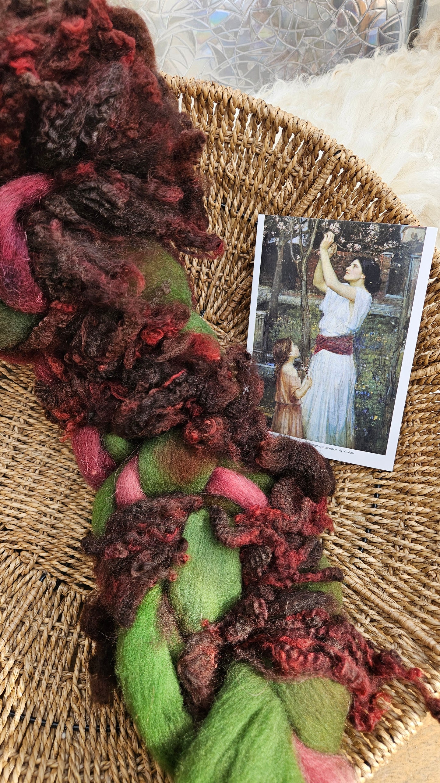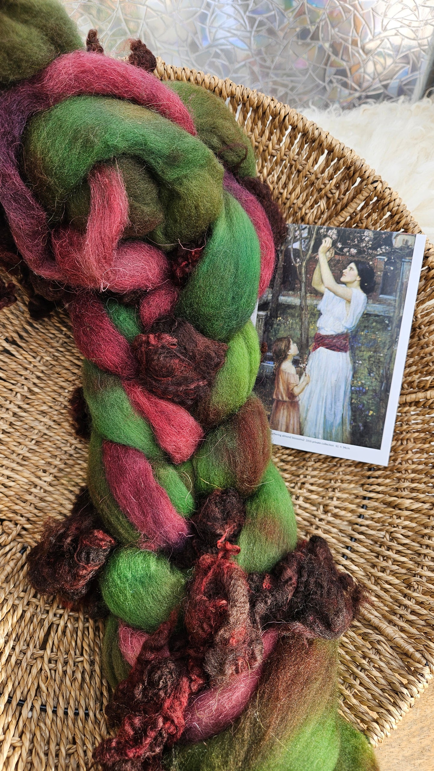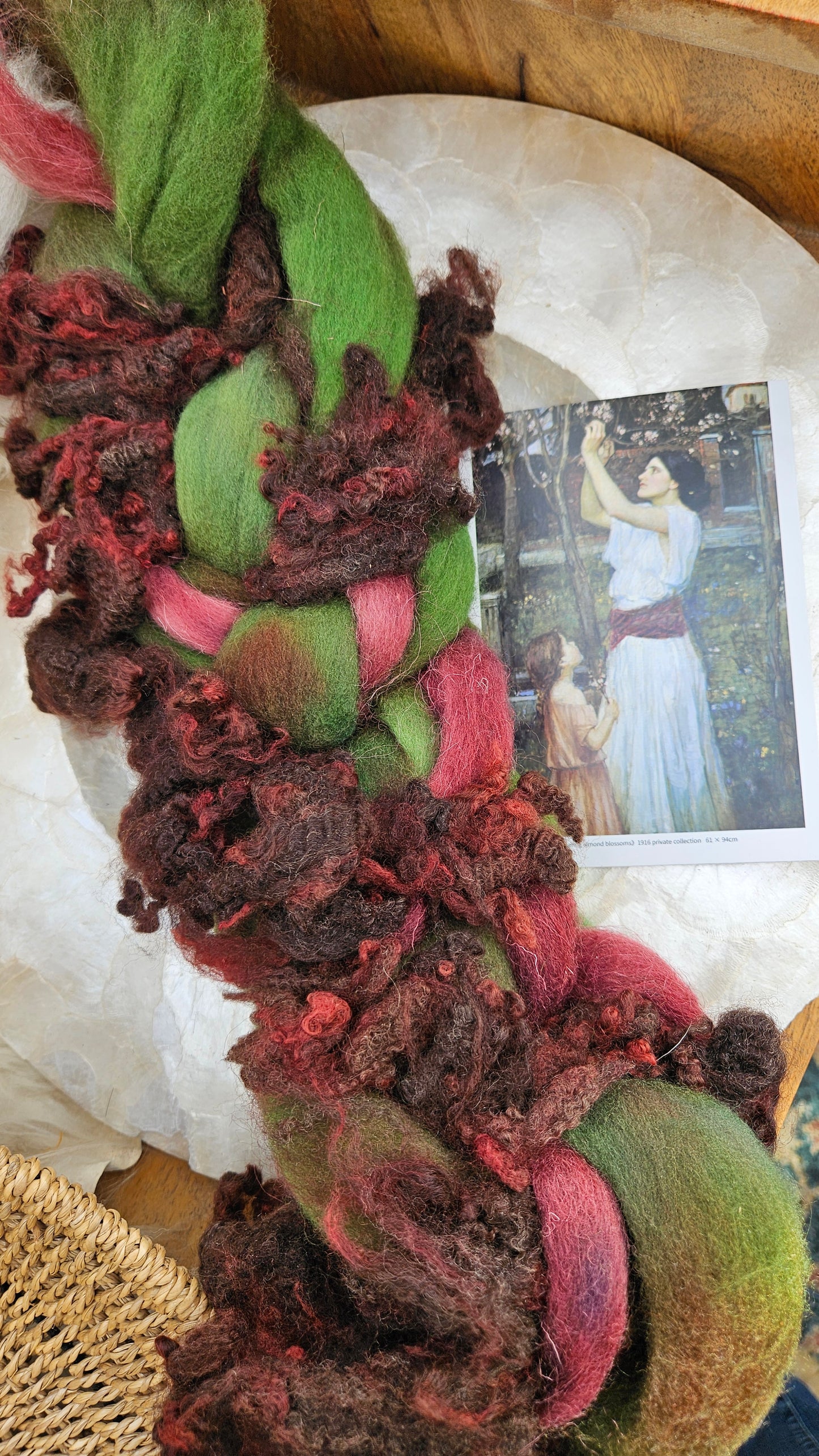 Inspired by the impressionist paintings of Waterhouse using his timeless fine art colorway pallete. Each wool roving braid includes multiple breeds and textures of high quality fiber for blending and carding into art batts or spinning into yarn directly from the braid.