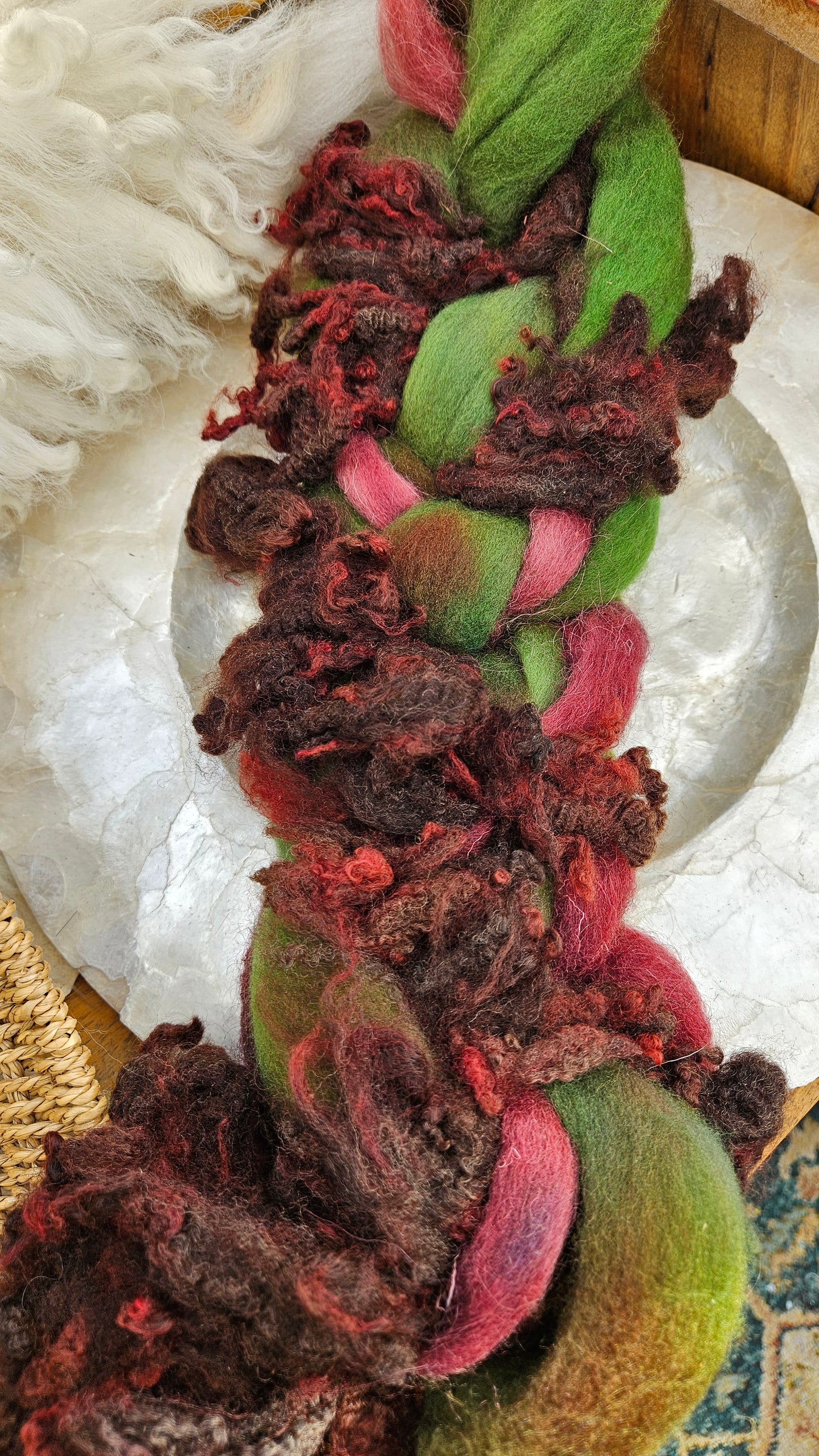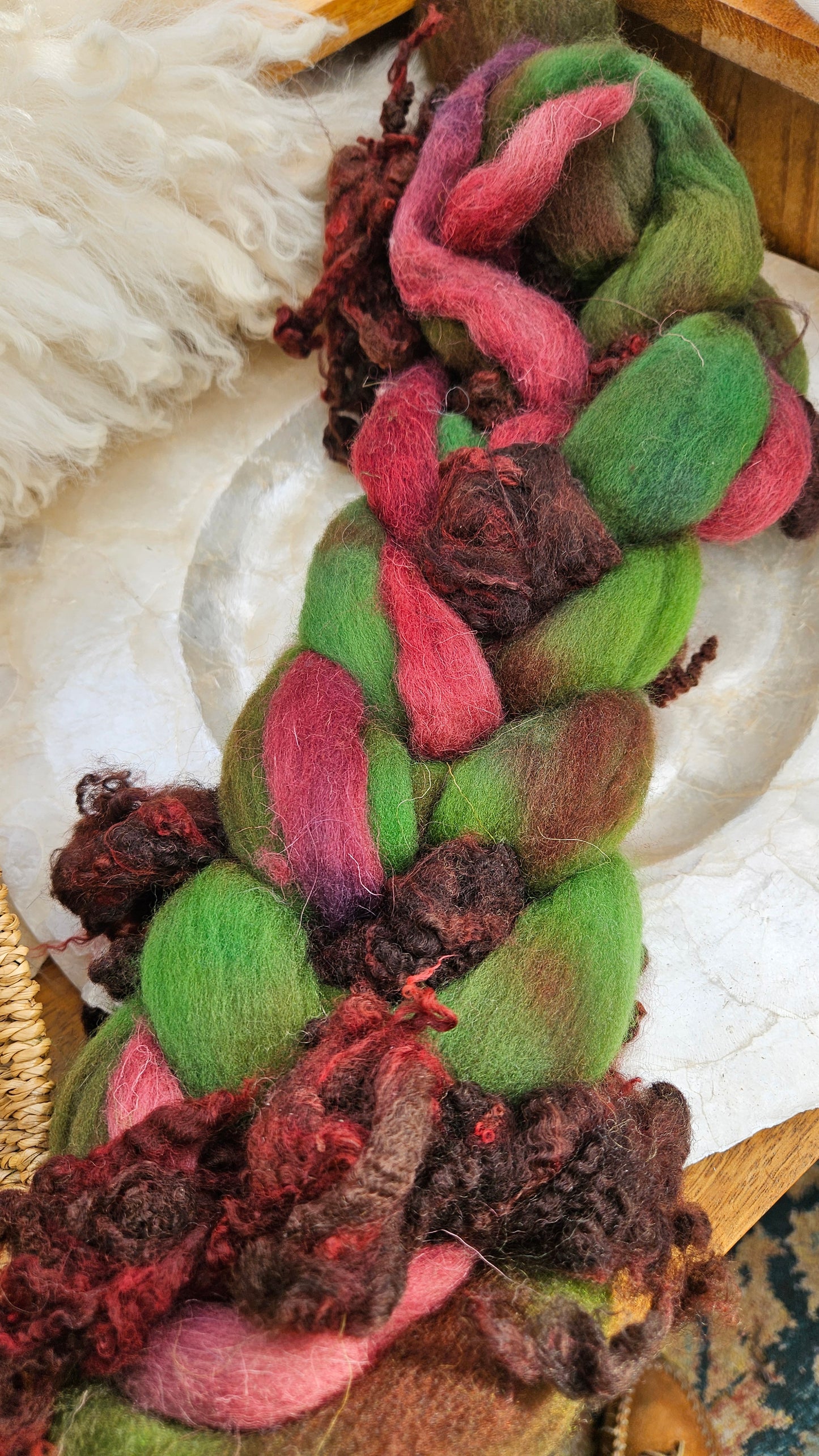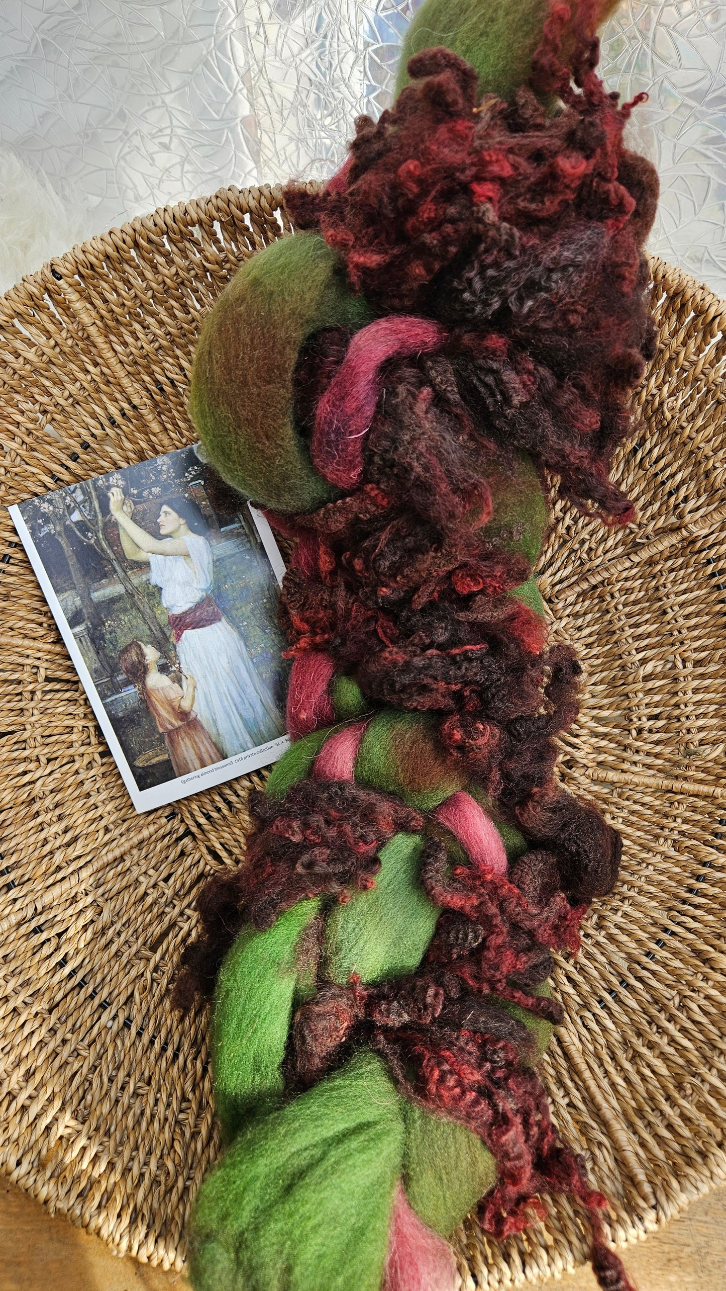 Inspired by the impressionist paintings of Waterhouse using his timeless fine art colorway pallete. Each wool roving braid includes multiple breeds and textures of high quality fiber for blending and carding into art batts or spinning into yarn directly from the braid.