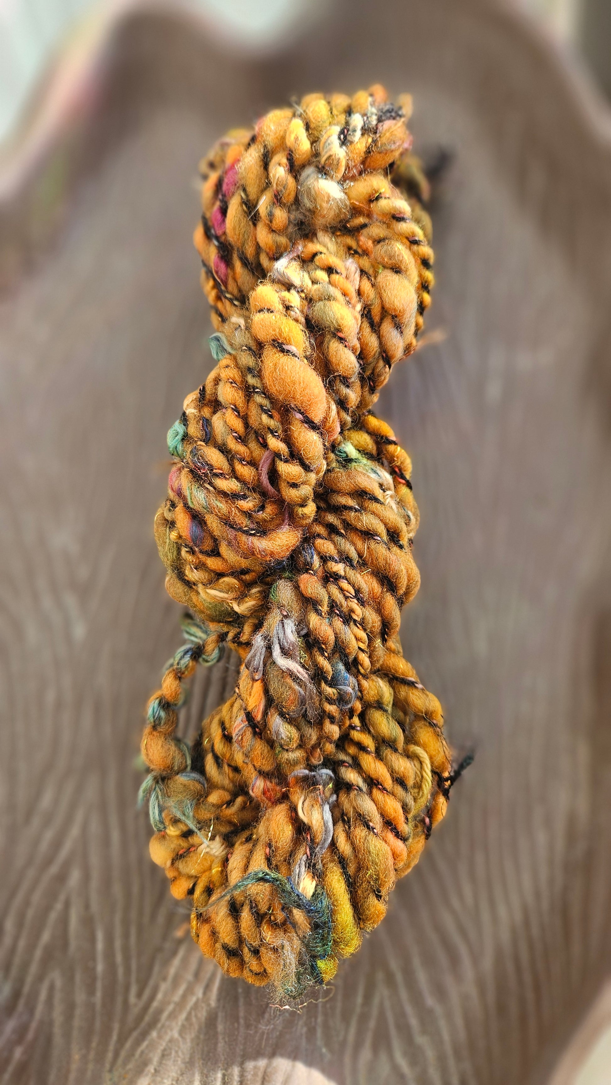 - Technique: Hand-dyed, hand-carded, hand-spun, and plied with thread. Finished in Unicorn Fibre Rinse.
