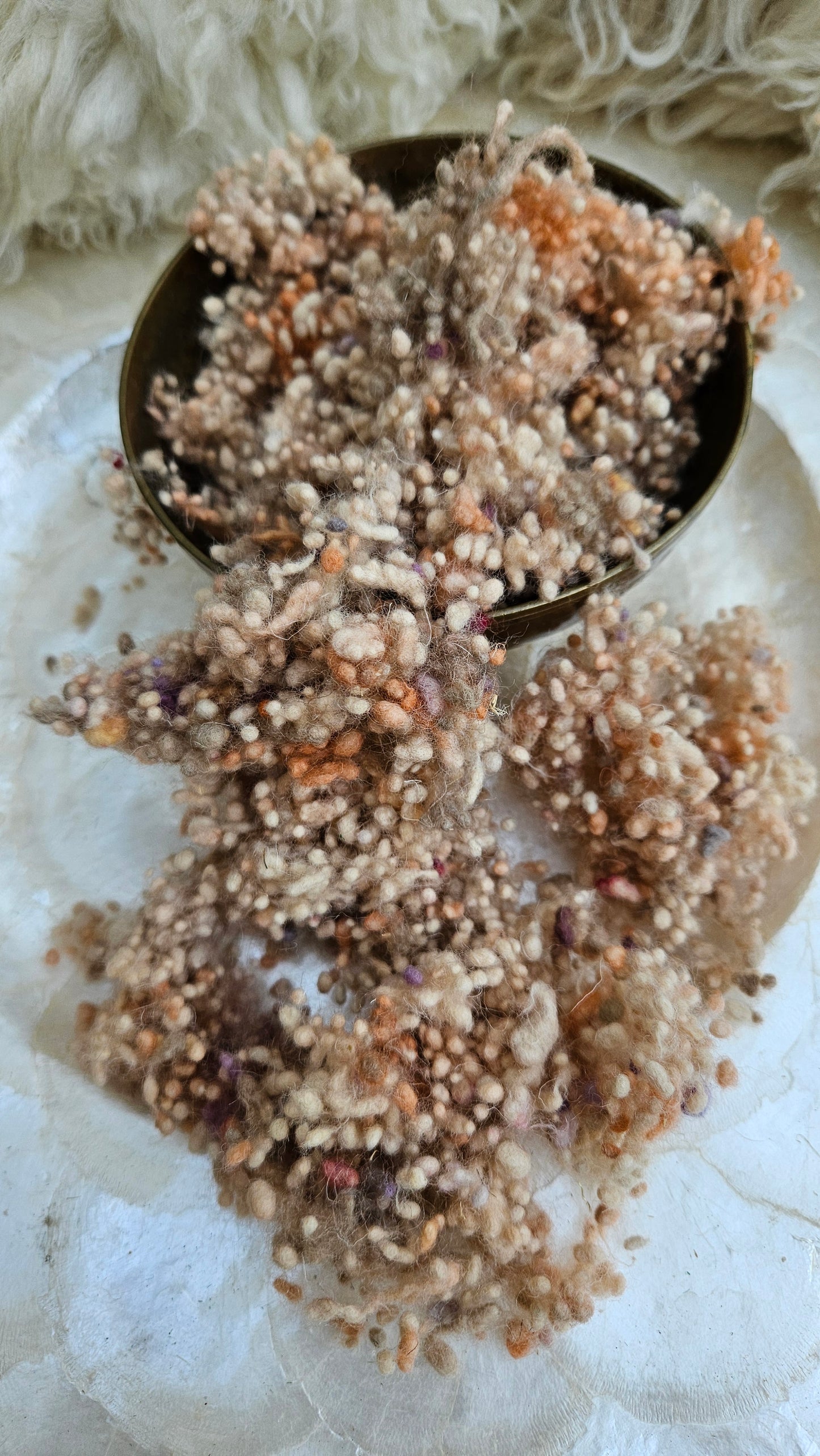 Prevent fall-out when blending and spinning: I recommend using Eucalyptus crimp or any short staple length fuzzy fibers when blending to securely hold the nepps into your yarn. For free videos on carding and spinning wool nepps to prevent fall-out, visit my YouTube channel: youtube.com/@neauveau.