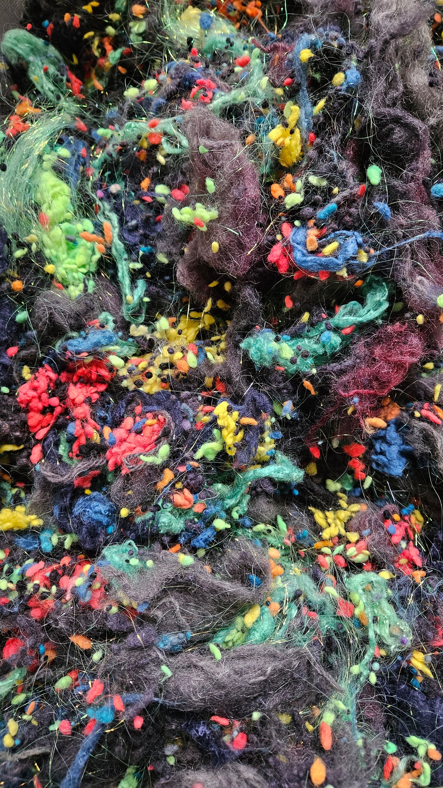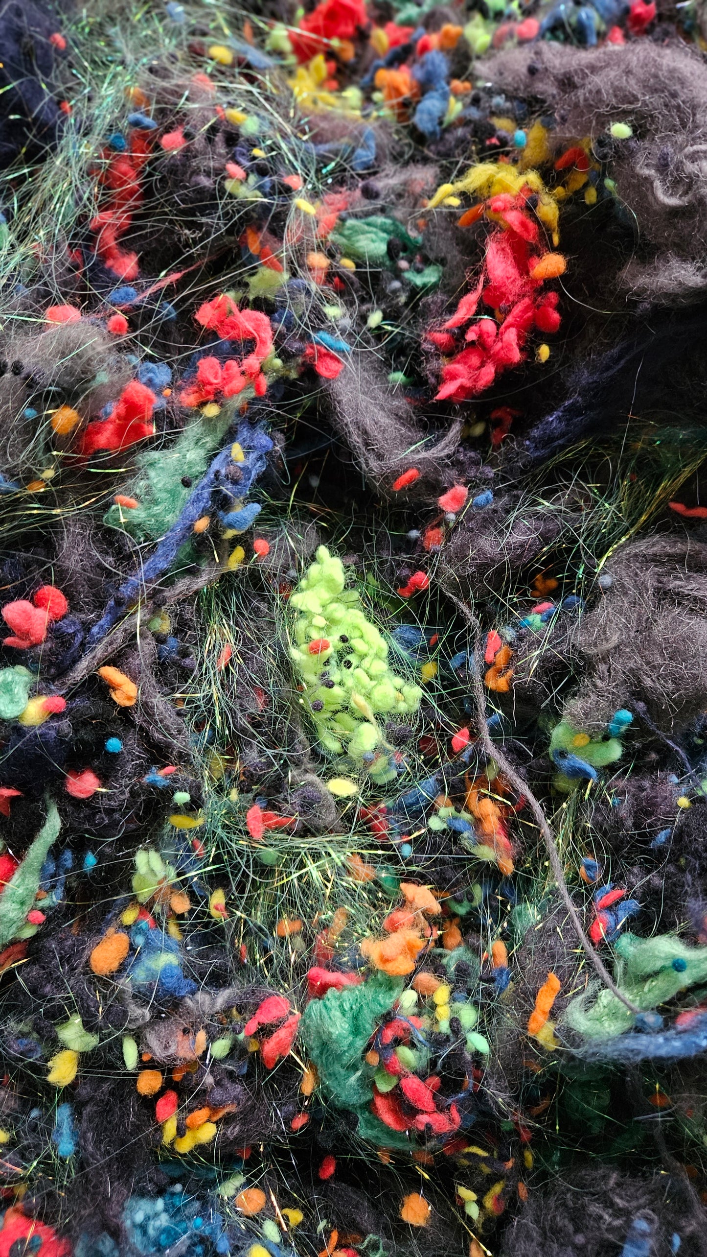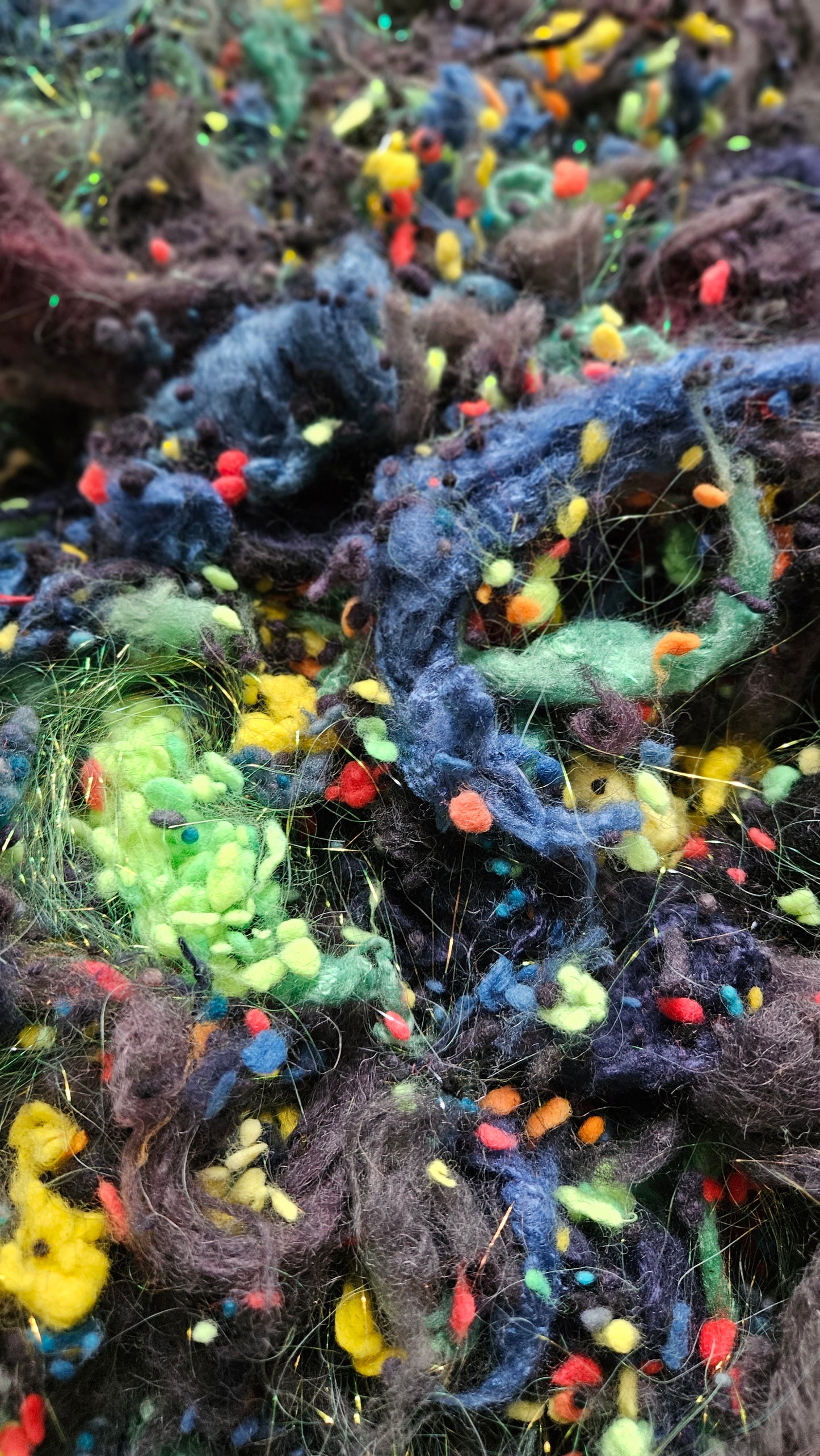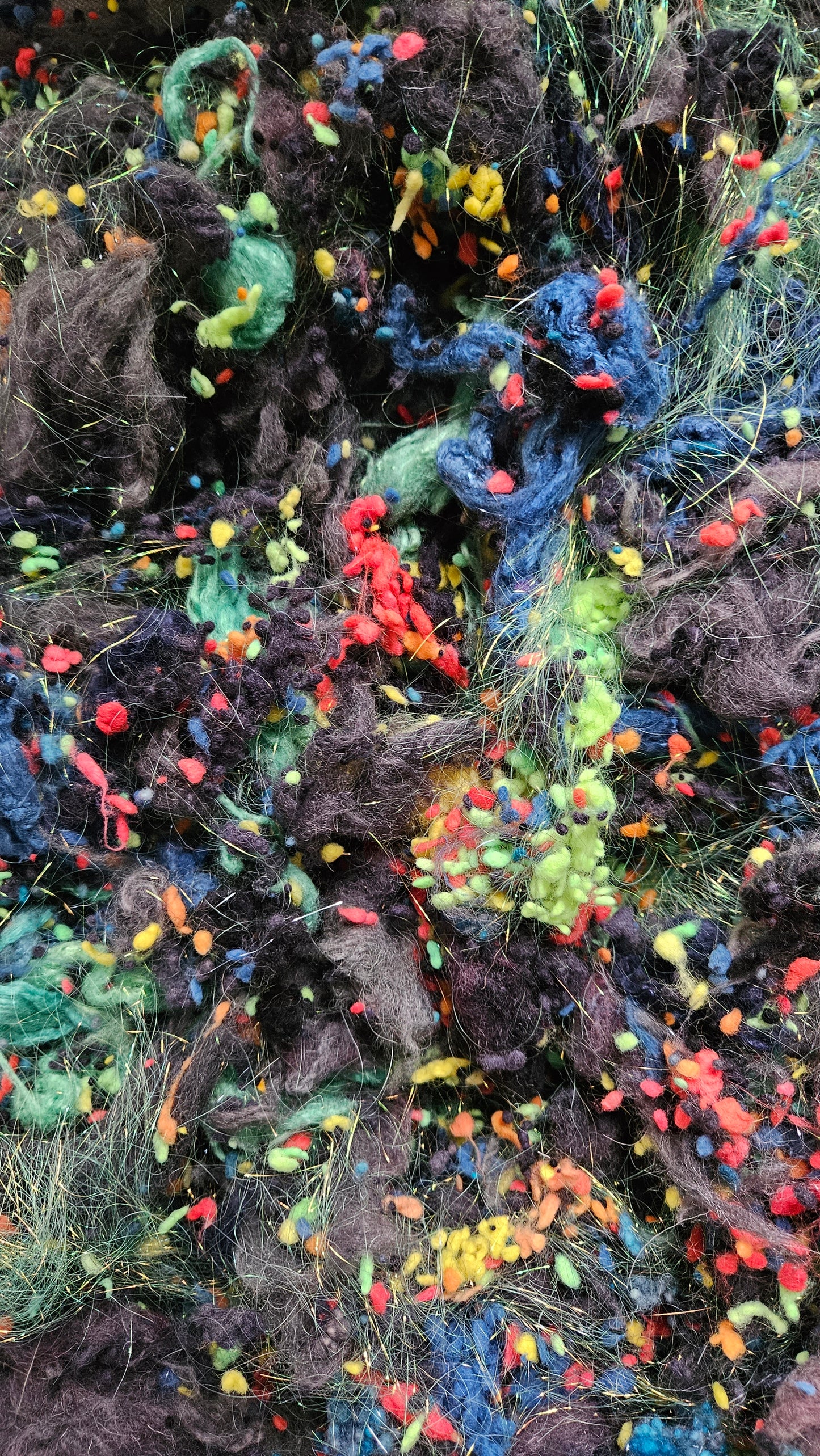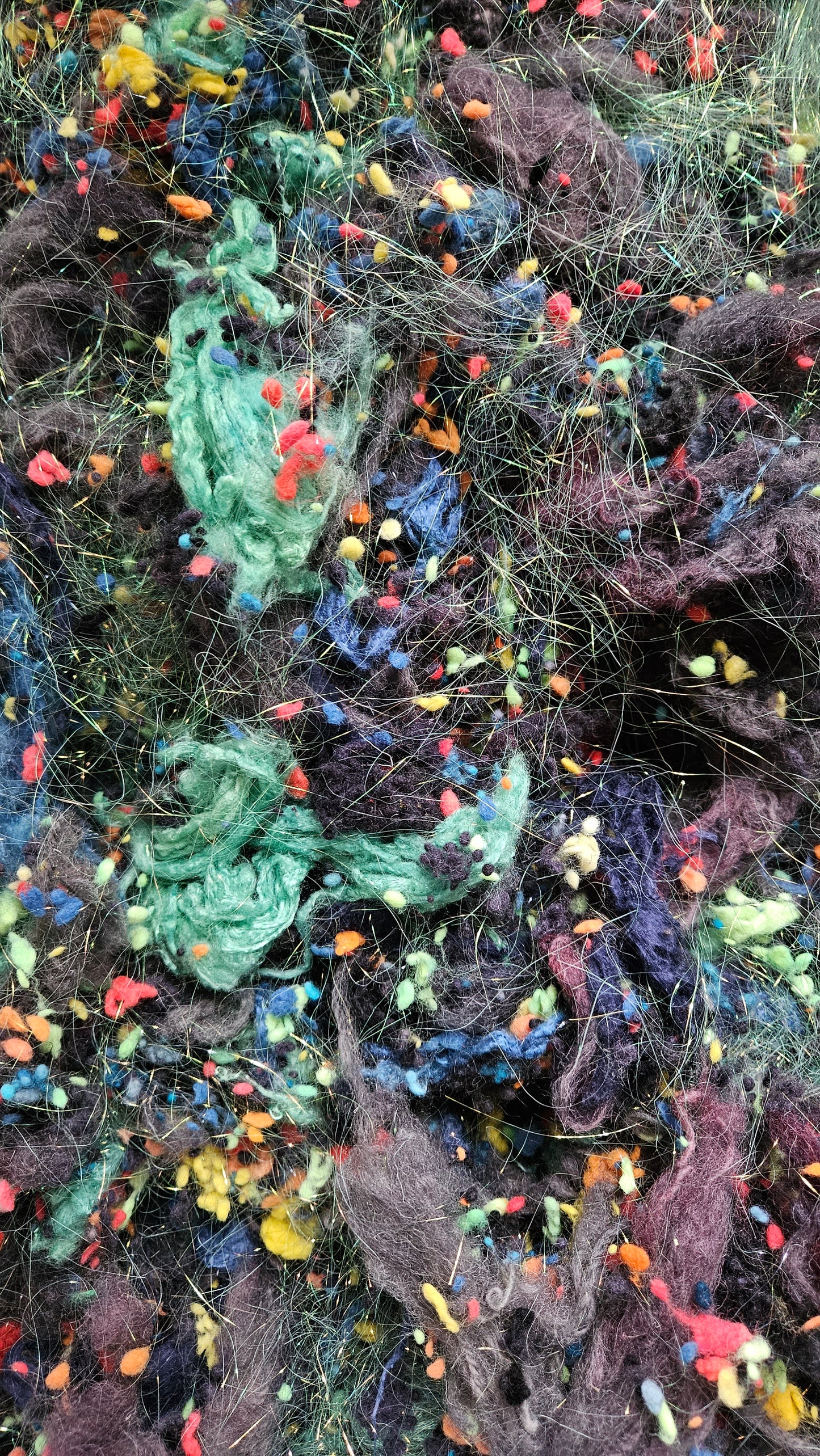 An extra chunky blend of cardable fibers for creating art batts, rolags, or other blends to spin into yarn for knitting, weaving, and crochet. One pinch goes a long way! Unlike most of my other blends, this colorway is not as soft (more of a medium wool feel) I recommend blending this texture with fine wool for next-to-skin soft projects.