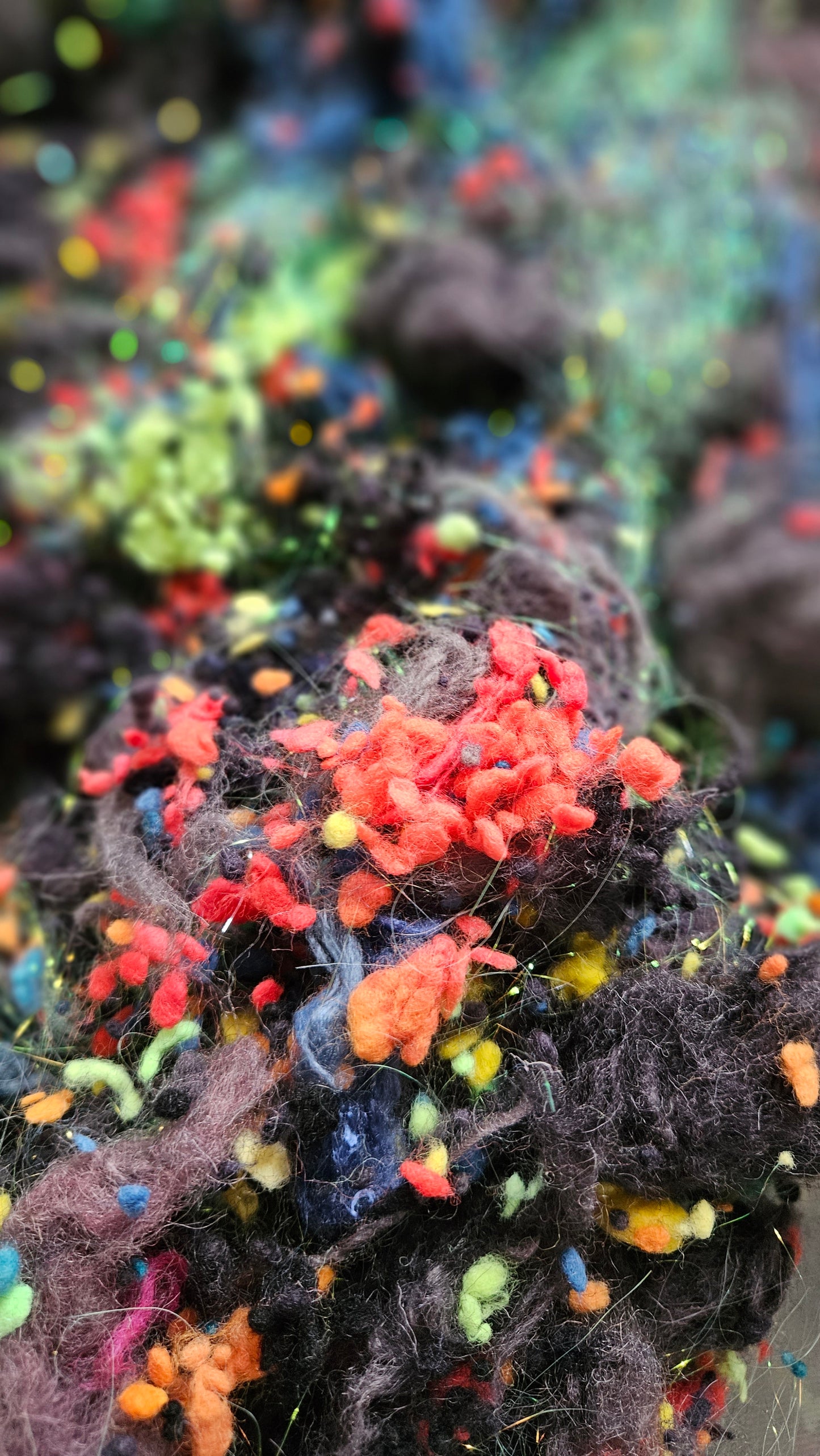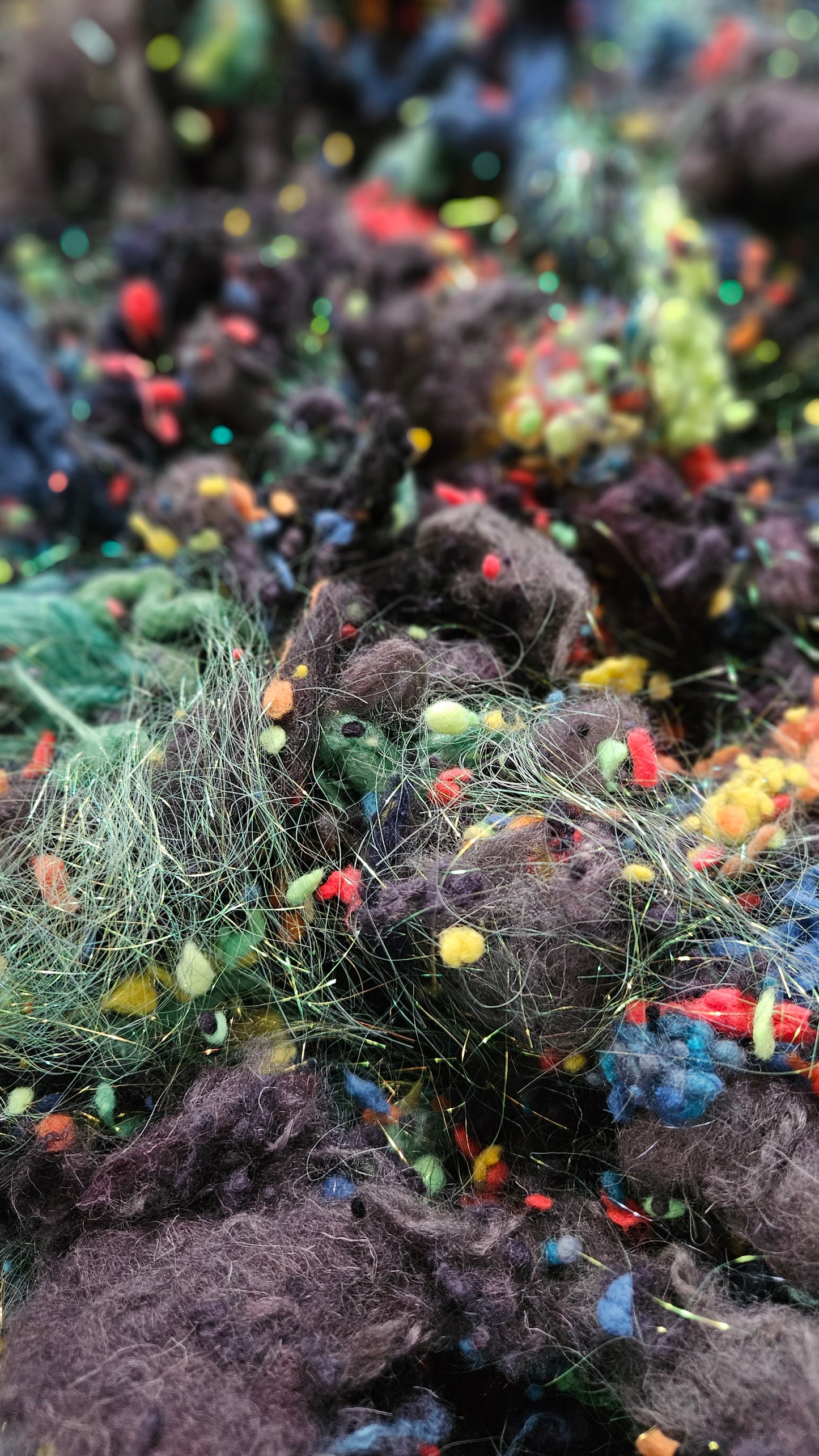 - WOOL THREAD CLOUD: recycled wool threads dyed in blacks and charcoal greys. Creates a fractured heathered effect like stone.