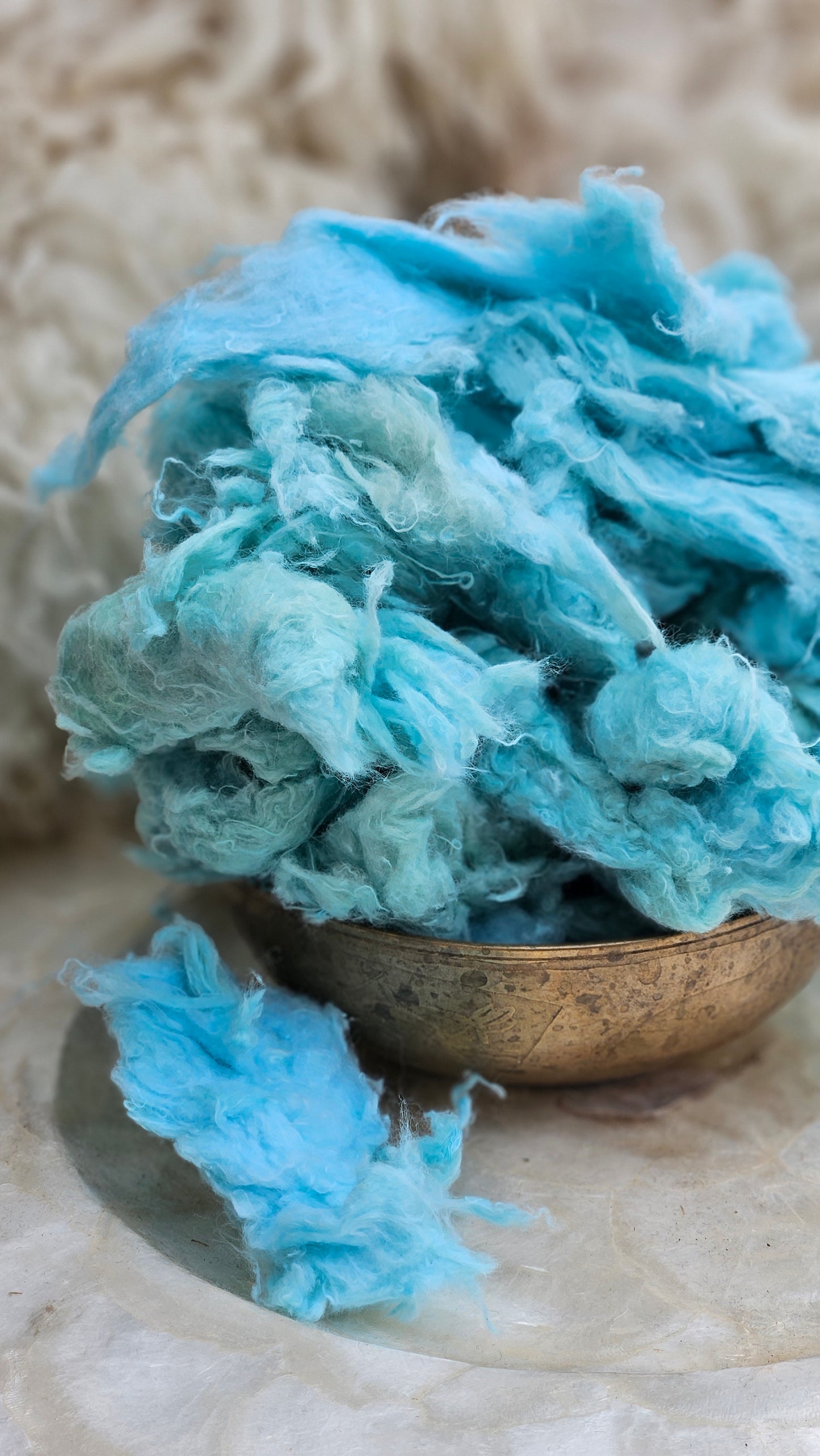 Recycled zero waste hand-dyed cotton noil that pulls apart like feathers and creates a hazy delightful tweed texture in art batts and rolags. Next to skin soft, dense, and textured with fine cut threads.