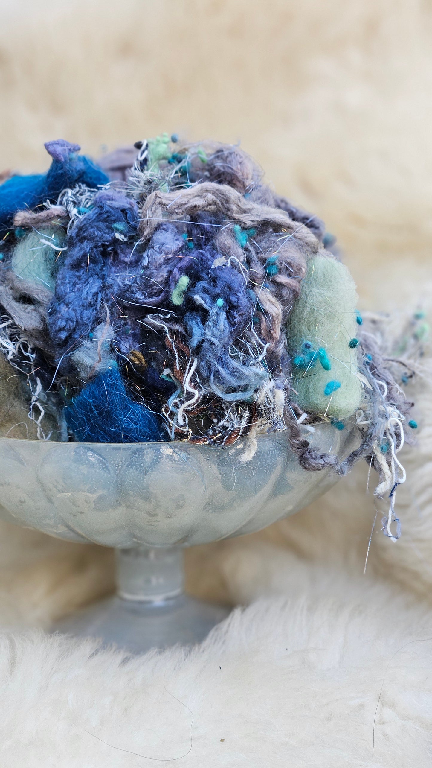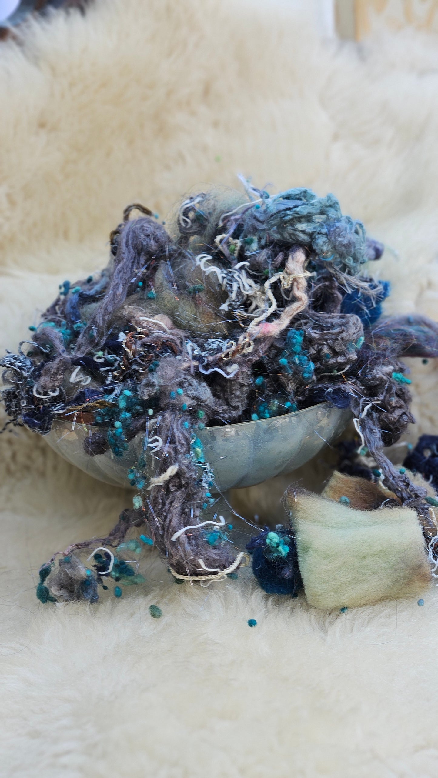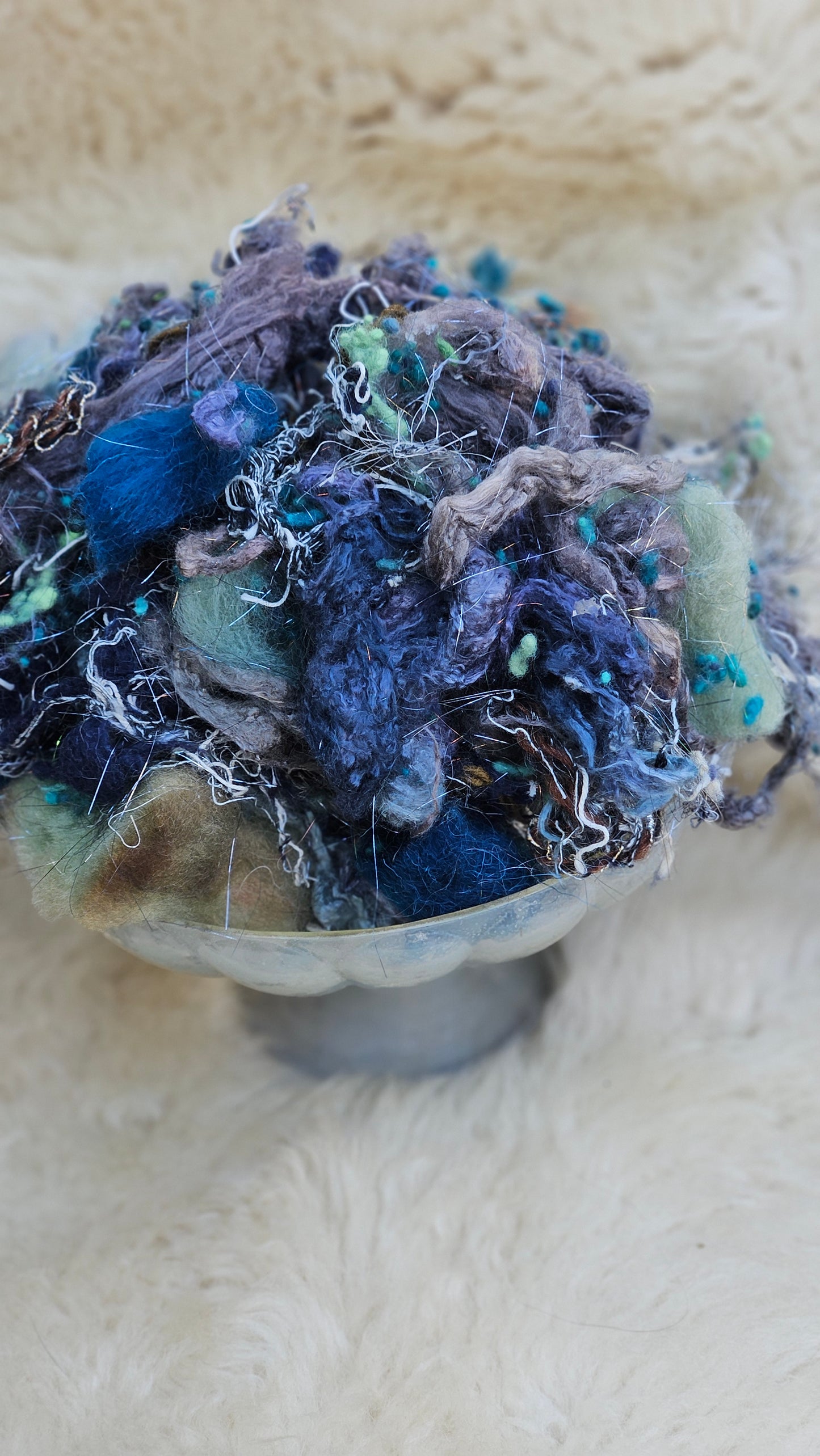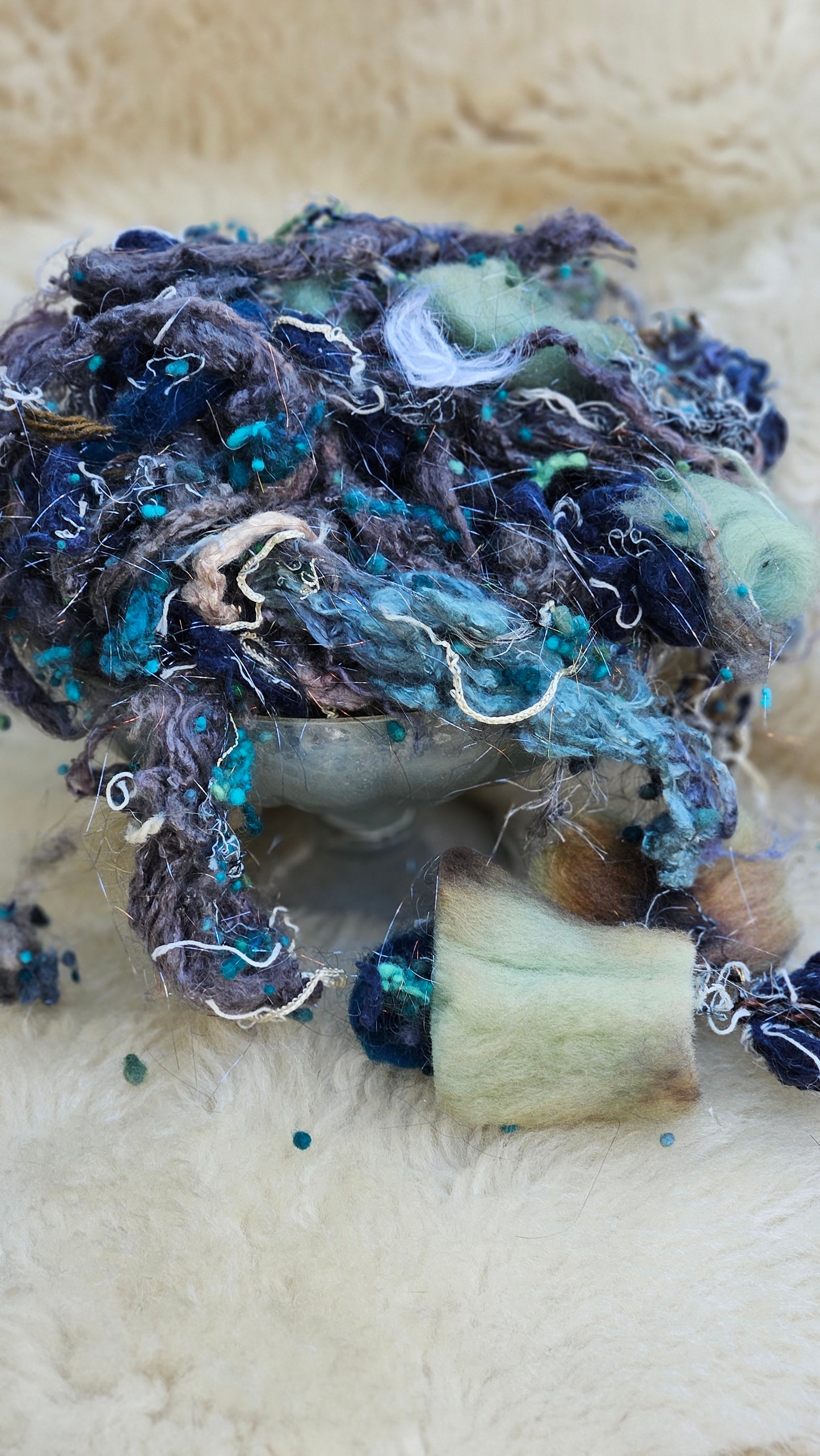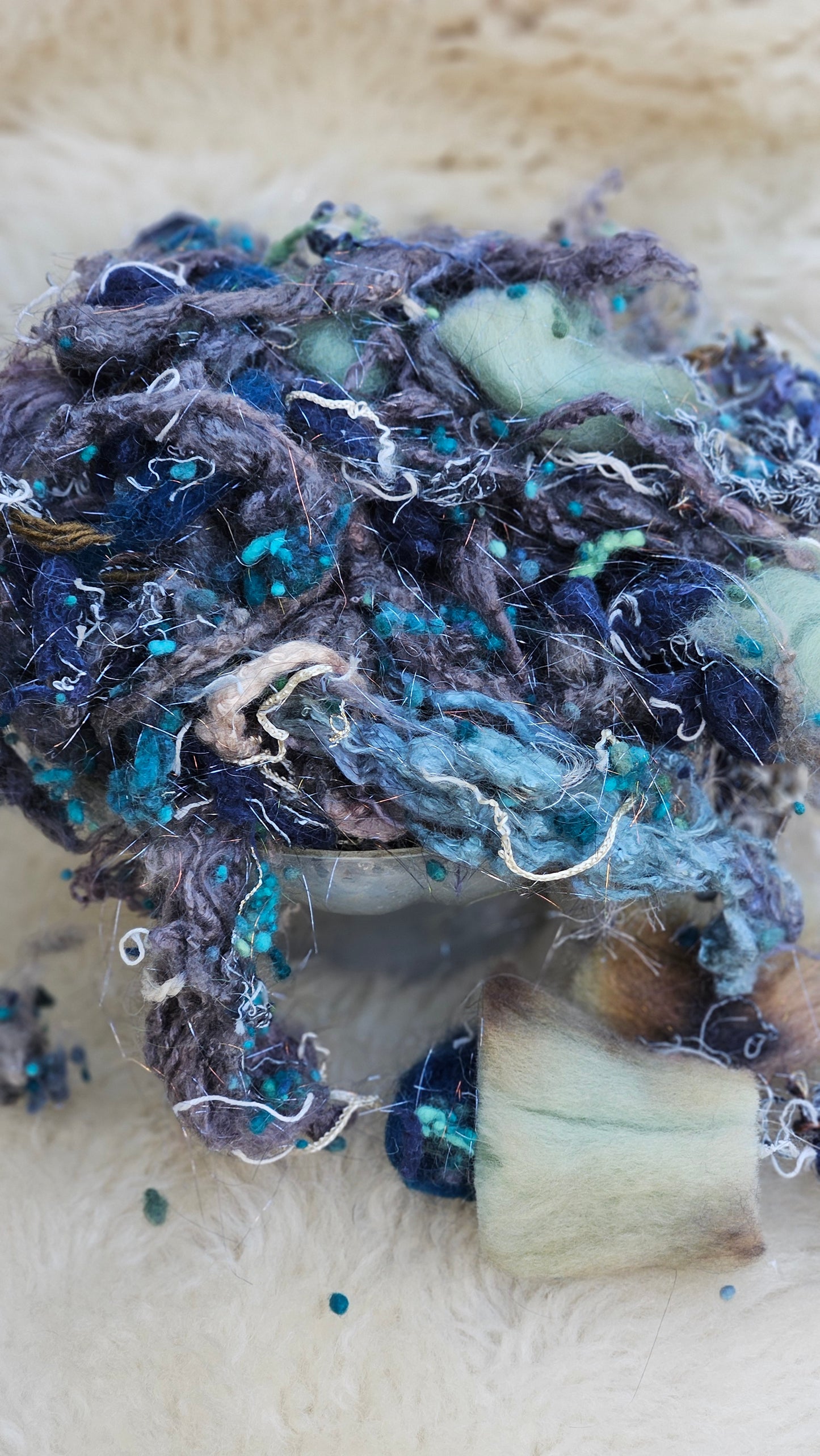 A 2.5 ounce blend of fine art inspired extra chunky wool texture and fiber for creating art batts, rolags, and blends to spin into yarn for knitting, weaving, crochet, felting, and fiber art. A little can go a long way! Each bag is subtly different due to the size of the texture and nuance in the dyed bits.