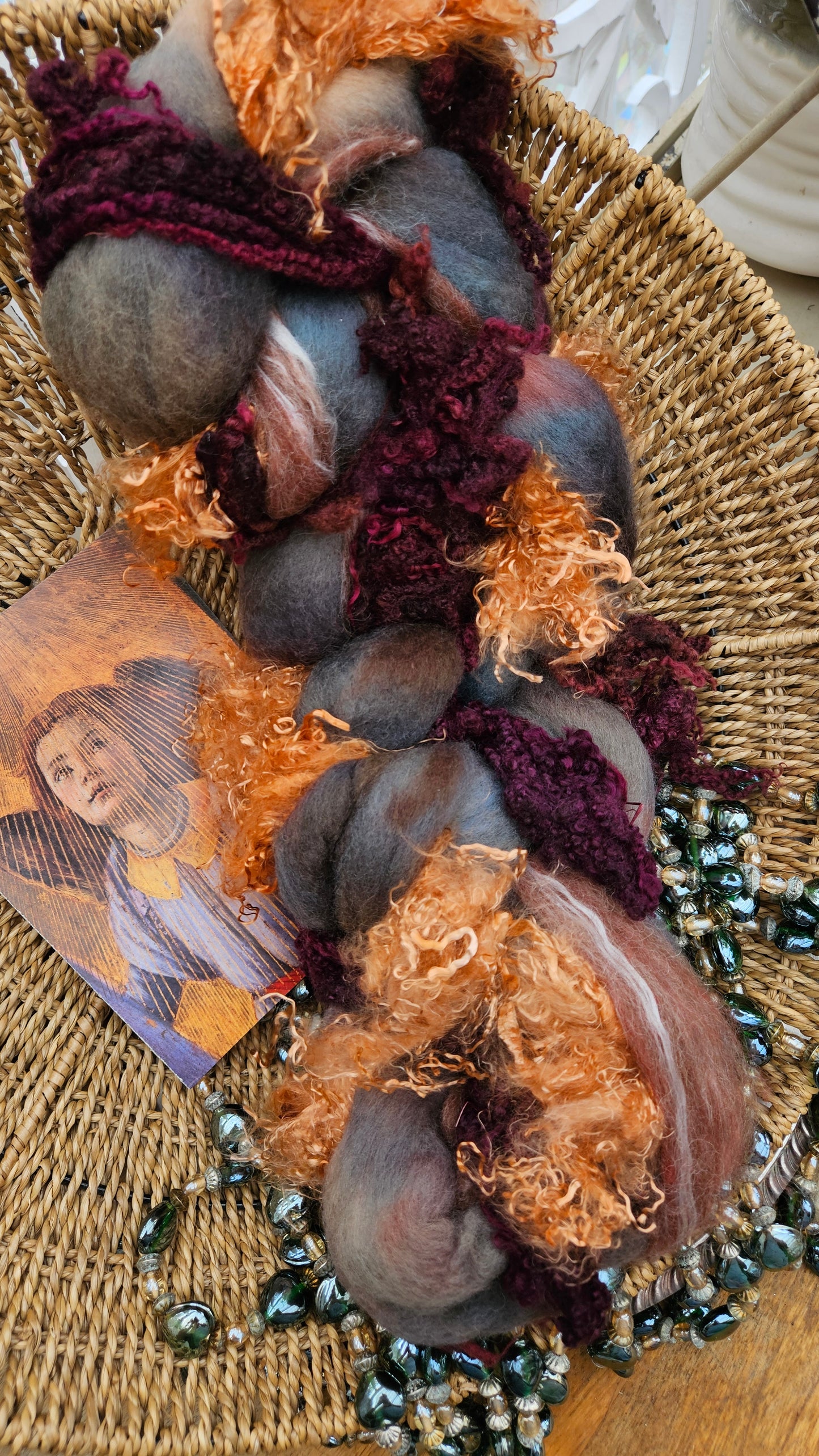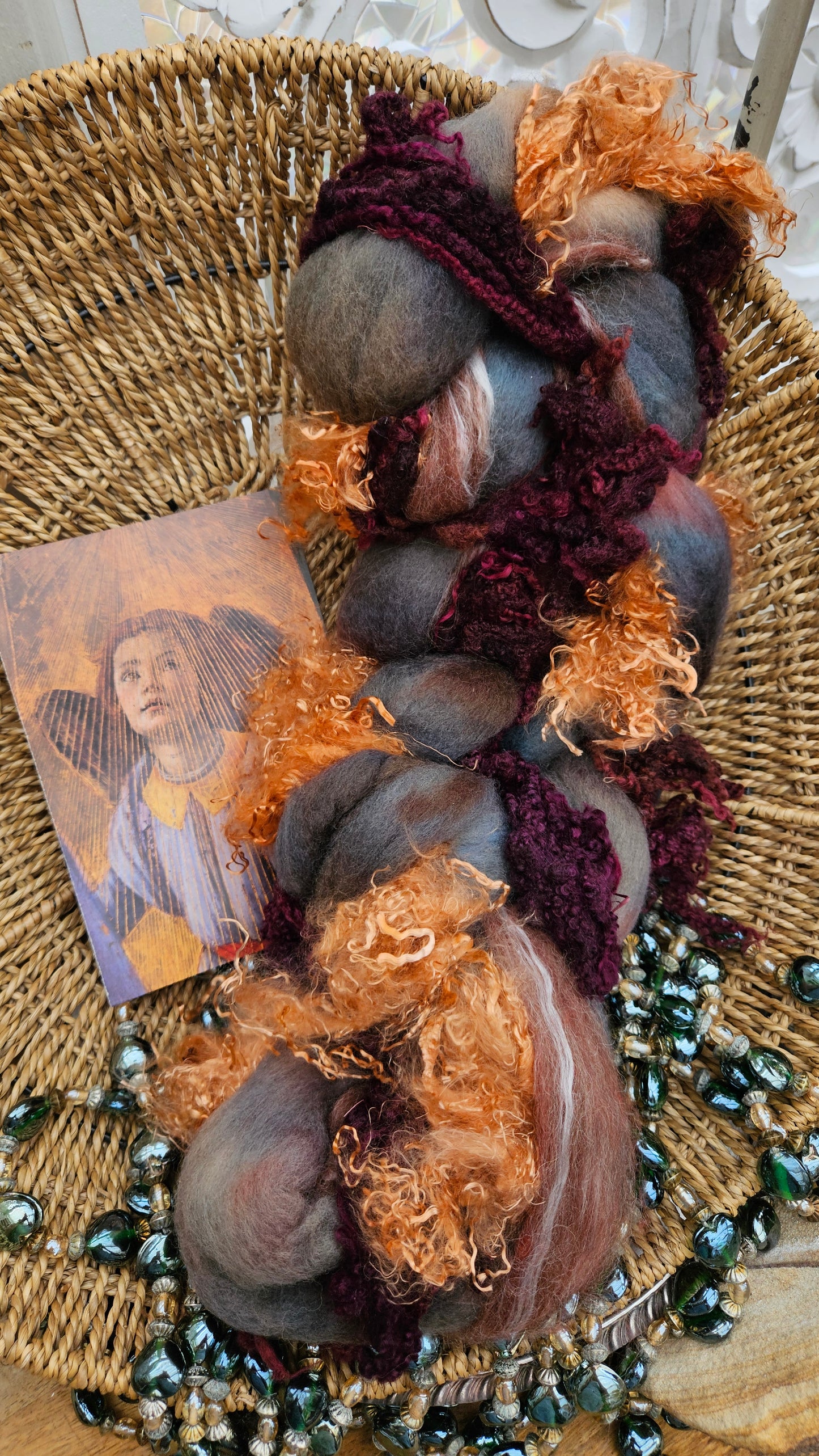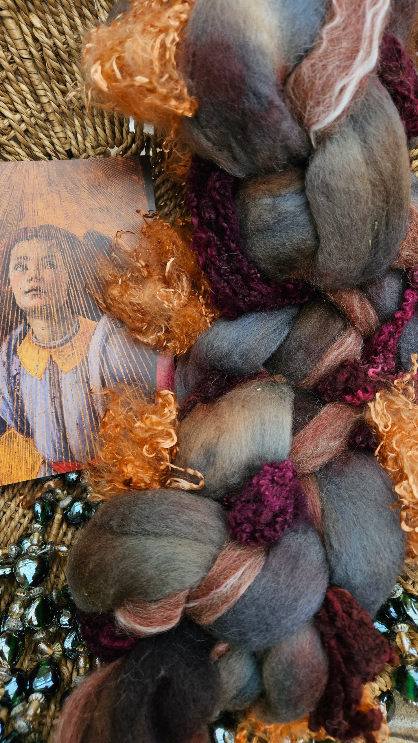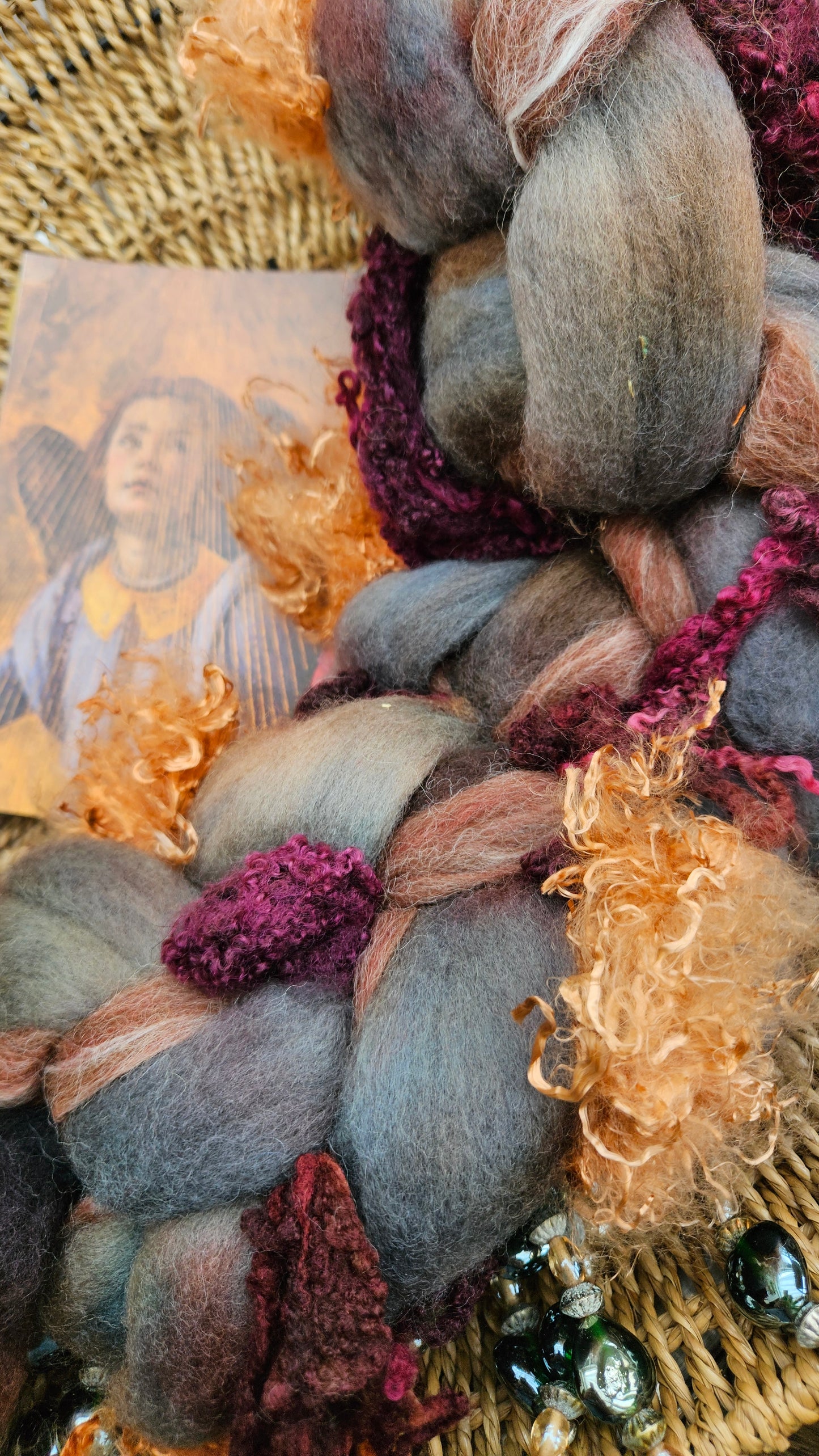 Inspired by the paintings of Botticelli using his timeless fine art colorway pallete. Each wool roving braid includes multiple breeds and textures of high quality fiber for blending and carding into art batts or spinning into yarn directly from the braid.