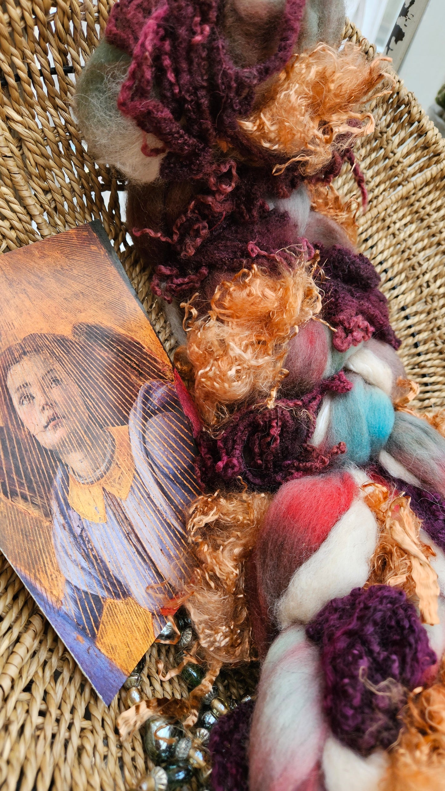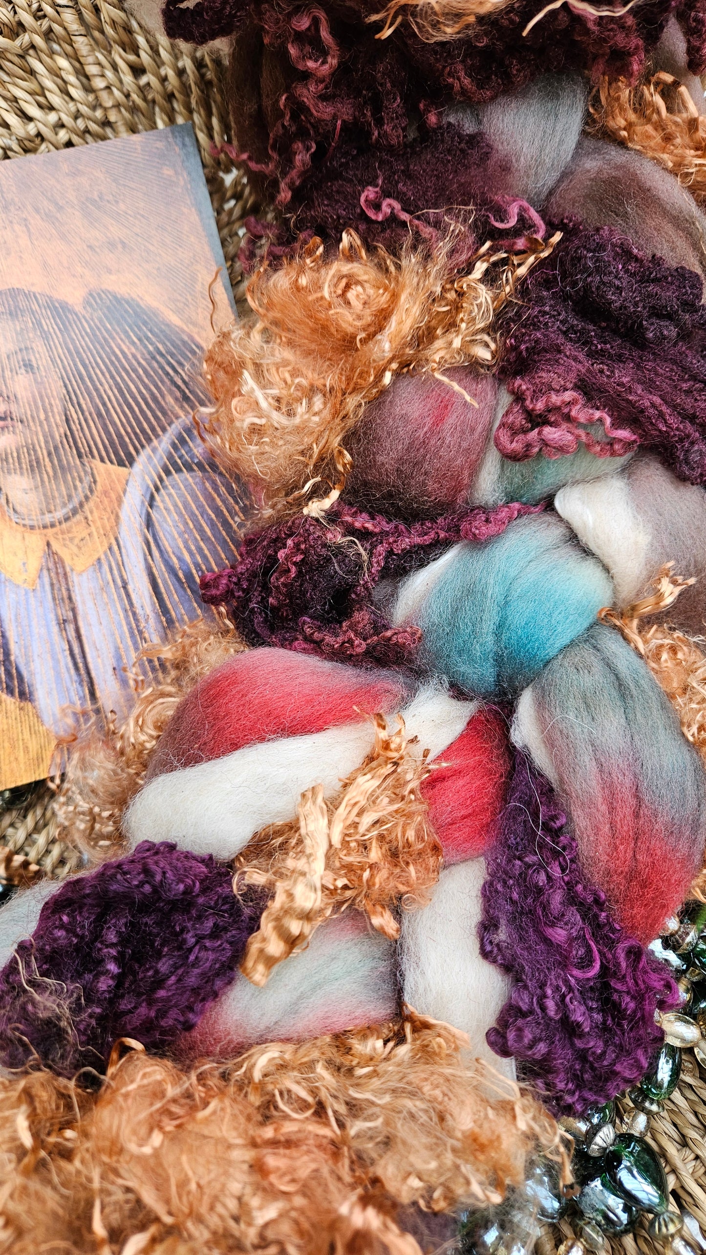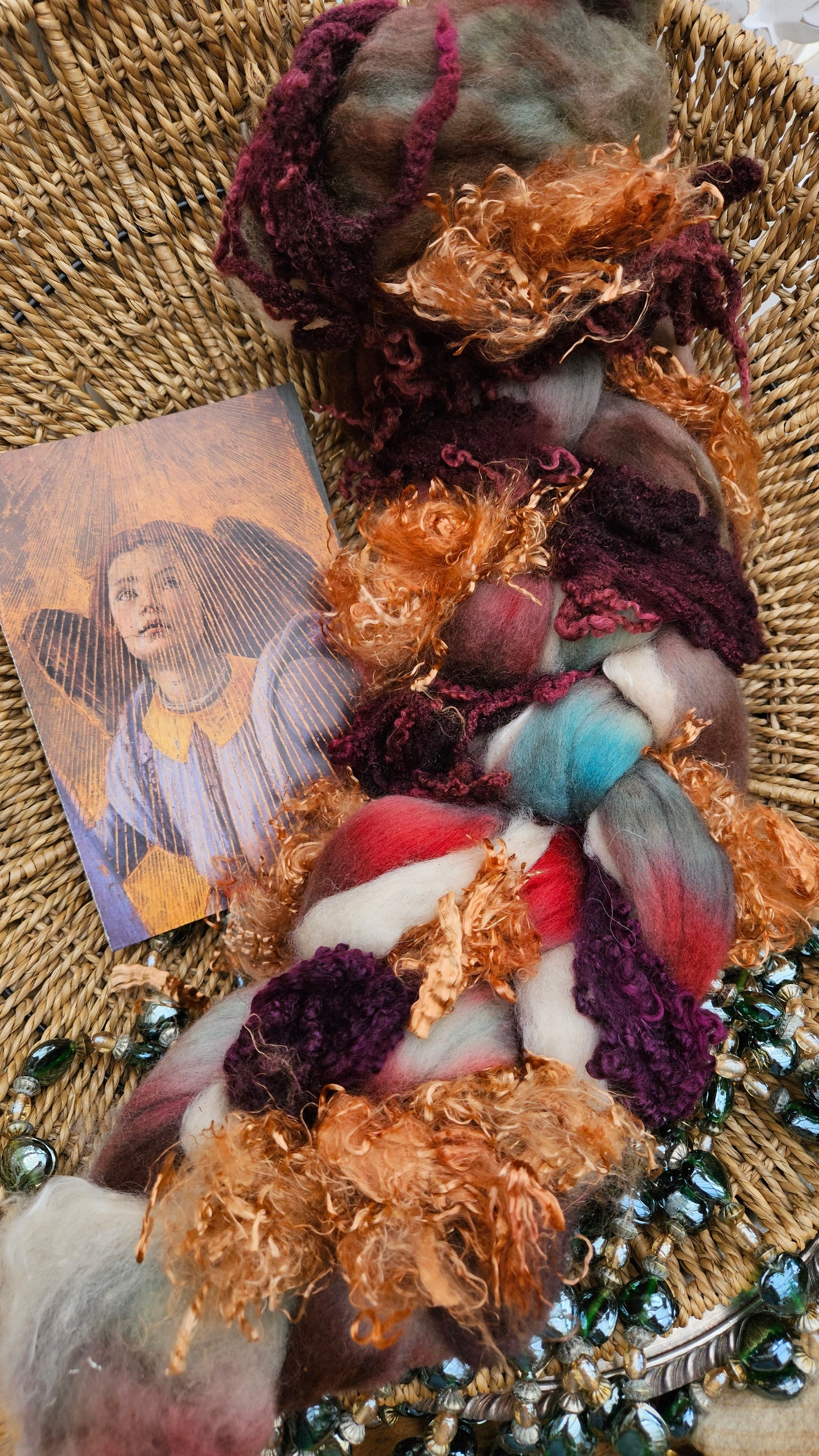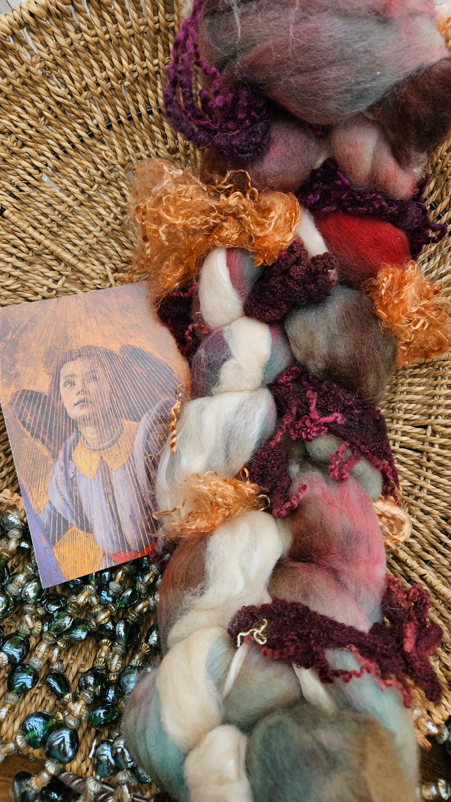 Inspired by the paintings of Botticelli using his timeless fine art colorway pallete. Each wool roving braid includes multiple breeds and textures of high quality fiber for blending and carding into art batts or spinning into yarn directly from the braid.