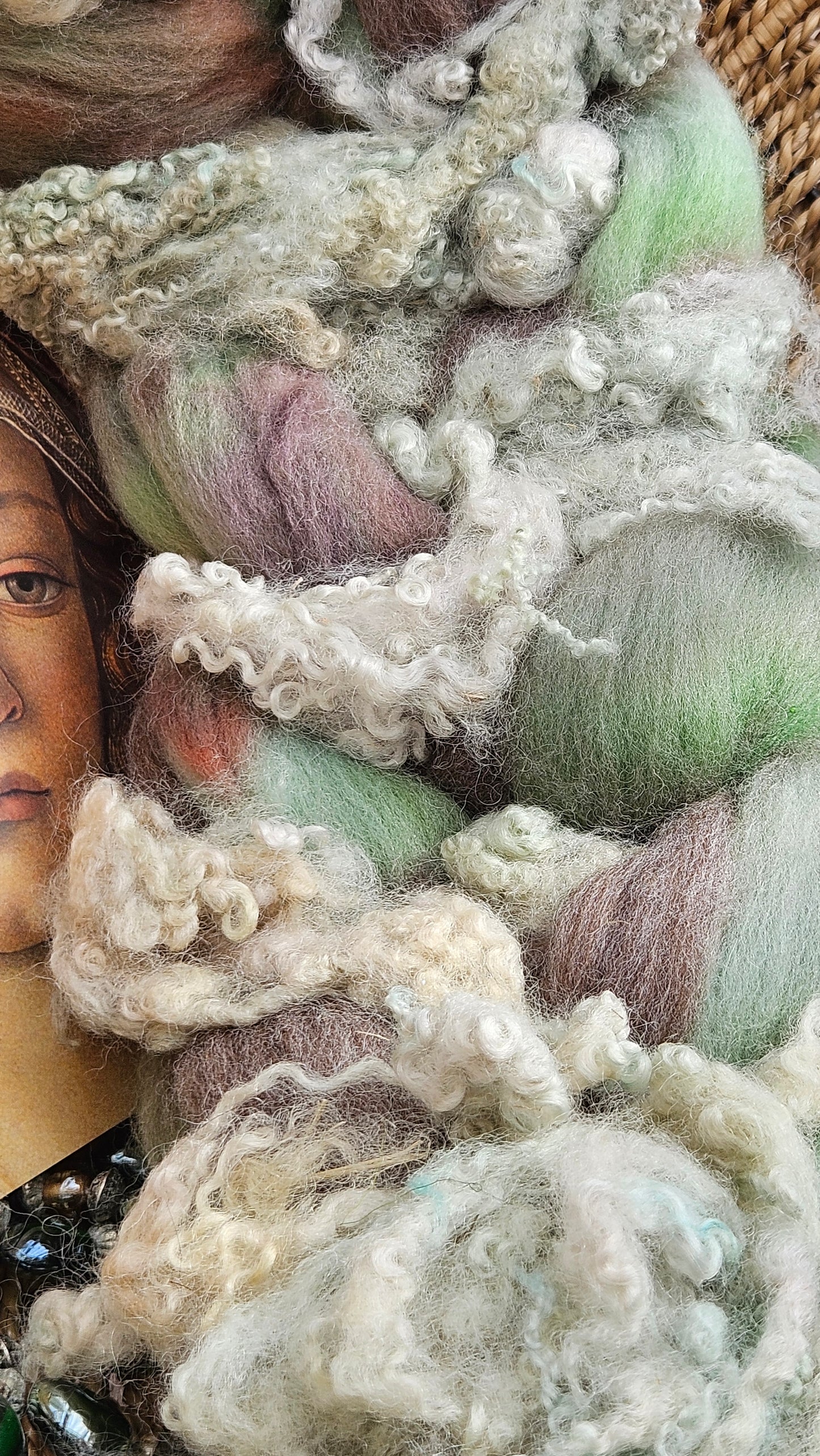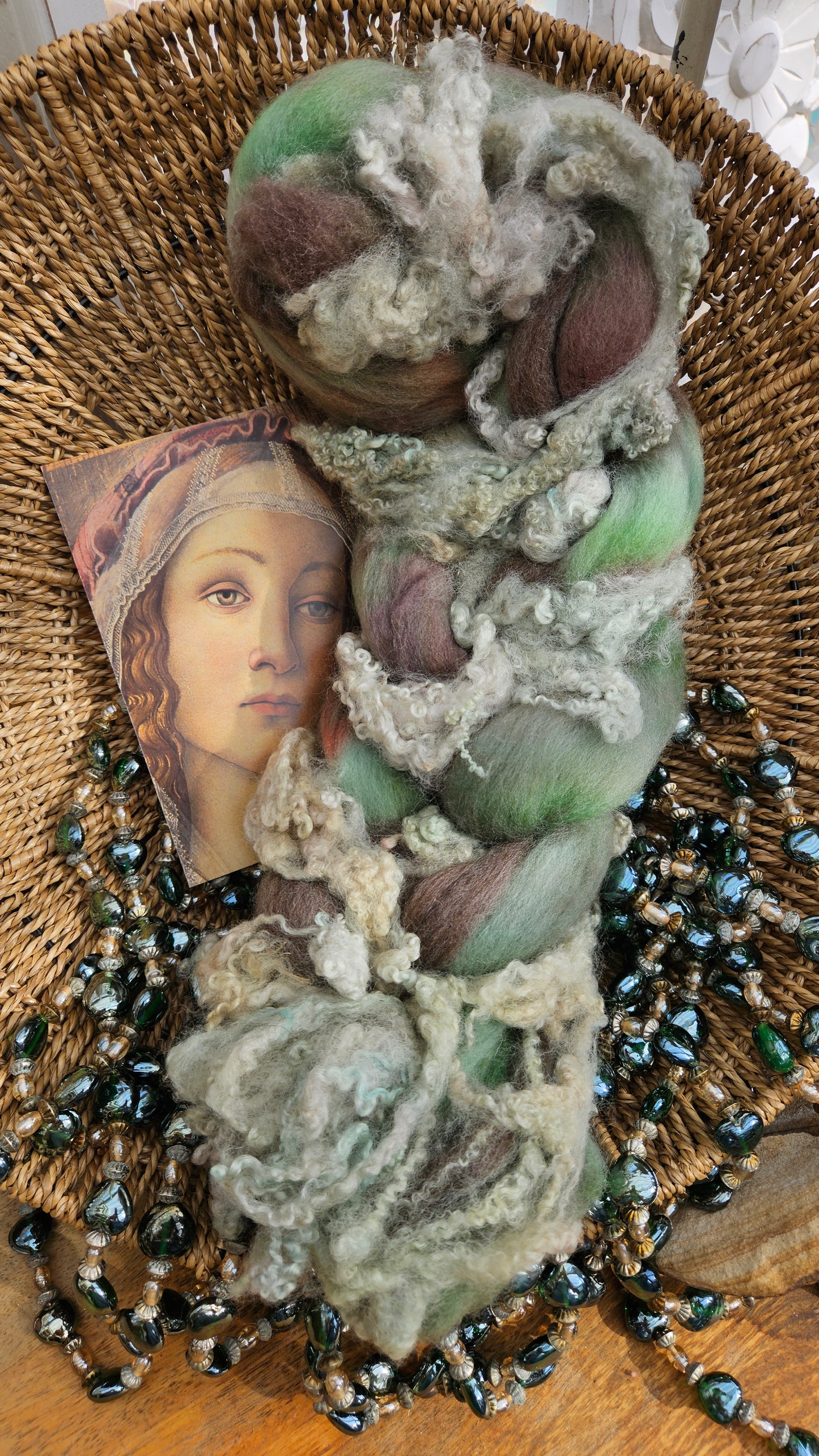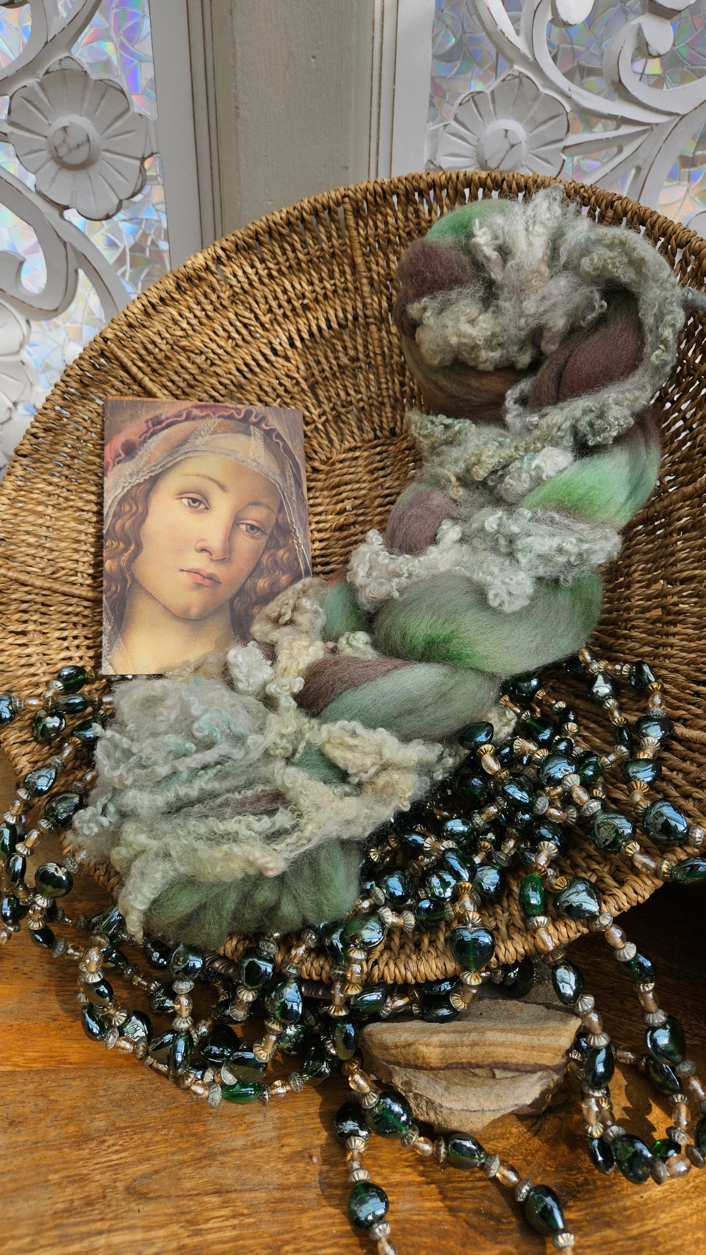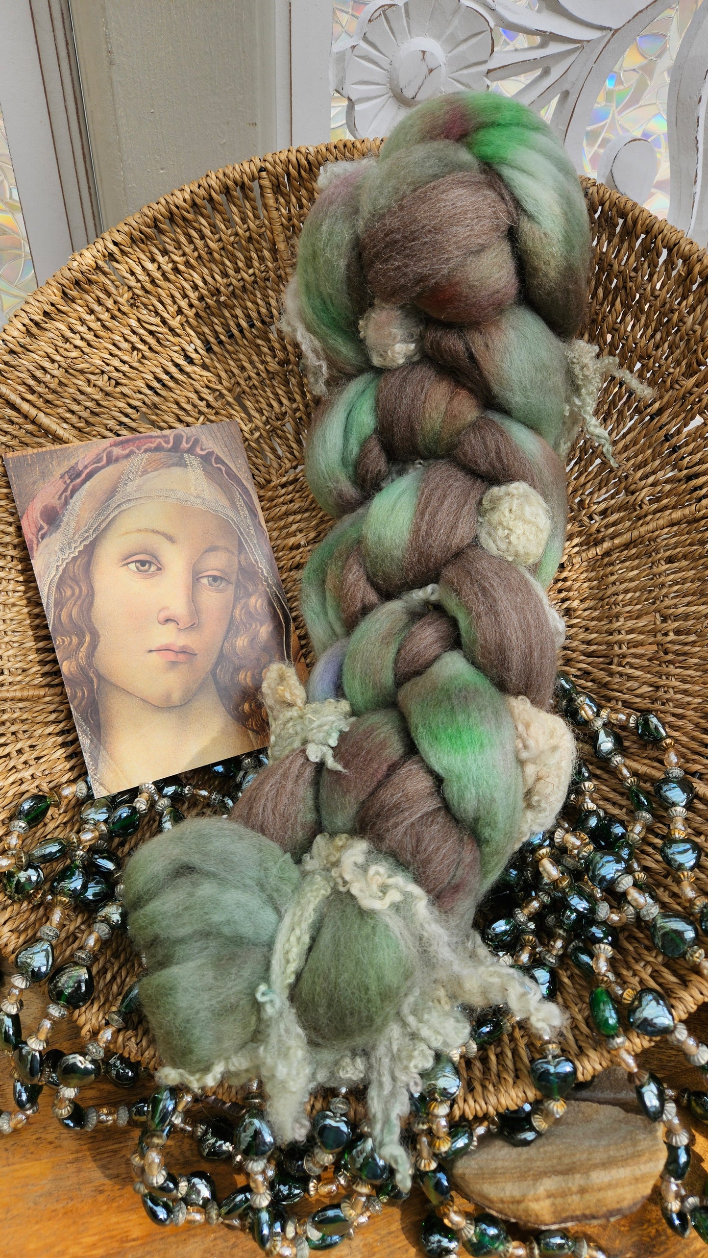 Inspired by the paintings of Botticelli using his timeless fine art colorway pallete. Each wool roving braid includes multiple breeds and textures of high quality fiber for blending and carding into art batts or spinning into yarn directly from the braid.