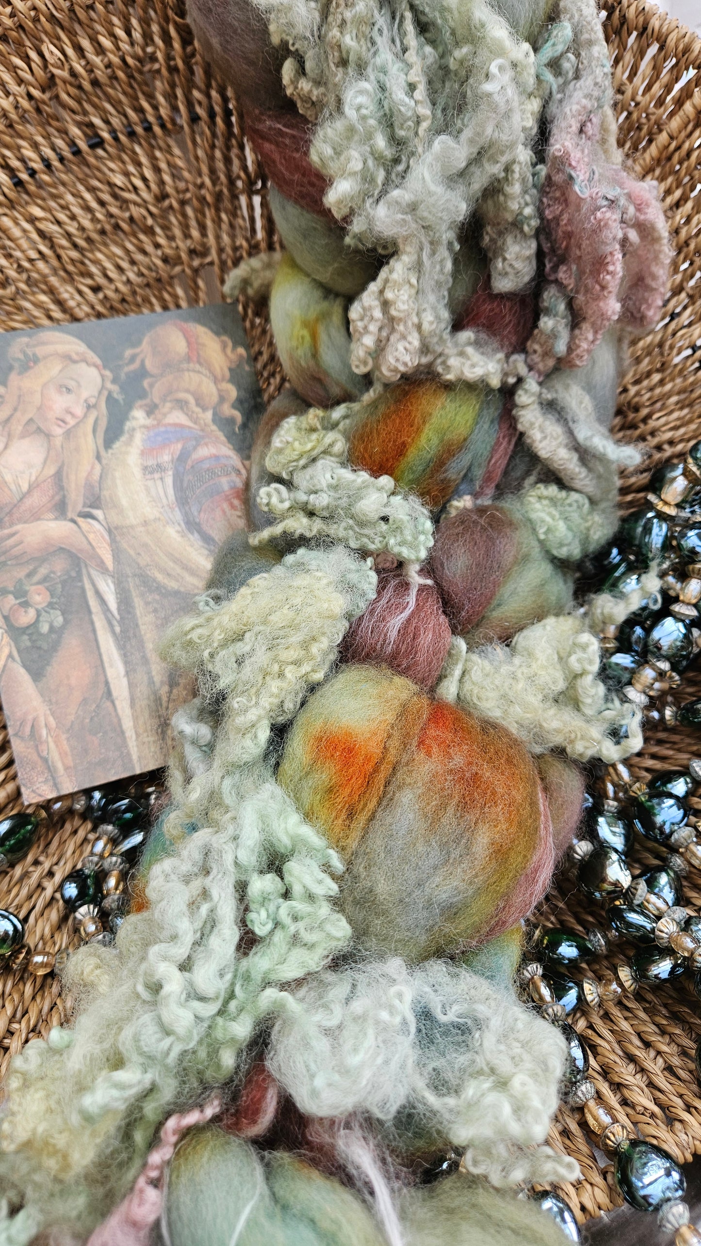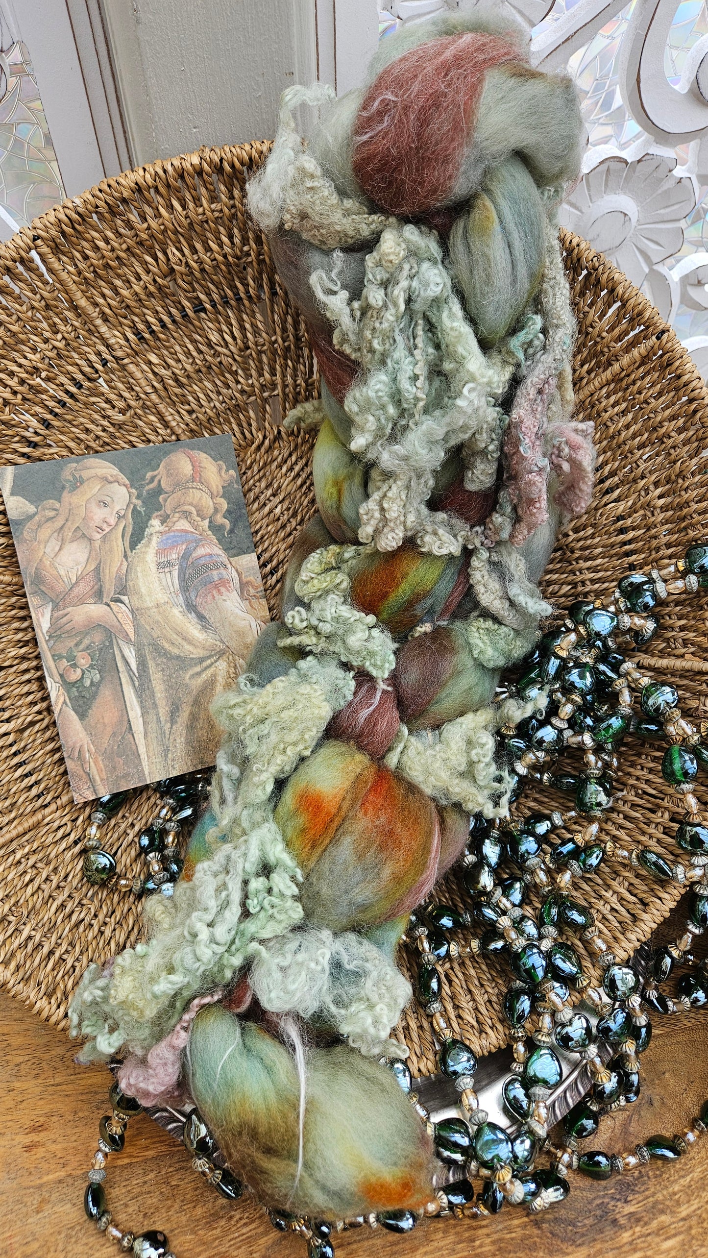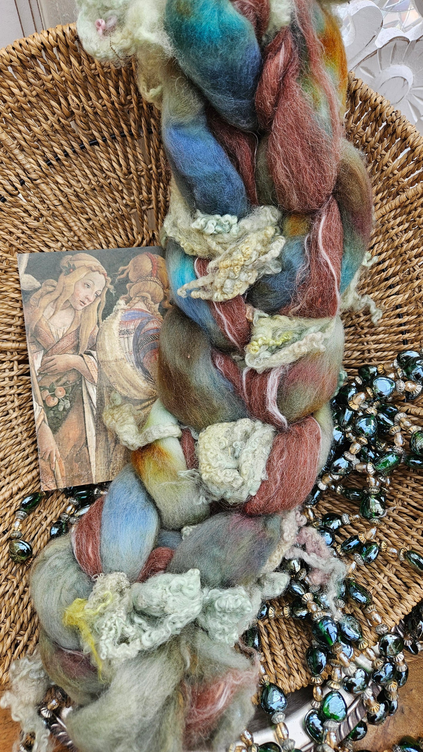 Inspired by the paintings of Botticelli using his timeless fine art colorway pallete. Each wool roving braid includes multiple breeds and textures of high quality fiber for blending and carding into art batts or spinning into yarn directly from the braid.