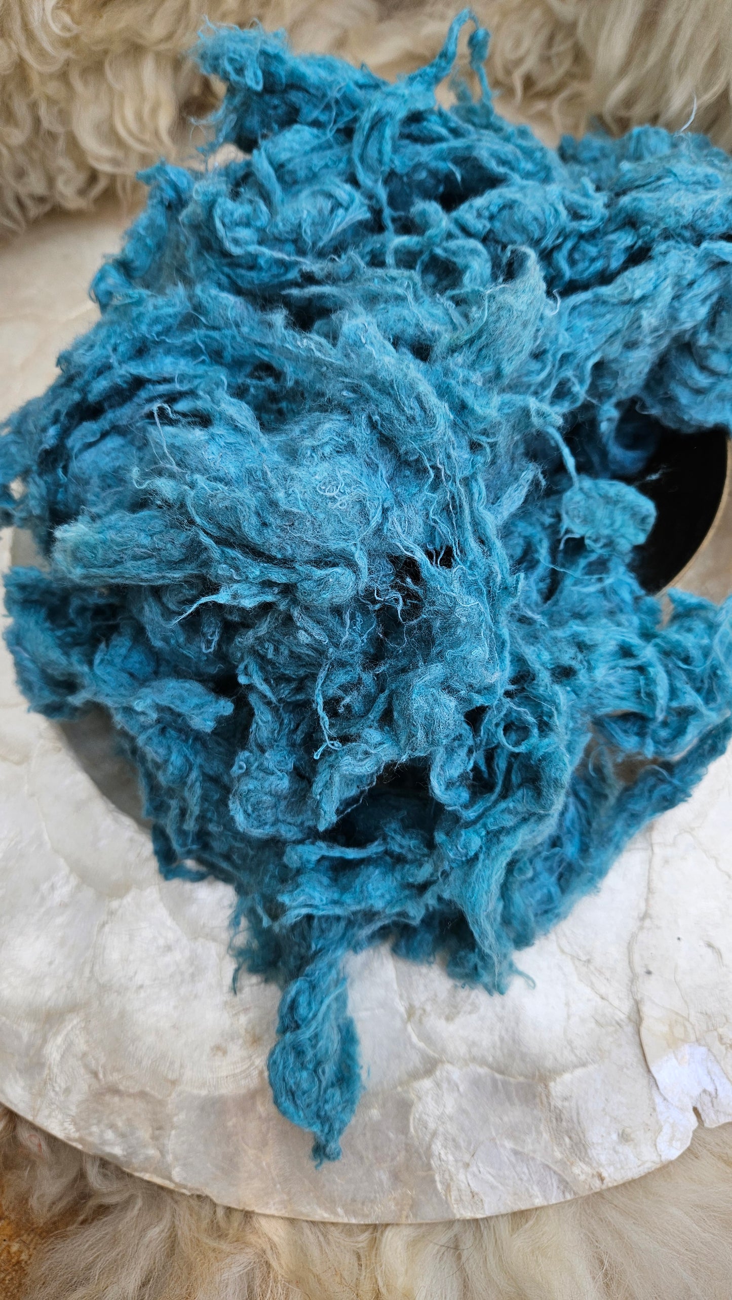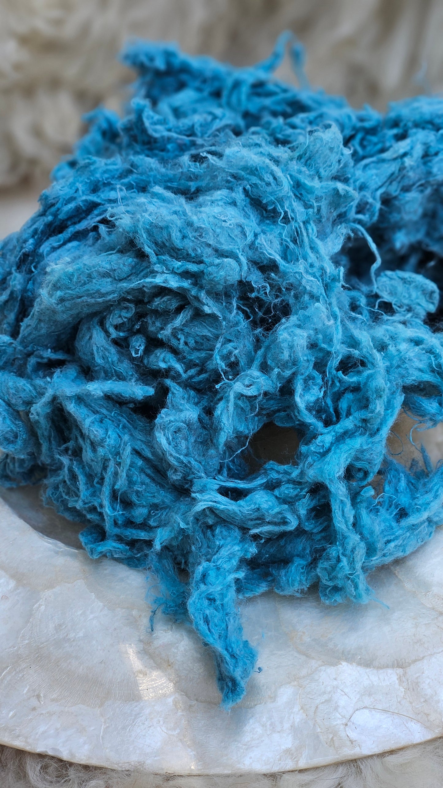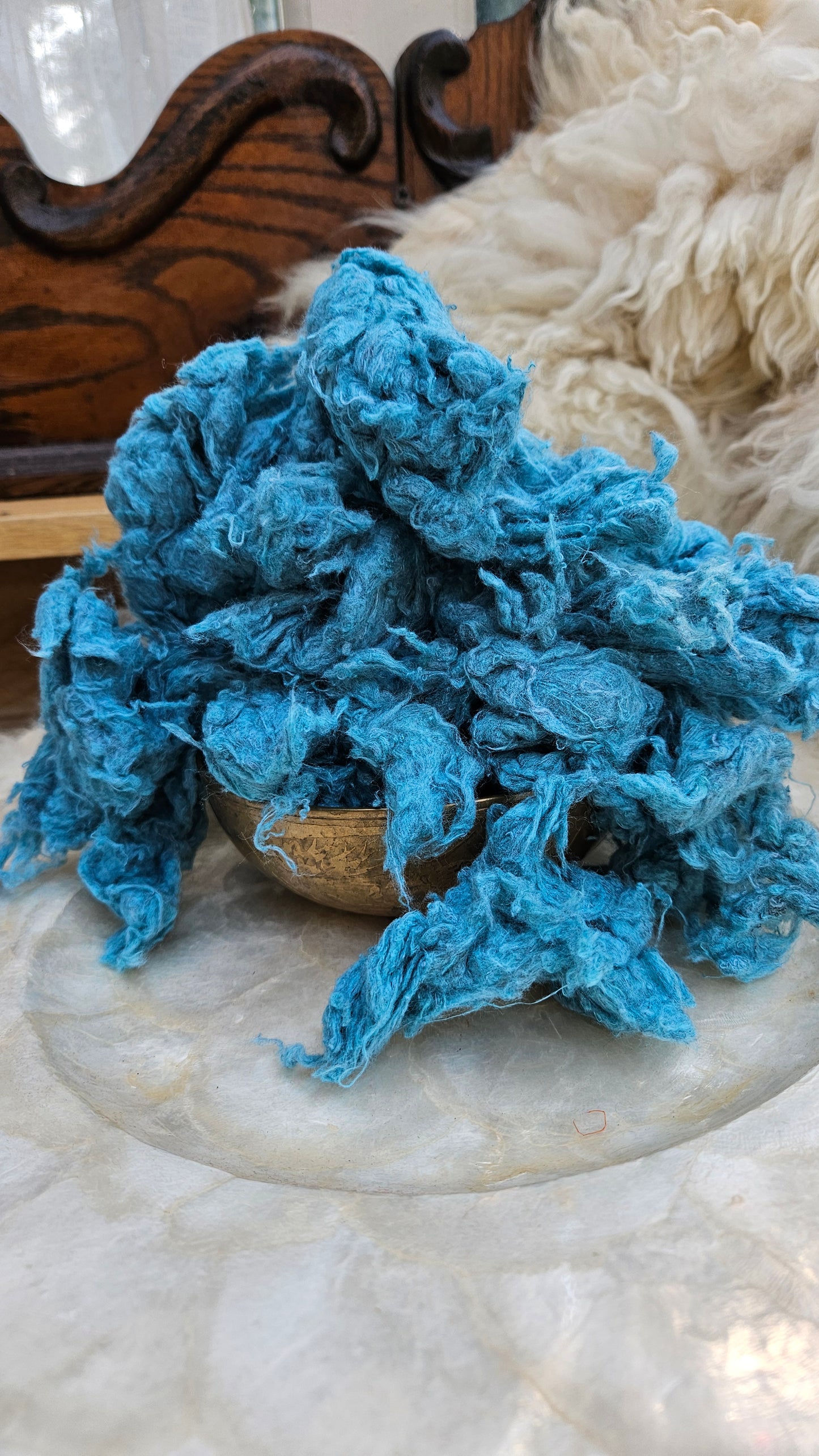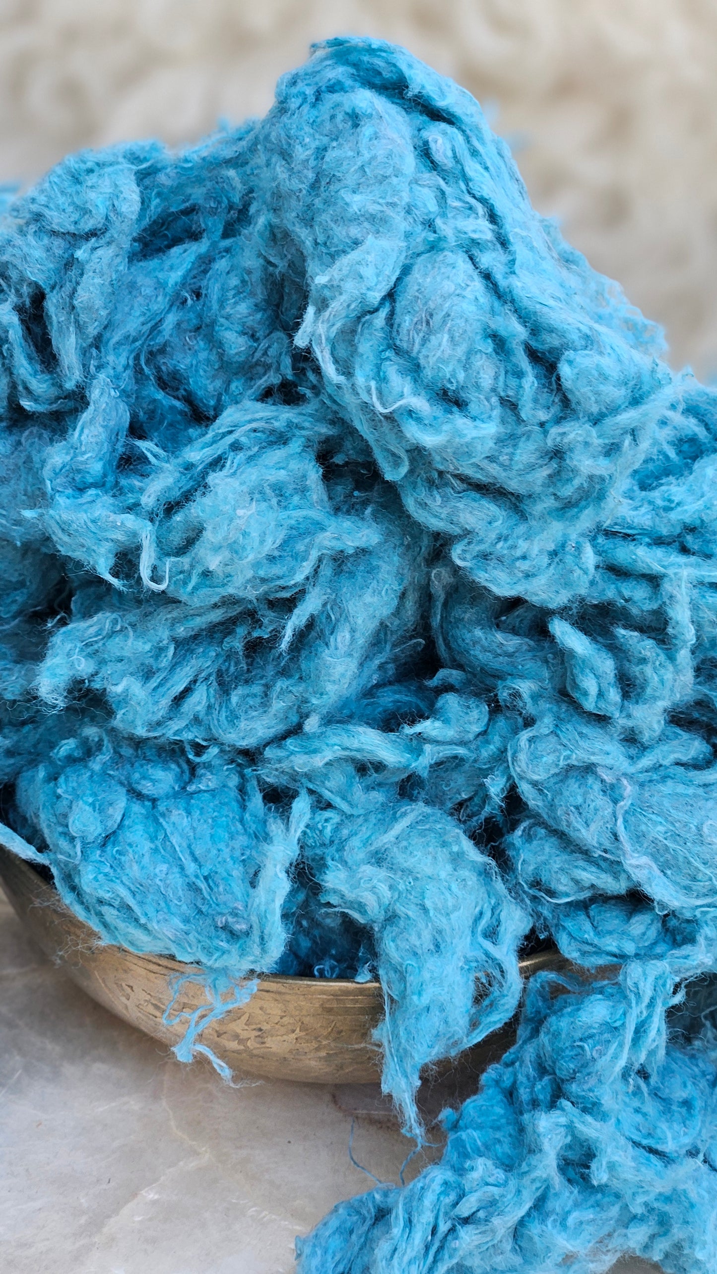 Recycled zero waste hand-dyed cotton noil that pulls apart like feathers and creates a hazy delightful tweed texture in art batts and rolags. Next to skin soft, dense, and textured with fine cut threads.