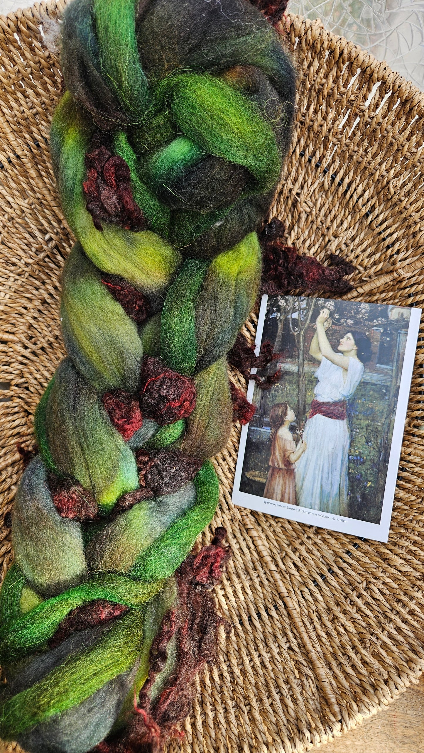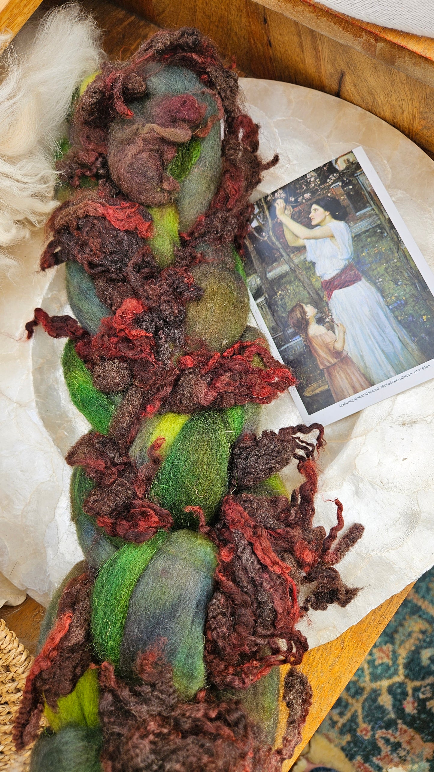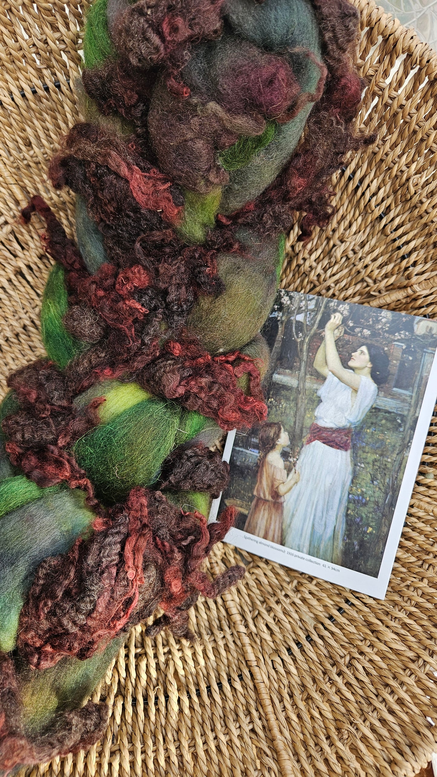 Inspired by the impressionist paintings of Waterhouse using his timeless fine art colorway pallete. Each wool roving braid includes multiple breeds and textures of high quality fiber for blending and carding into art batts or spinning into yarn directly from the braid.