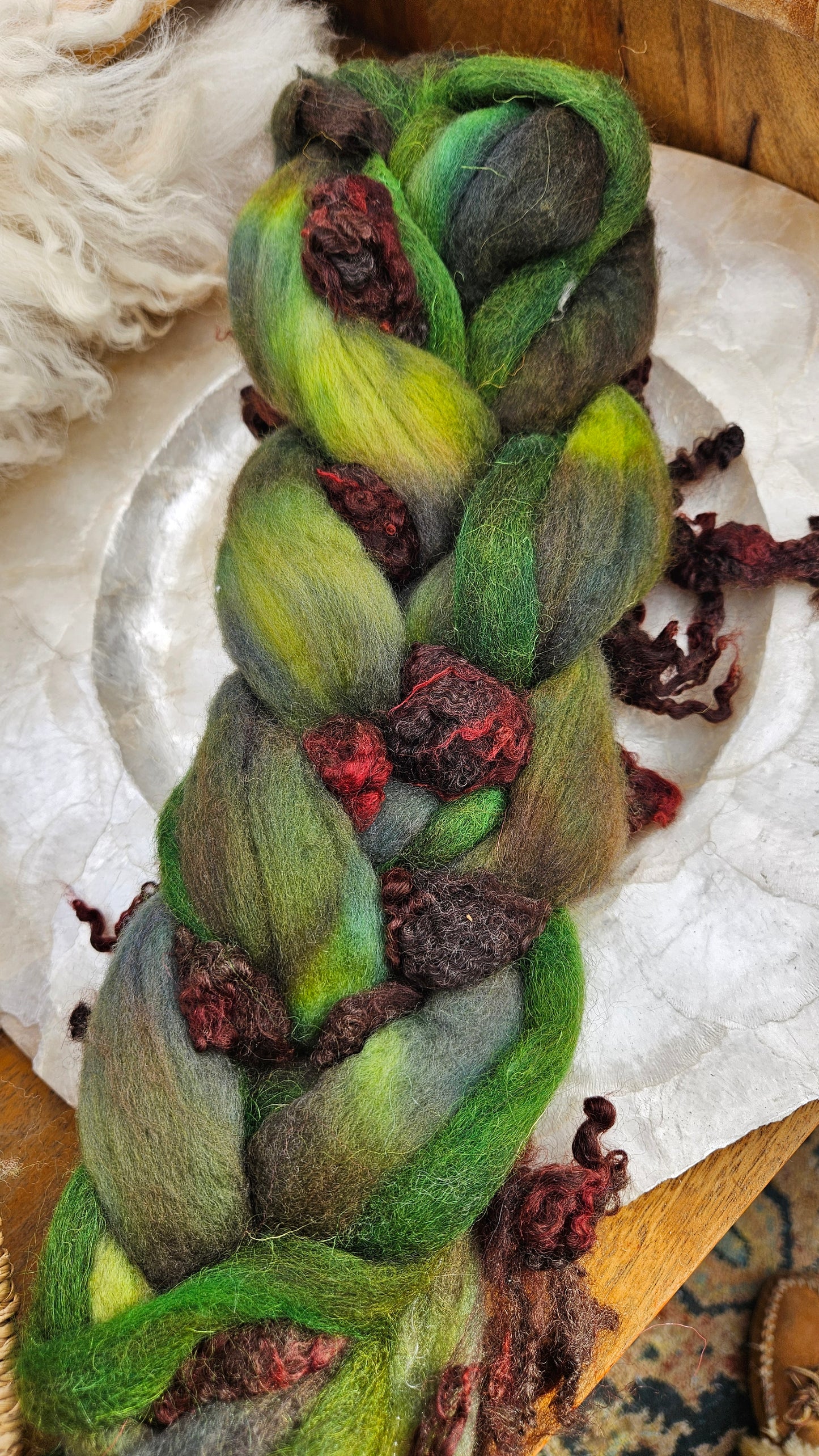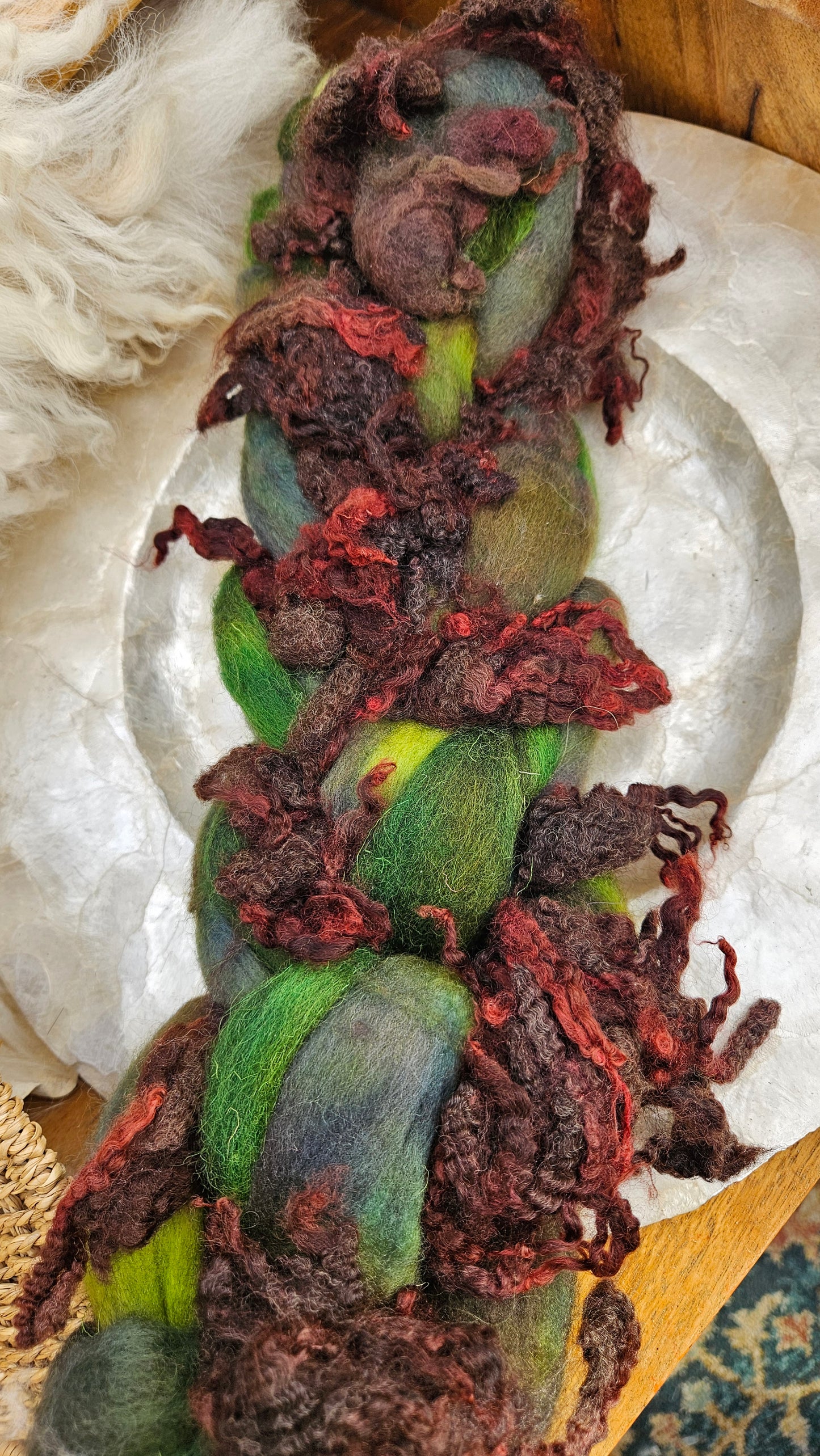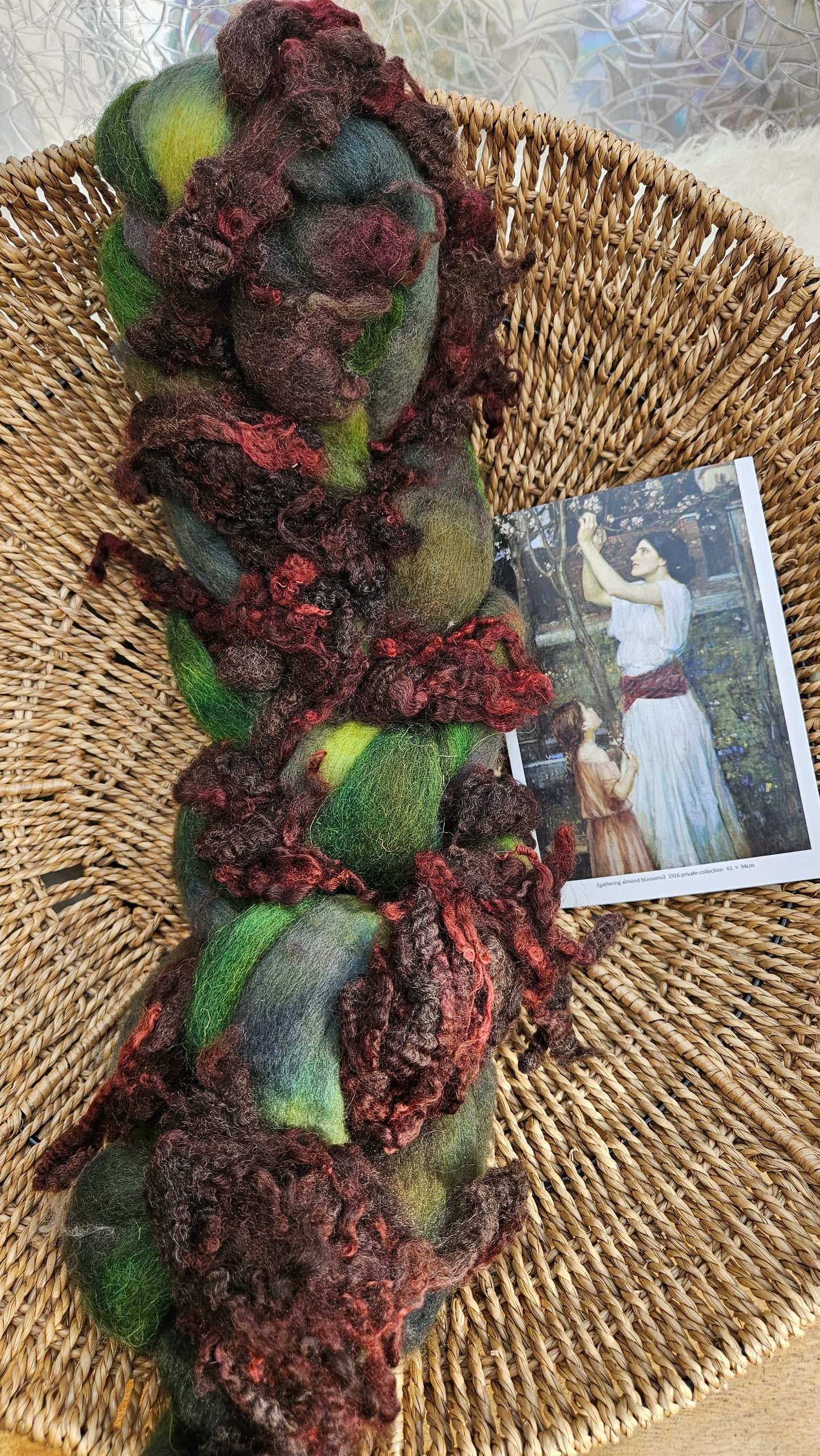Inspired by the impressionist paintings of Waterhouse using his timeless fine art colorway pallete. Each wool roving braid includes multiple breeds and textures of high quality fiber for blending and carding into art batts or spinning into yarn directly from the braid.