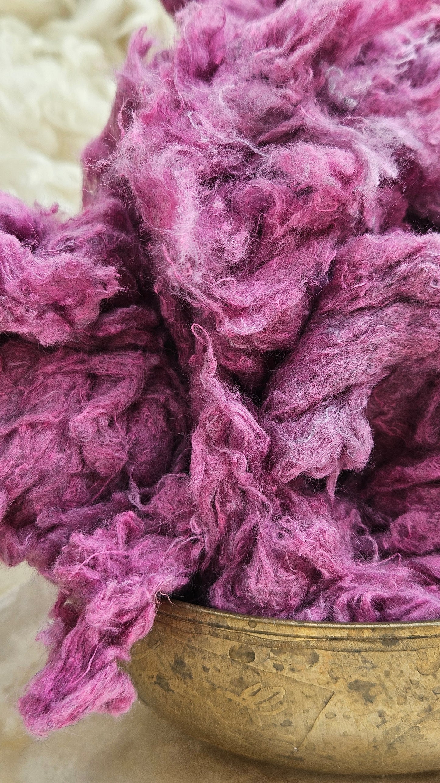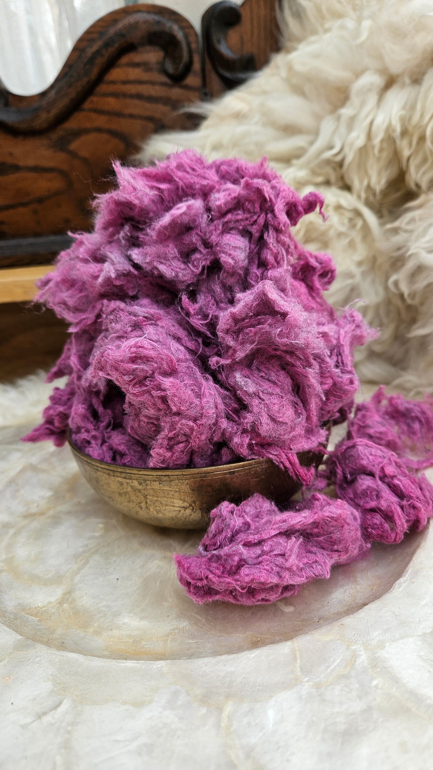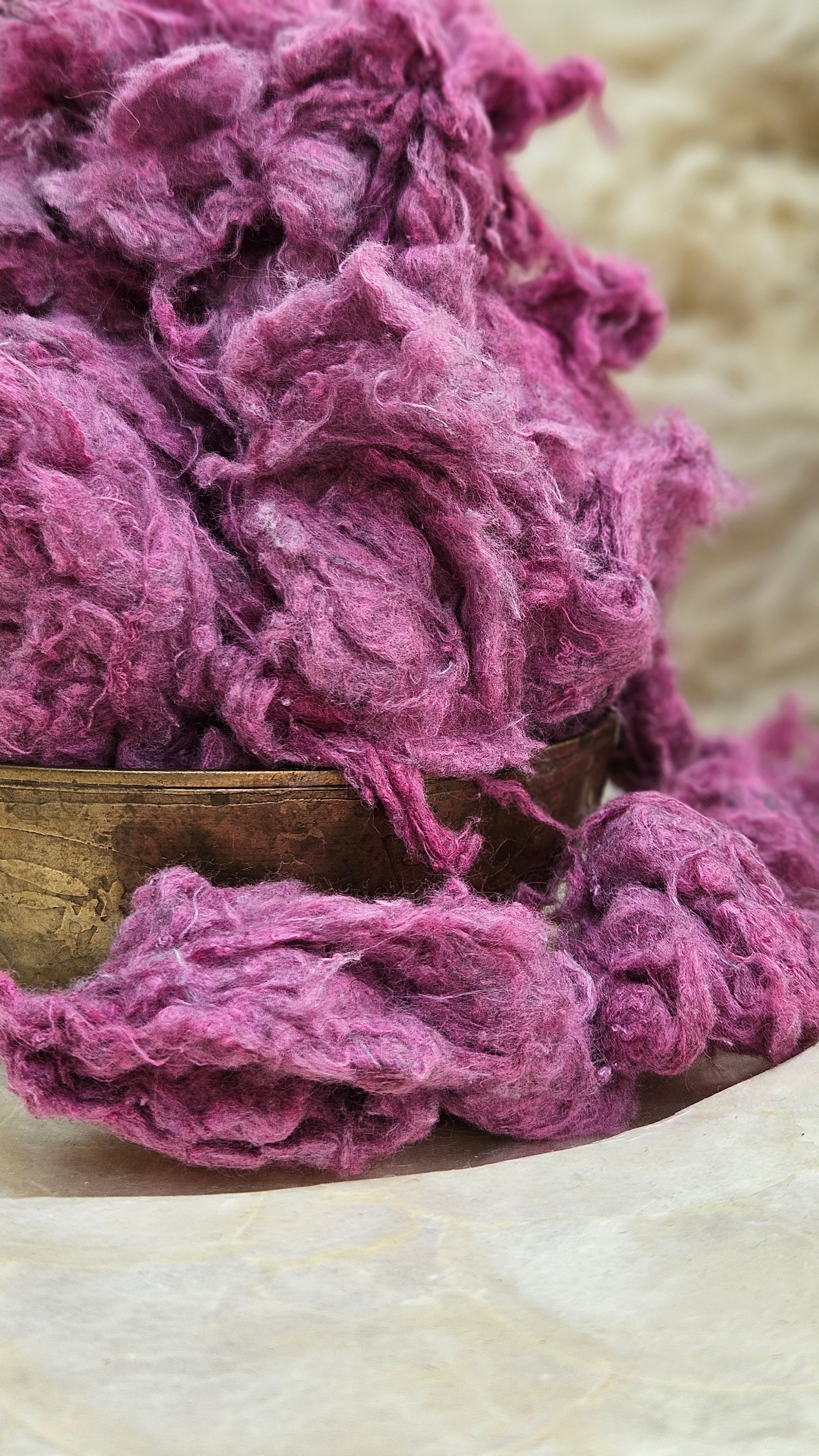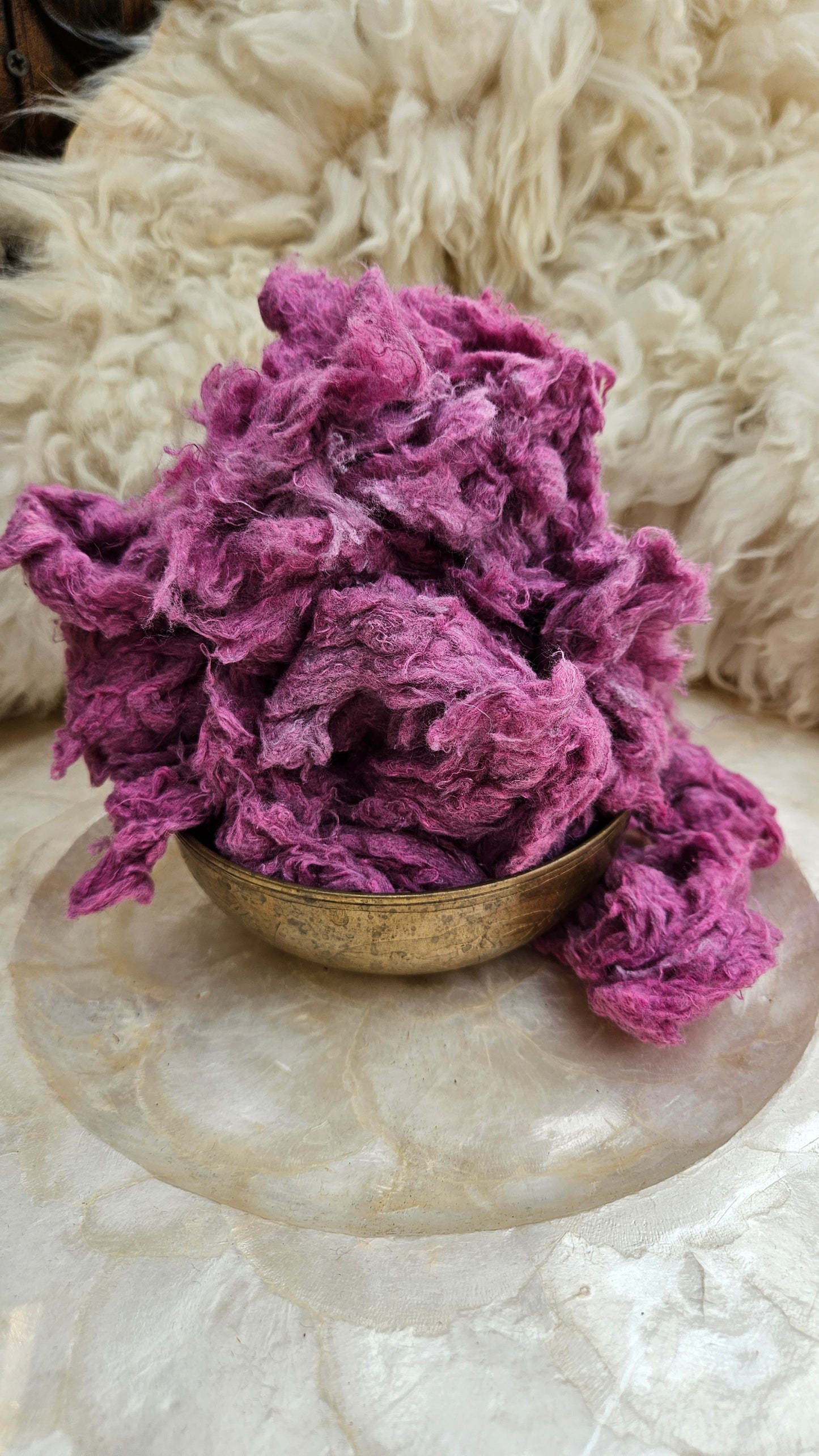 Recycled zero waste hand-dyed cotton noil that pulls apart like feathers and creates a hazy delightful tweed texture in art batts and rolags. Next to skin soft, dense, and textured with fine cut threads.