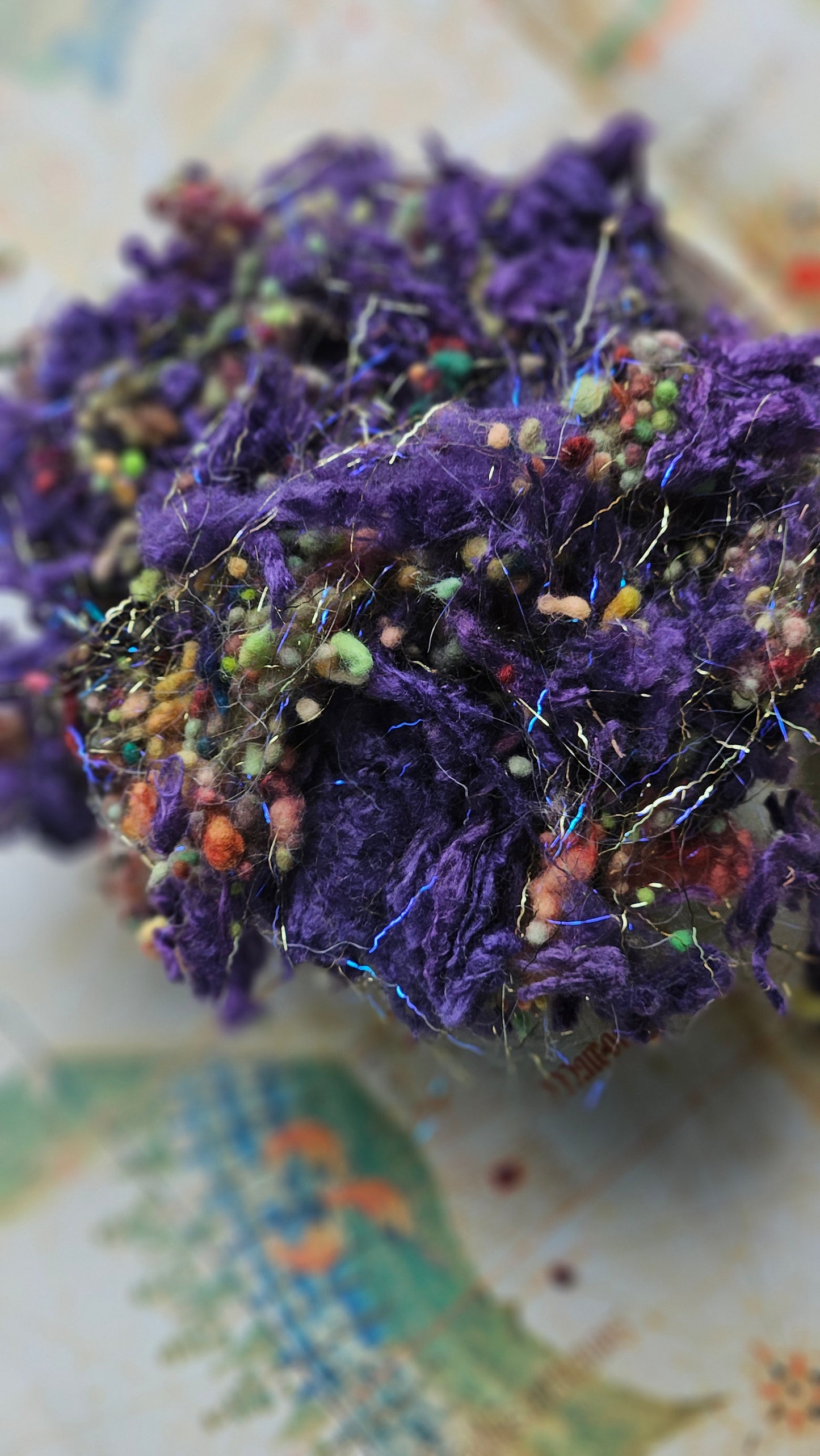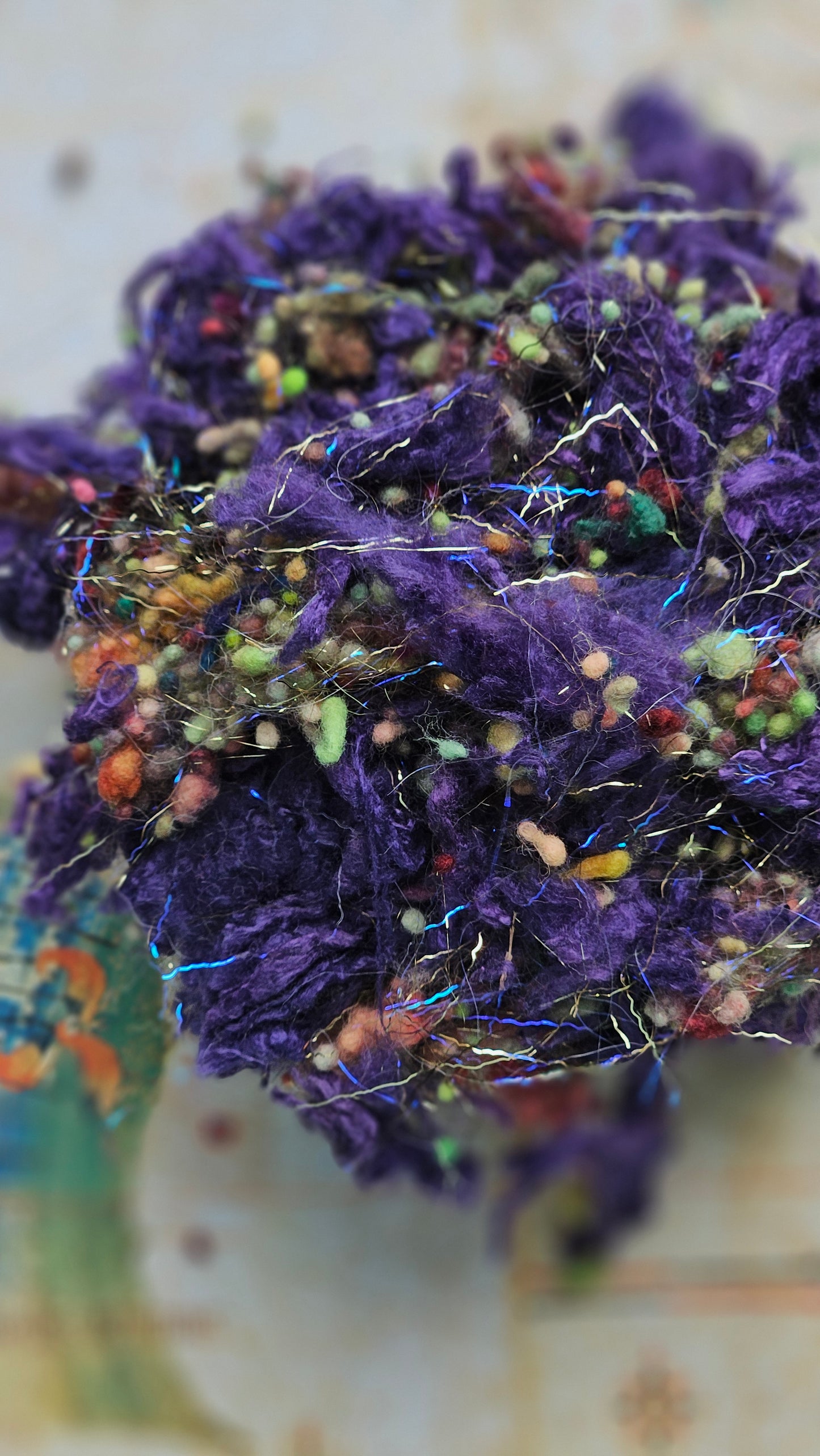 Rich royal-purple bamboo nubs with a hint of sparkle, blended with fine wool nepps for irresistible texture.