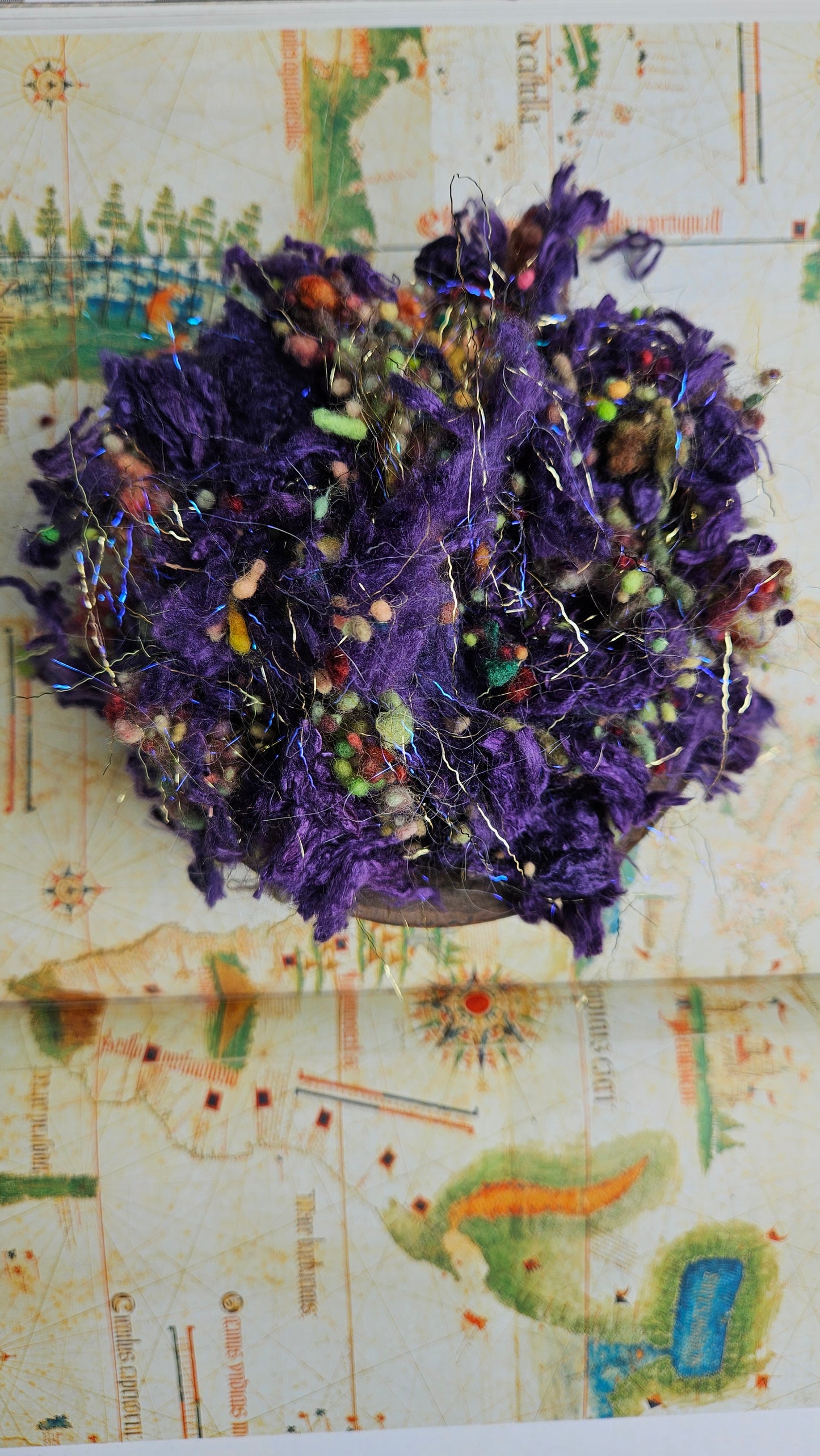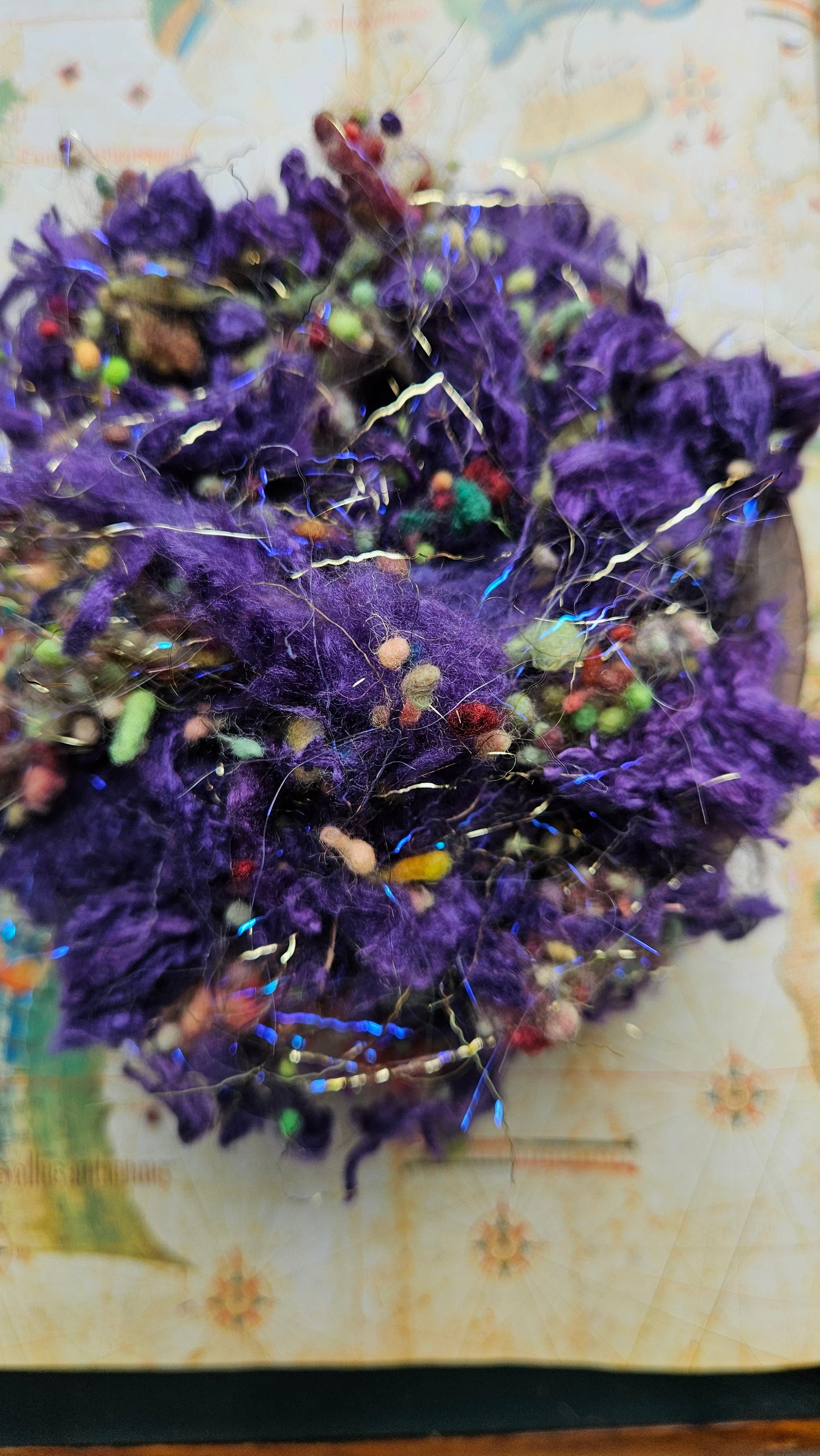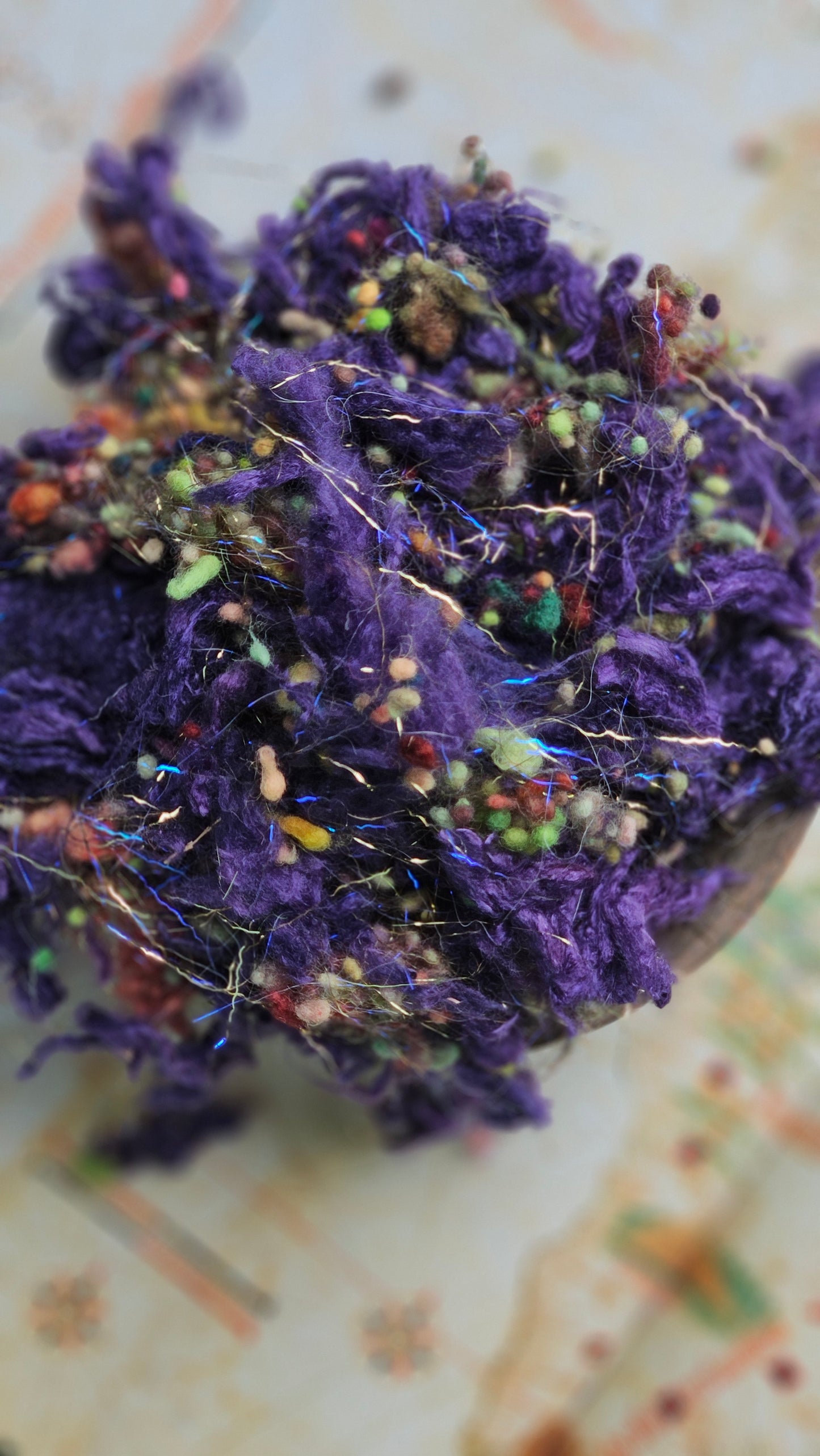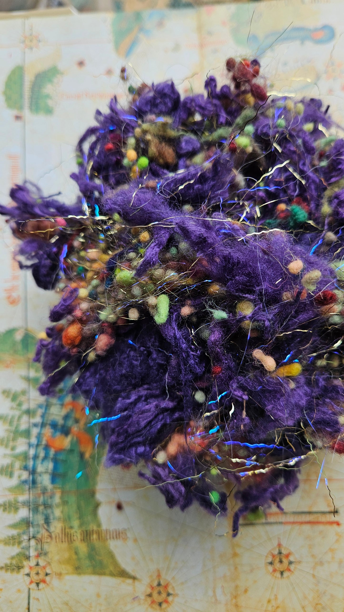 The vibrant purple hand-cut bamboo in this collection (inspired by the royal garments and tapestries of ancient civilizations) takes center stage, bringing deep color and a touch of sheen to your spinning, felting, and fiber art. The wool nepps - a zero waste recycled fiber of the wool industry - adds playful, bumpy “polka-dot” texture.