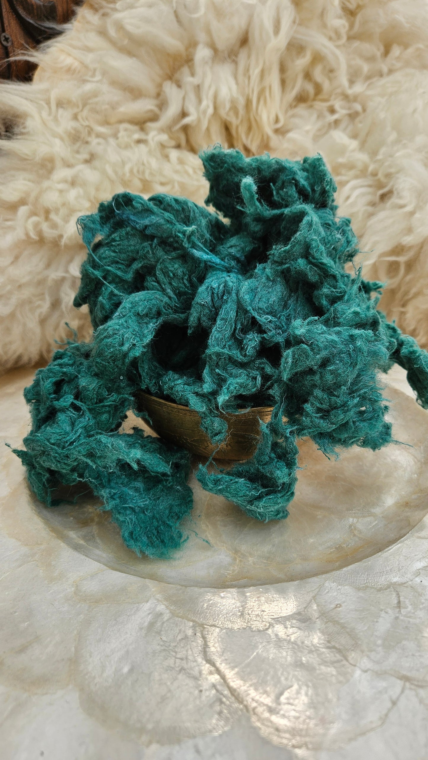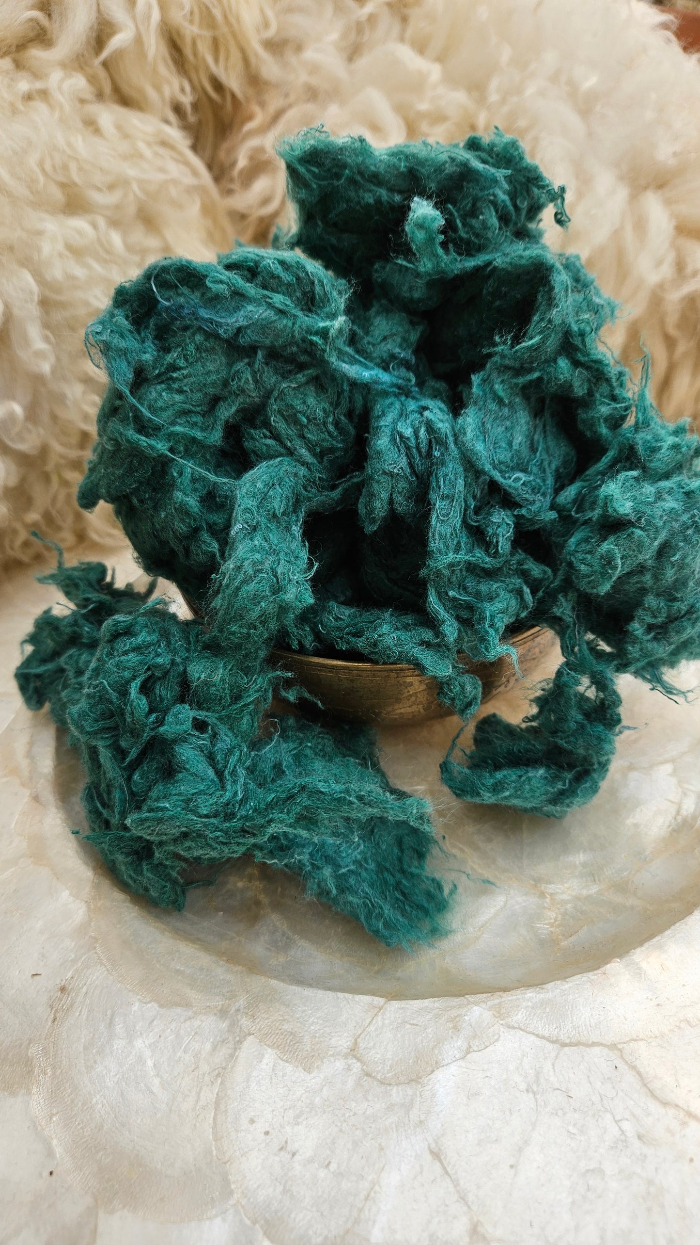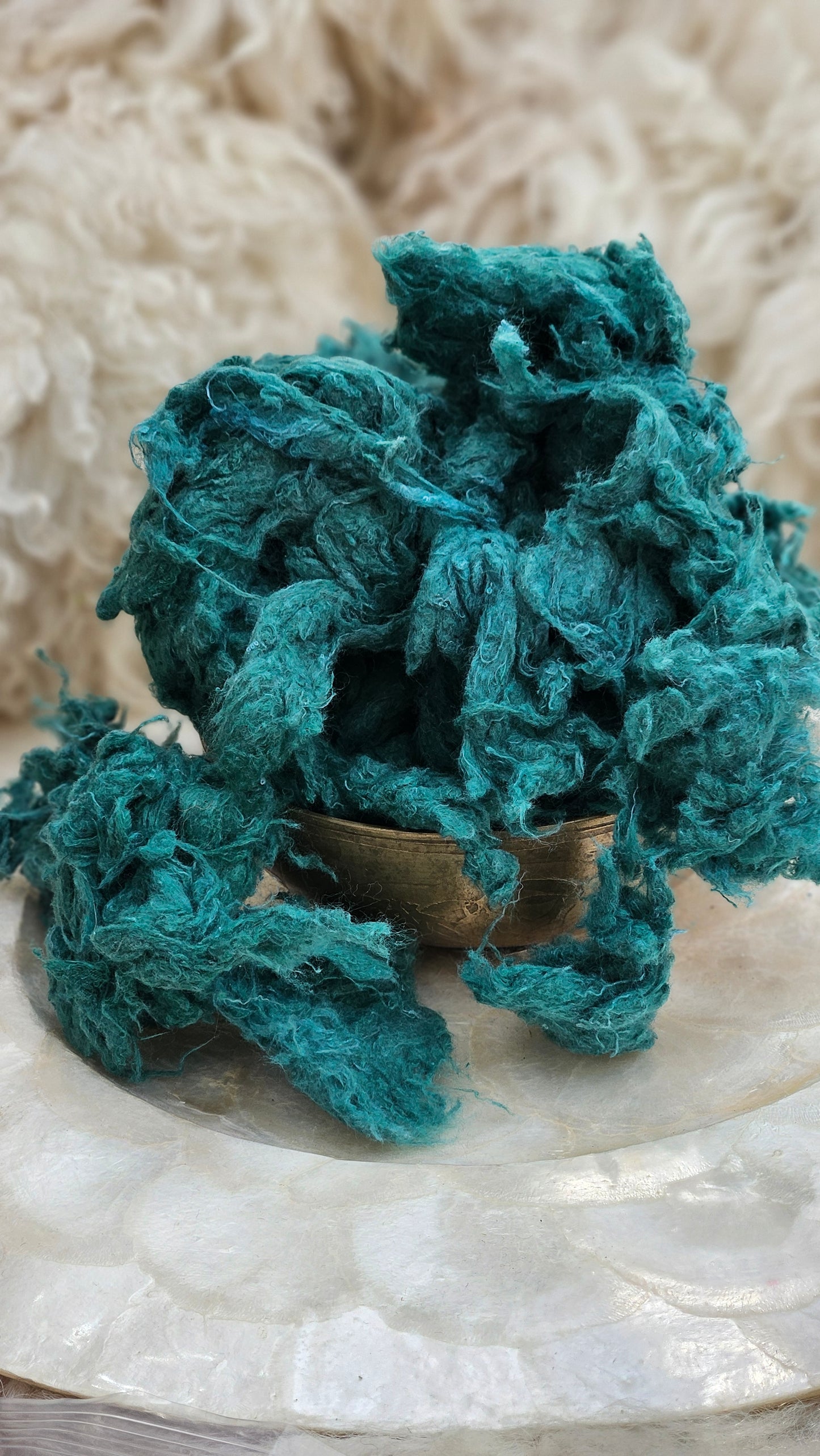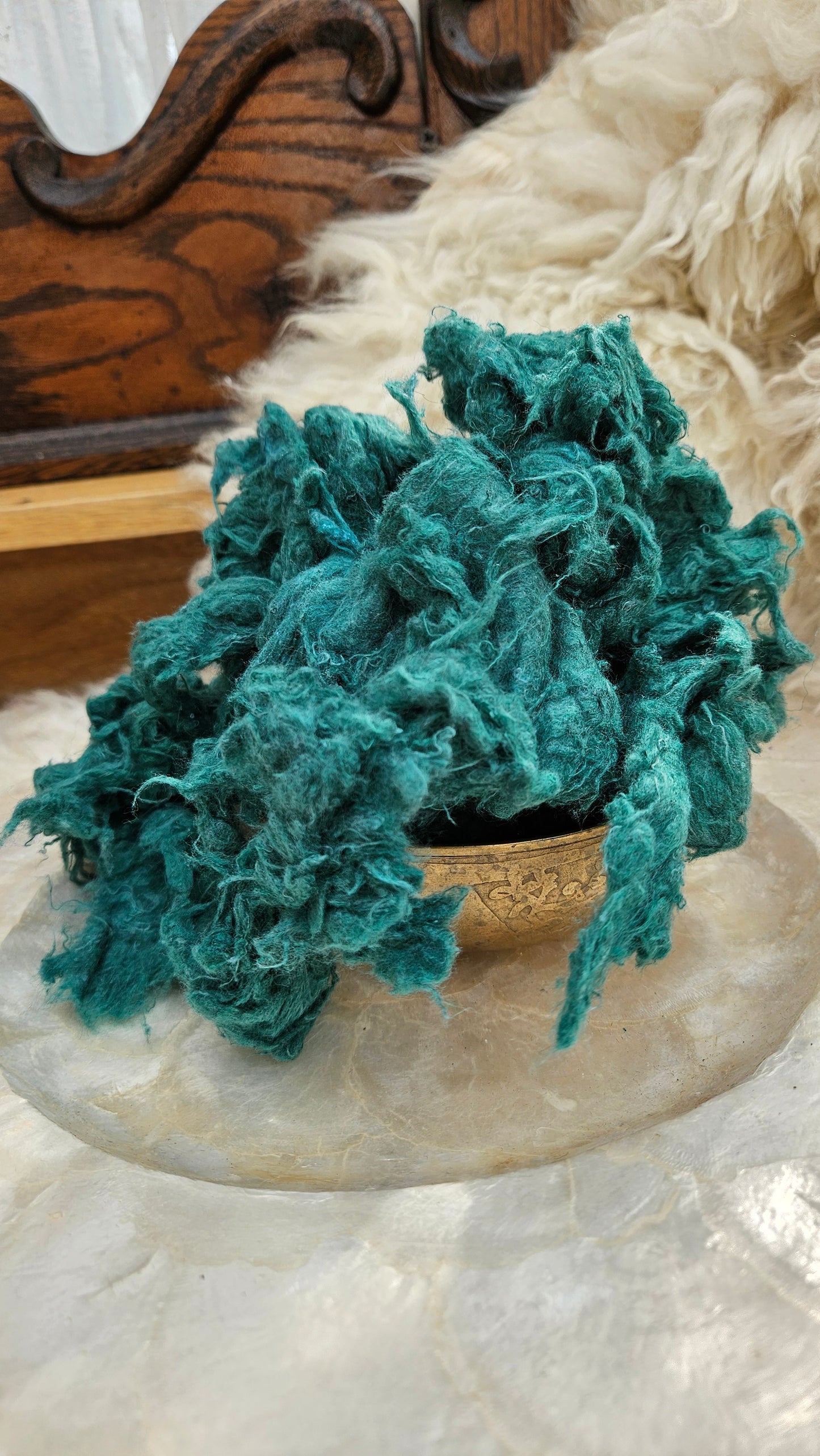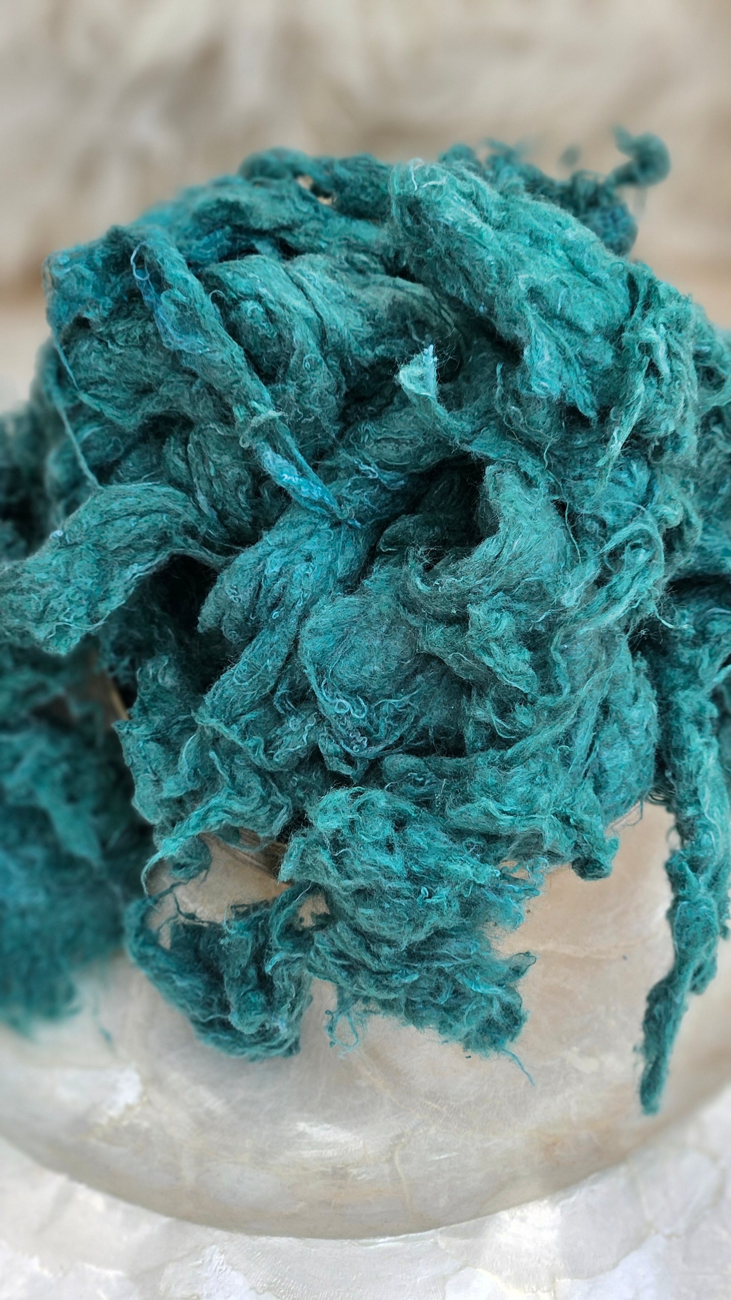 Recycled zero waste hand-dyed cotton noil that pulls apart like feathers and creates a hazy delightful tweed texture in art batts and rolags. Next to skin soft, dense, and textured with fine cut threads.