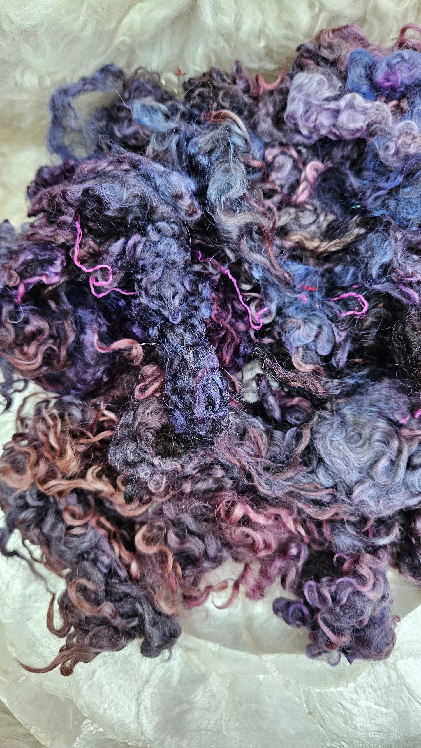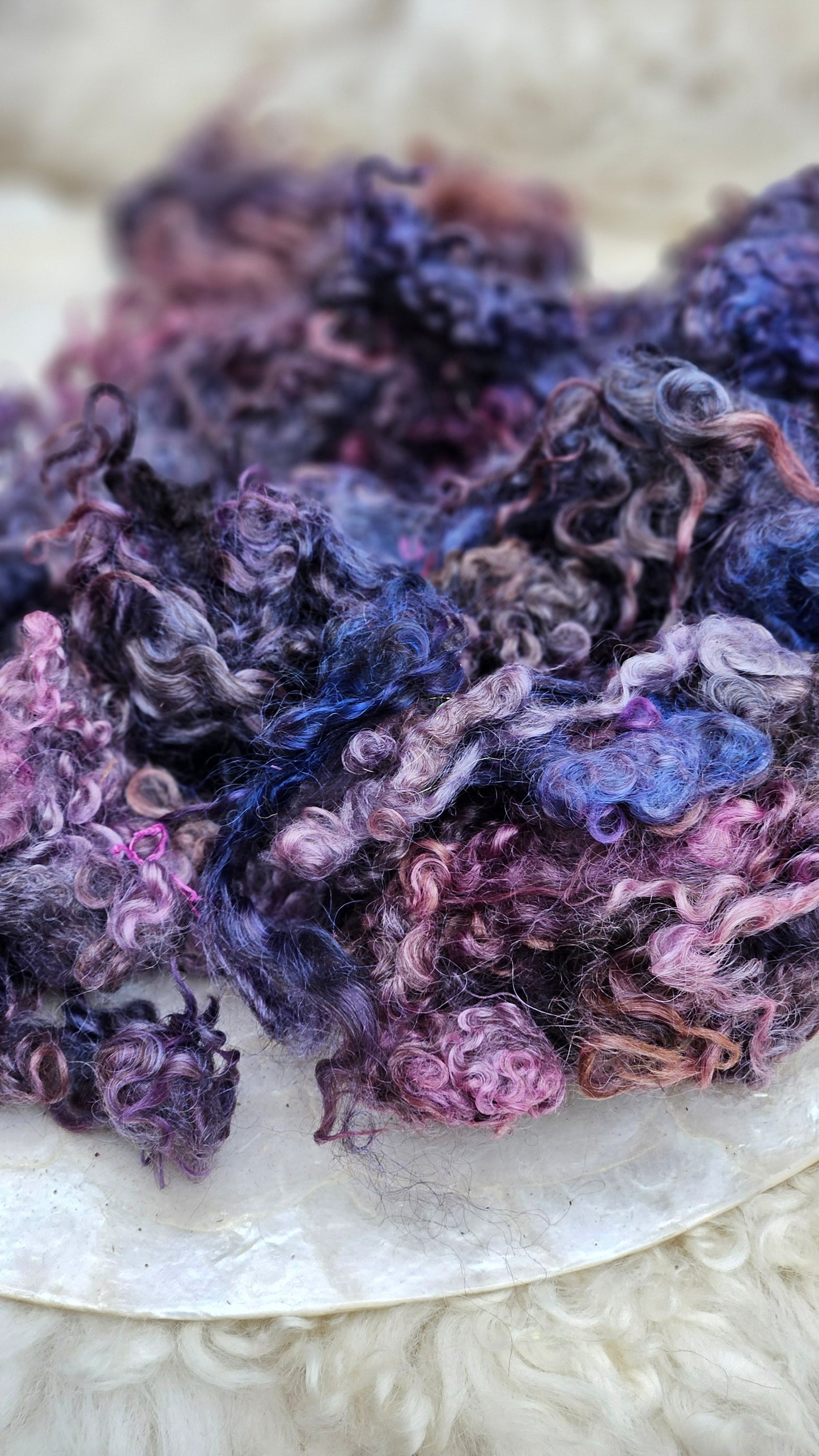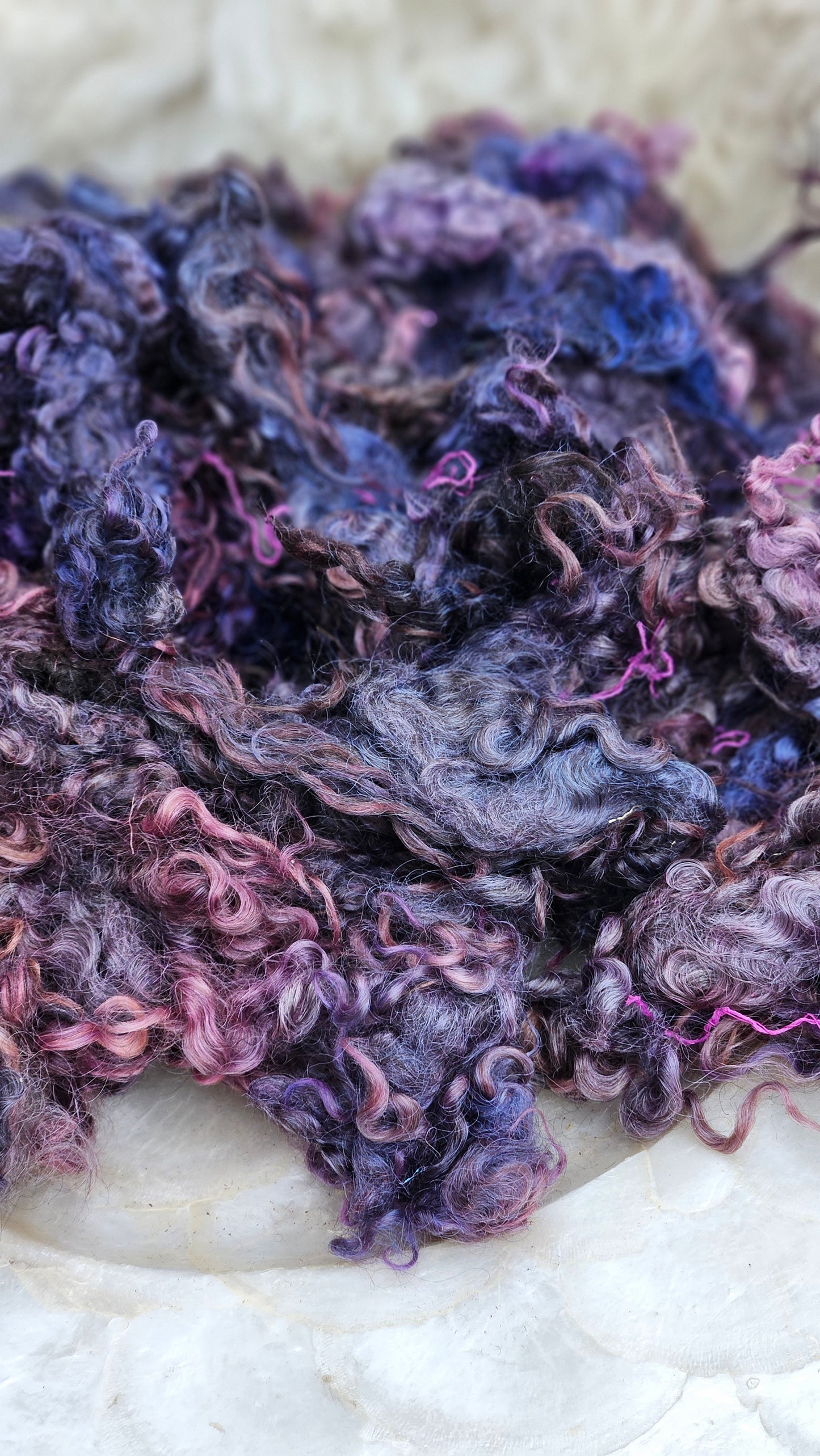 From a lamb raised on a small family farm in New England. Sourced at a local sheep and wool festival. Gently washed and dyed by hand in limited colorways. Each bag will be slightly different due to the nuance in the dyed locks.