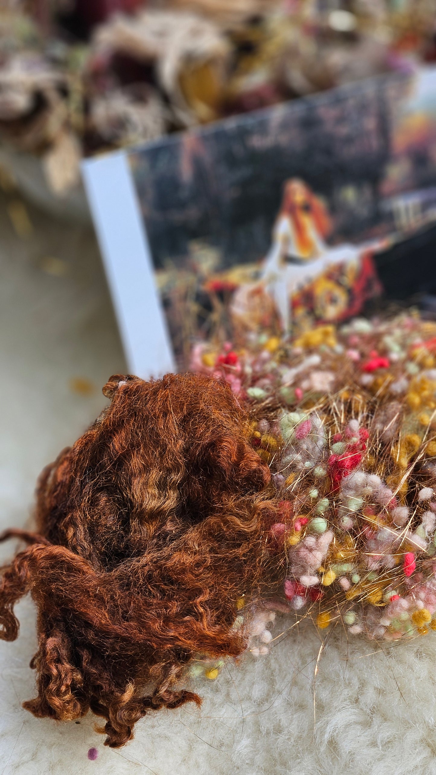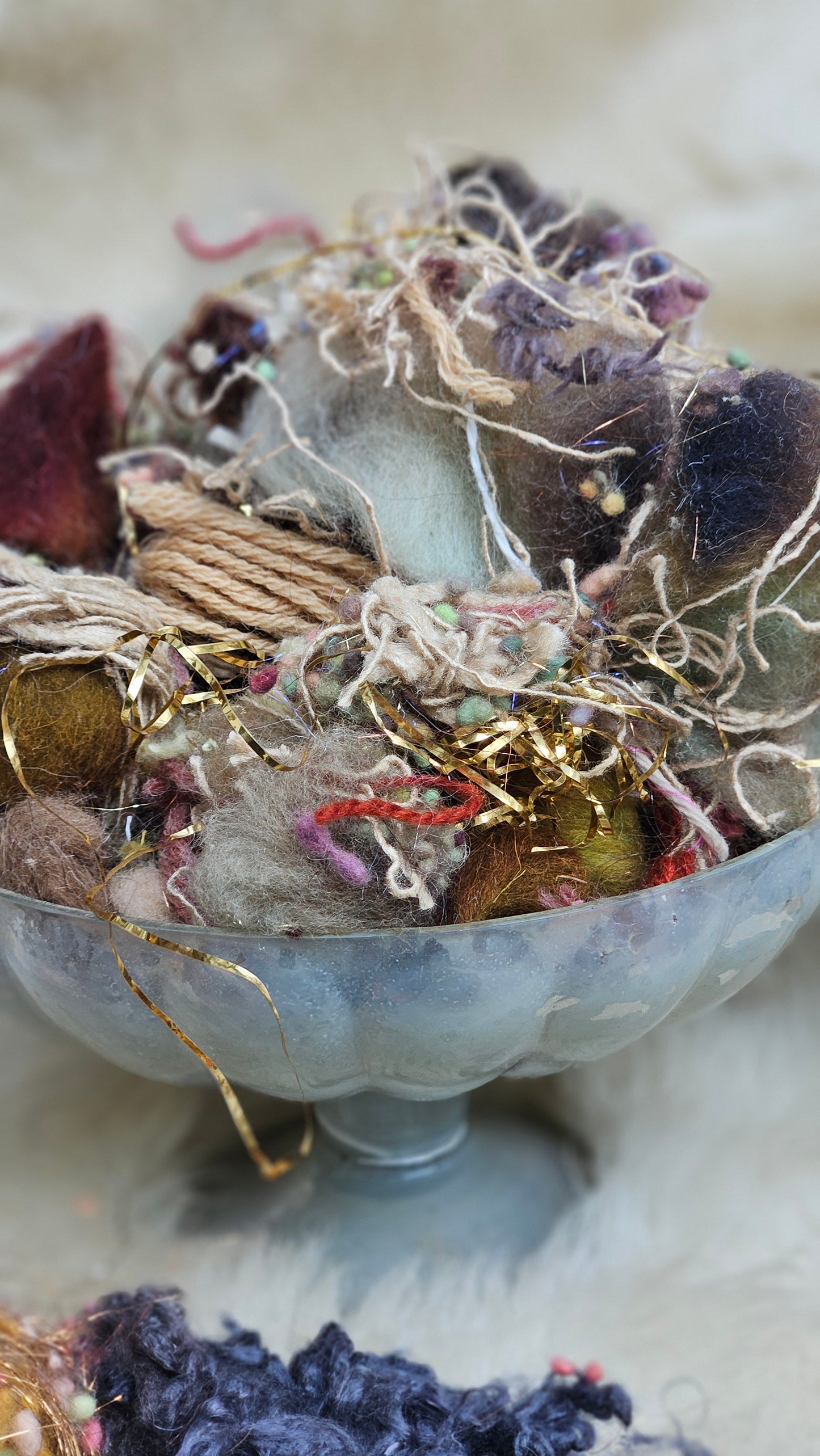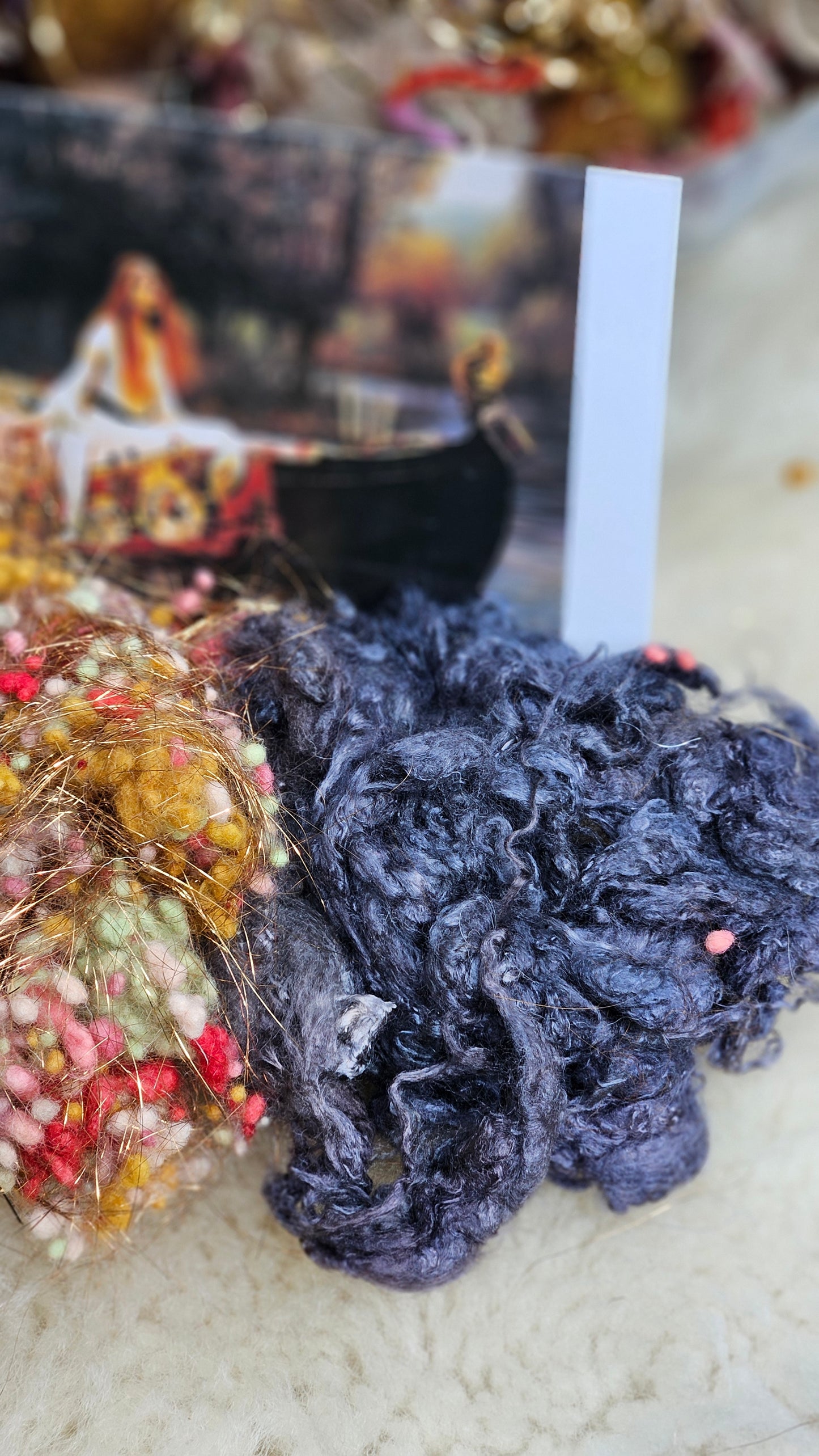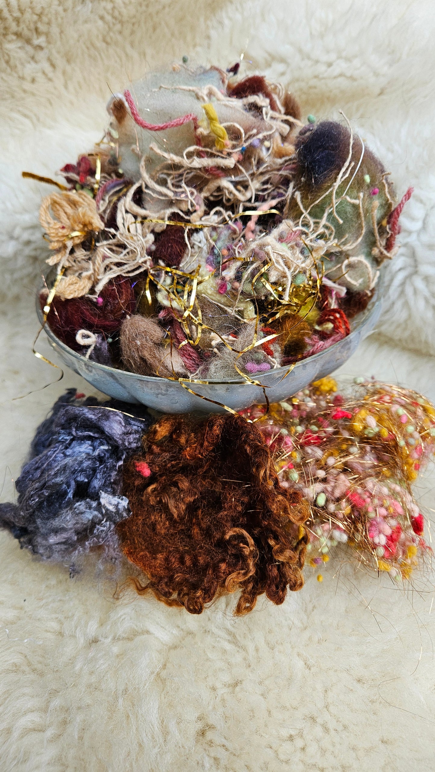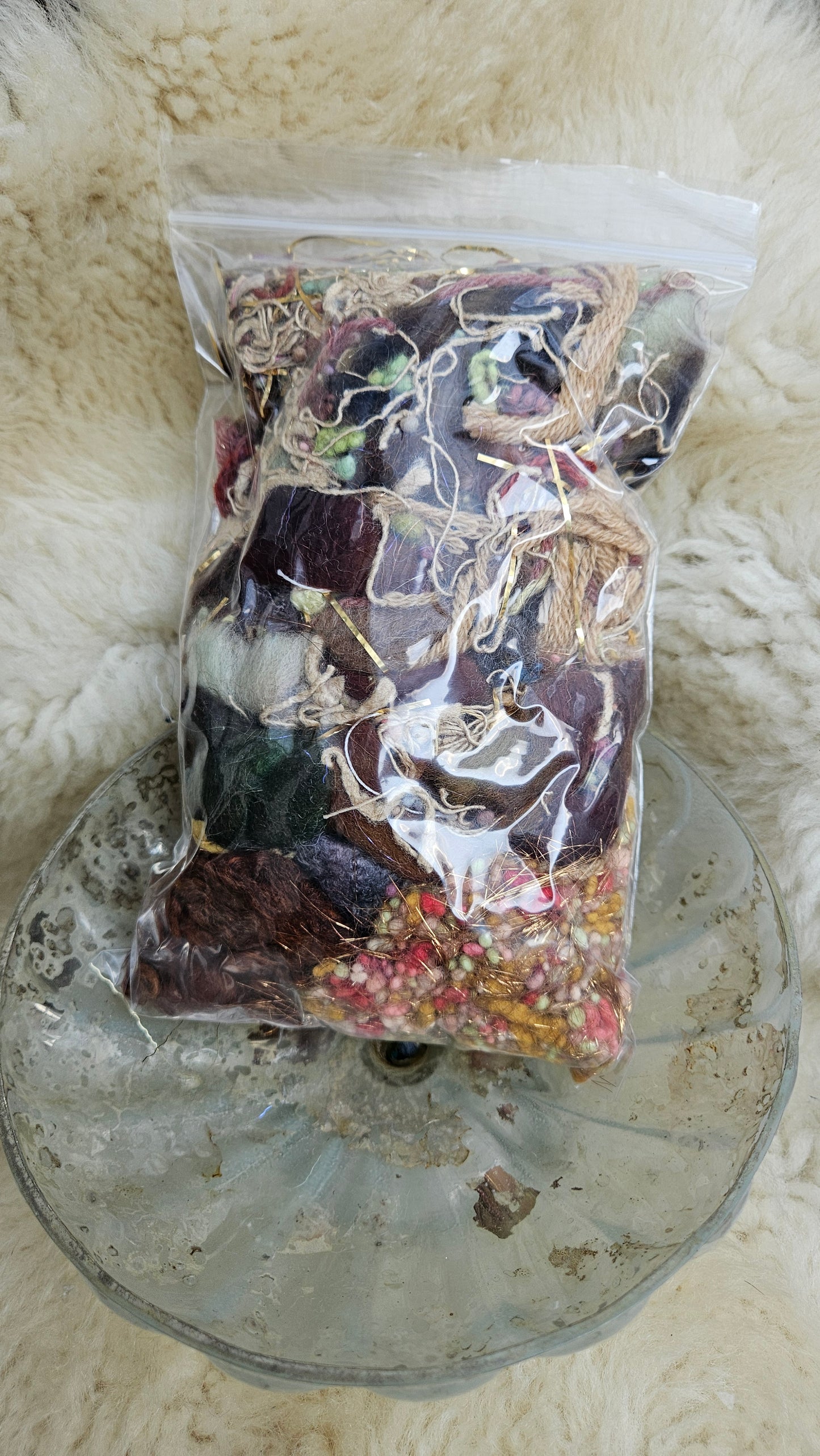 A 2.5 ounce kit of fine art inspired extra chunky wool texture and fiber for creating art batts, rolags, and blends to spin into yarn for knitting, weaving, crochet, felting, and fiber art. A little can go a long way! Each bag is subtly different due to the size of the texture and nuance in the dyed bits.